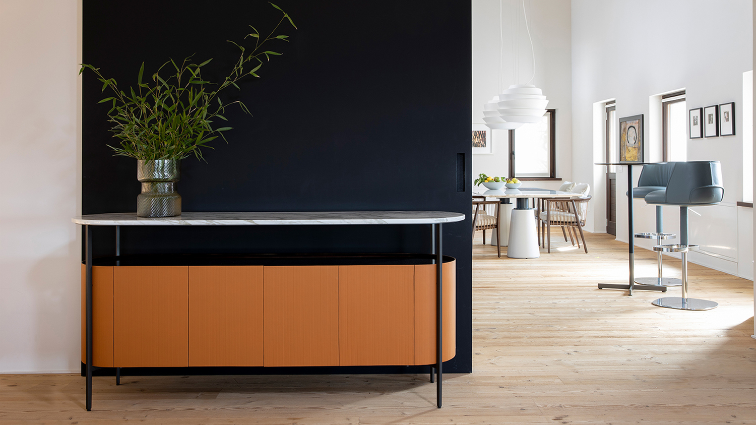 A game of solids and voids, an attentive study of materials and forms and a design approach which operates by subtraction until it achieves the perfect balance between simplicity and elegance. The Mi storage units designed by Neri & Hu for Poltrona Frau play around with light, shade and transparencies to conceal or reveal the objects they house. Mi is a Chinese pinyin word with a dual meaning used to express both the action of “looking” but also the word “secret”, which inspired this project. In fact, in the Mi storage units, rather than being displayed in full view the objects are hidden by the oblong external shell. You can only discover them by peeking through a layer of tempered glass which closes the space left by the shelves, raised and separated from the body of the unit.