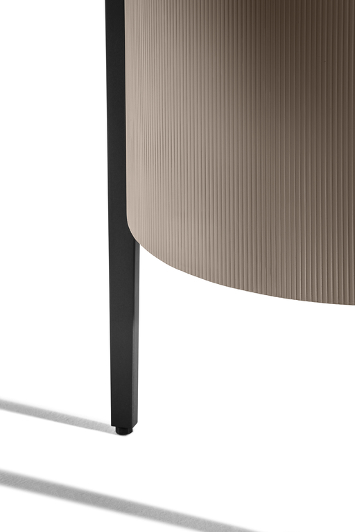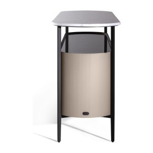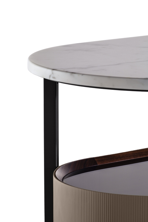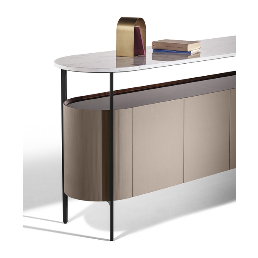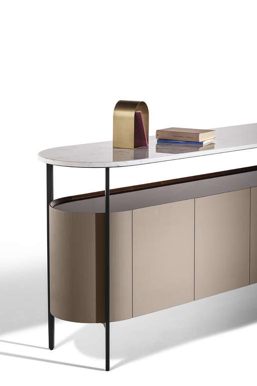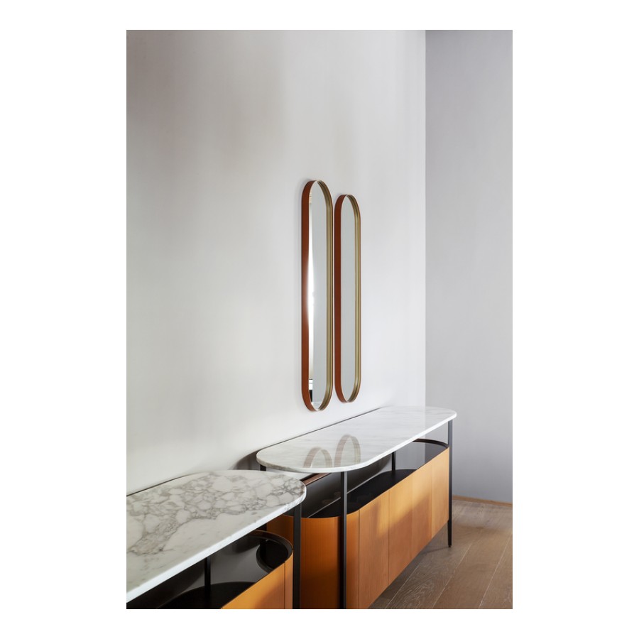 The external surface of the Mi storage units is upholstered in Saddle Extra leather, which is embellished with an original vertical striped canneté texture that gives the product a 3D effect. A thin but solid metal structure frames the body of the product and acts as a link with the raised top in Calacutta gold or Nero Marquinia marble.