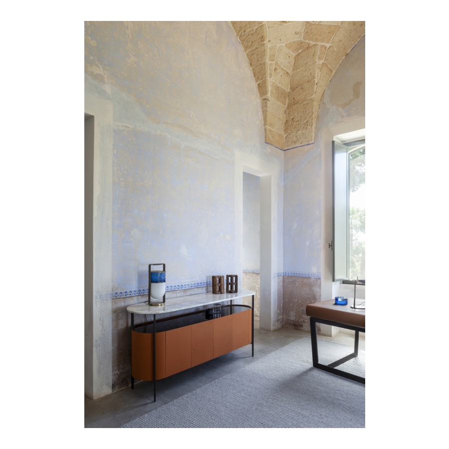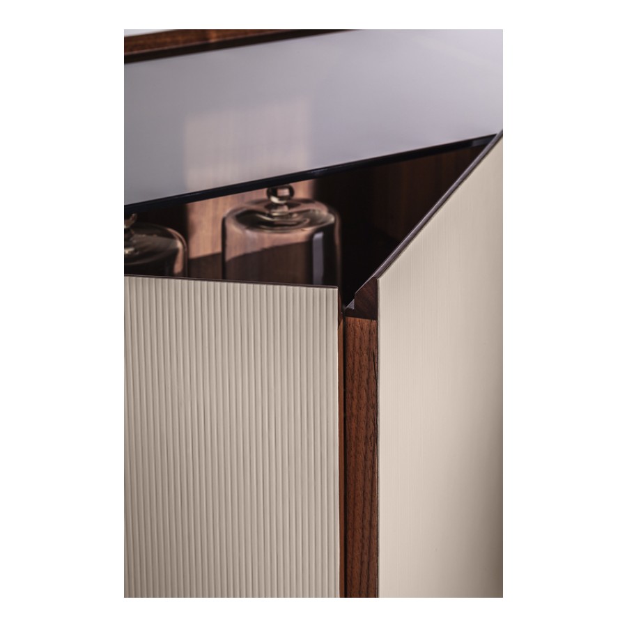 The structure of the Mi storage units consists of a metal frame with burnished brushed steel finish which also acts as the base. The sides of the units consist of curved panels in poplar plywood while the bottoms and backs are made from birch plywood. To make them even lighter, the doors are made from honeycomb panels. The insides and bottom of the units are veneered in Canaletto walnut. The upper frame of the cabinet and the doors are made from solid Canaletto walnut. Both the two-door and the low four-door Mi cabinets contain shelves made of tempered glass with bronze finish while the top surface, also in tempered glass with bronze finish, offers a glimpse of the inside, like a display cabinet. The Mi High Cabinet has two doors which can be opened. Meanwhile, in the Mi Low Cabinet the 4 doors can be opened two by two like a book. Magnets maintain the doors securely shut. The structure has adjustable feet. The frame of the Mi trolley is fitted with 4 black plastic and steel swivel castors. In the upper part of the trolley the frame finishes with a tube in burnished brushed steel which follows the shape of the product and acts as a handle. One side of the grip is covered with Cuoio Saddle Extra leather matching the upholstery of the trolley, with hand stitching. The internal space is fitted with a tempered glass shelf which can be set at 3 different heights.