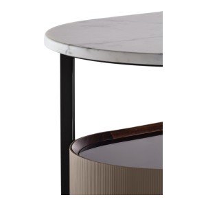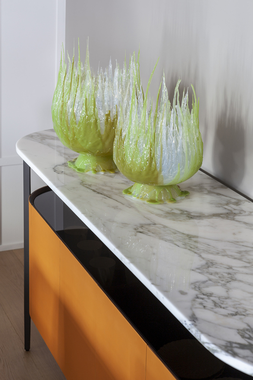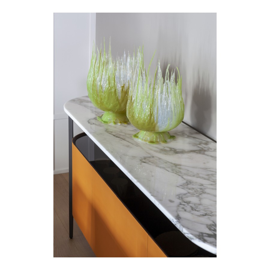 The top is raised from the wooden body and can be made from Calacatta gold marble or Nero Marquinia marble. Both are available with a glossy finish to which a transparent polyester paint is applied to increase its surface resistance, or a semi-glossy finish for a more natural result.