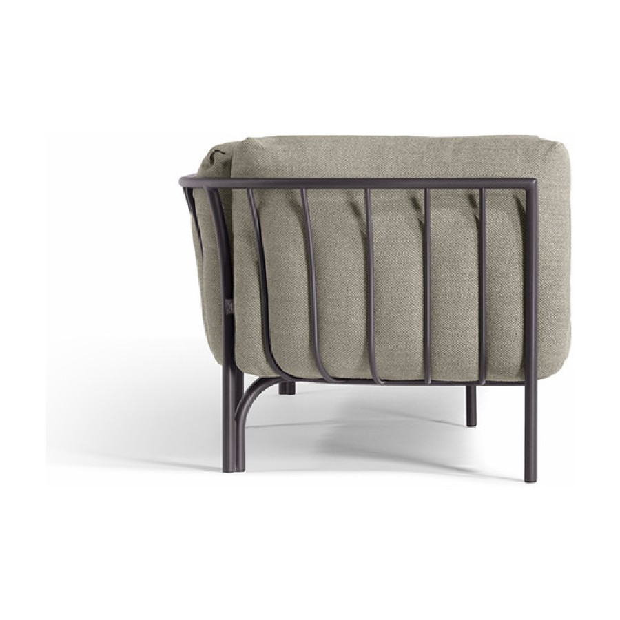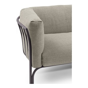 The Mirabell outdoor sofa features a powder-coated aluminum frame with an embossed finish. The aluminum frame is especially lightweight, making it easy to move around the outdoor space. Thin metal elements, thicker on the armrests and more spaced on the backrest, give the sofa a rhythmic profile. The seat, back and armrest cushions are attached to the frame with straps, allowing for easy positioning and removal. The seat cushions are made of draining material, with a black polyester non-slip (and non-visible) cloth at the bottom. The back and armrest cushions are padded with staple fiber, which simulates down, and feature a water-repellent polyester lining. The cushion covering is fully removable and available in Pelle Frau® Outdoor Leather or Outdoor Fabric. The sofa is available in various sizes and can be completed with optional cushions in the same covering.