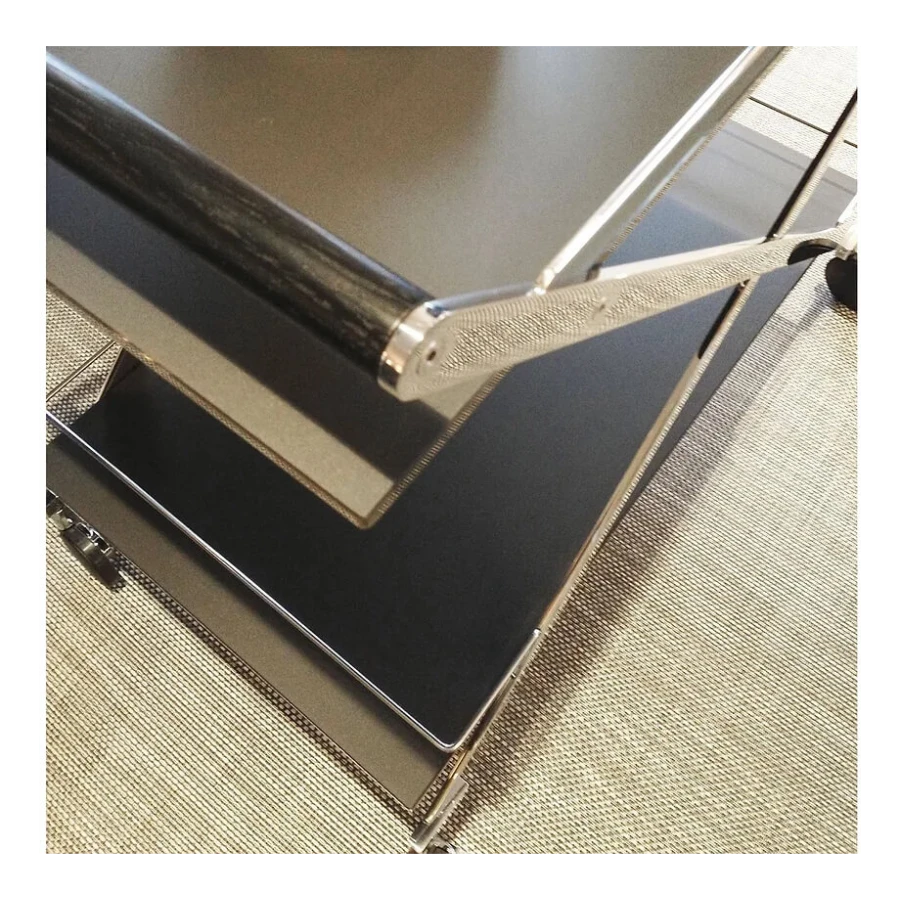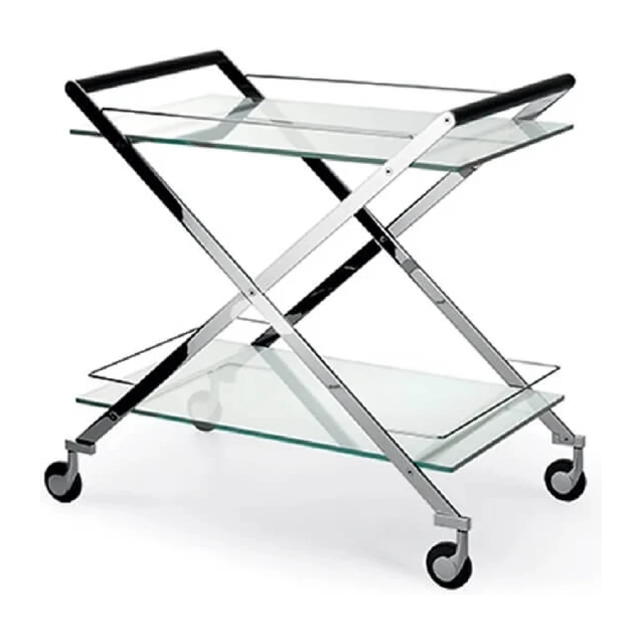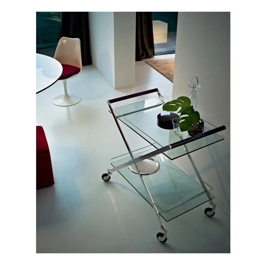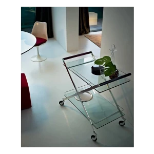 Trolley in 10mm transparent glass. Painted glass as per samples in the bright or satin version on request. Bright or satin stainless steel metal parts. Handles in whitened oak, wengé stained, tobacco stained or black stained. Available versions “total color” in opaque white, grey and black with satin painted glass tops.