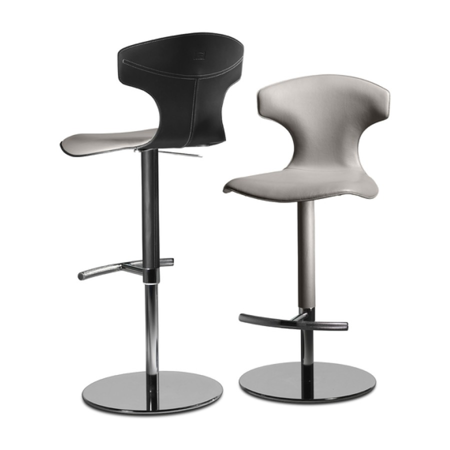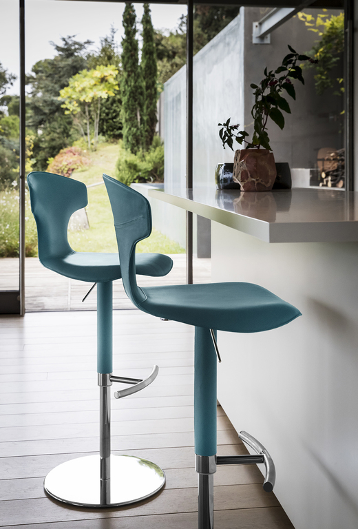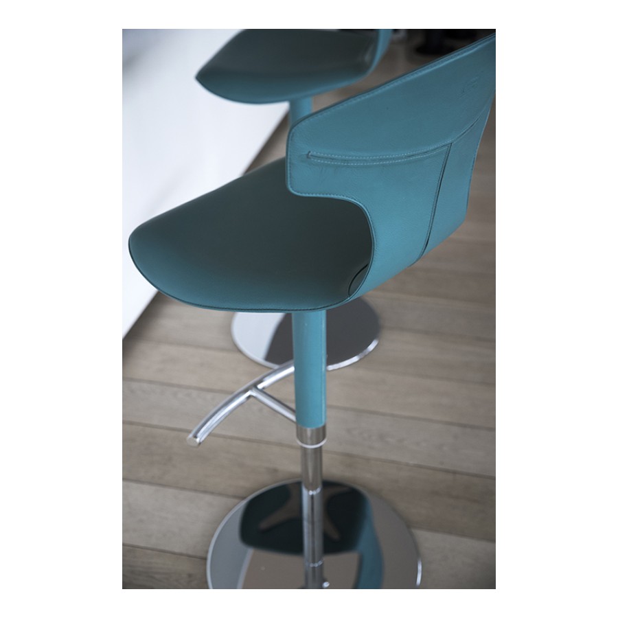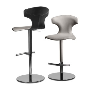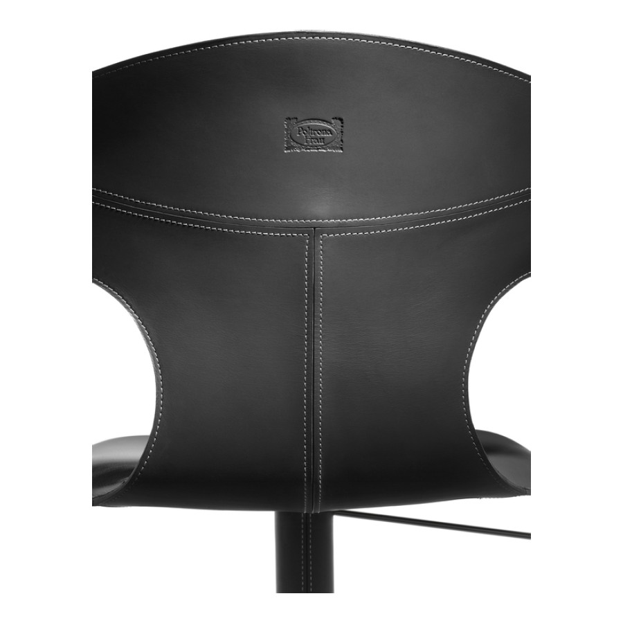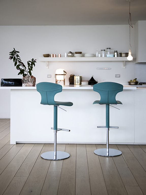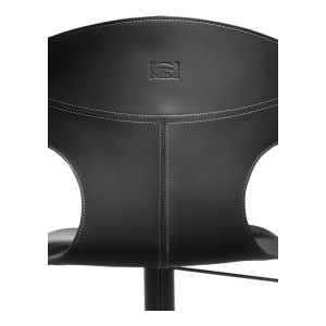The shell of the Montera stools is produced from moulded steam-curved and -pressed beech plywood with padding in polyurethane foam. The base is in wenge- or moka-stained solid ash wood. The stools have plastic caps and a little piece of sheet metal with gunmetal grey finish to protect the top of the footrest. The Montera column stool can be rotated 360° and its height can be adjusted thanks to a gas spring controlled by a chrome steel lever positioned underneath the seat. The base, in chrome steel, is made up of a four-bracket cross plate, a column, a footrest and a round plate. The cross plate, with black nylon spacers, fixes the shell to the base. The tubular footrest has a distinctive knurled finish with diamond motif. The upper part of the column (above the footrest) is upholstered with Cuoio Saddle Extra leather or Pelle Frau® leather to match the upholstery of the shell.