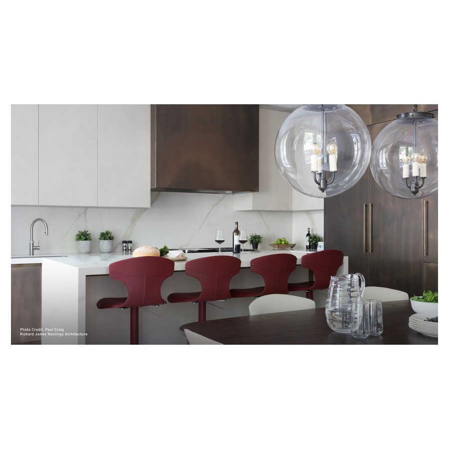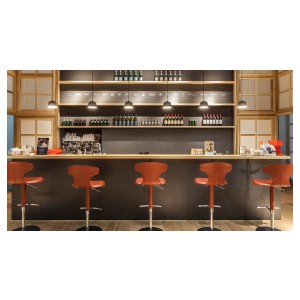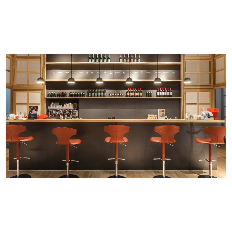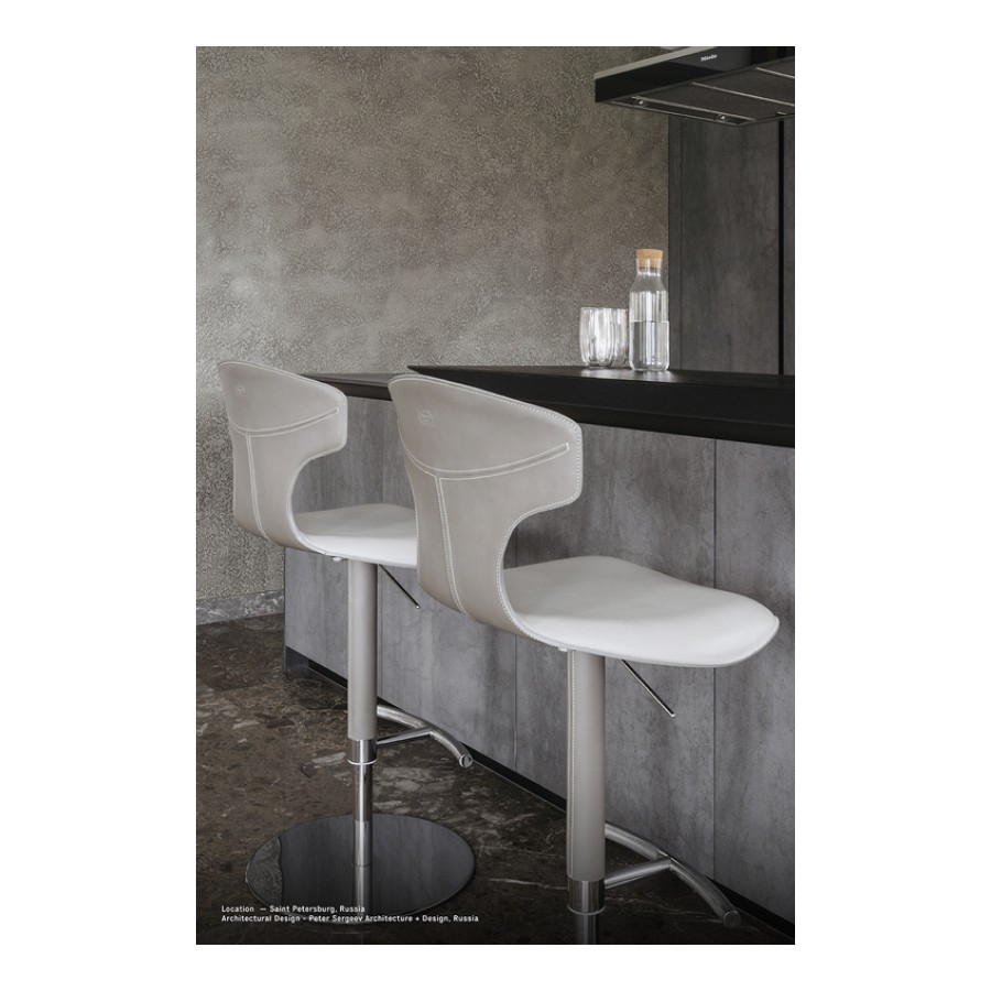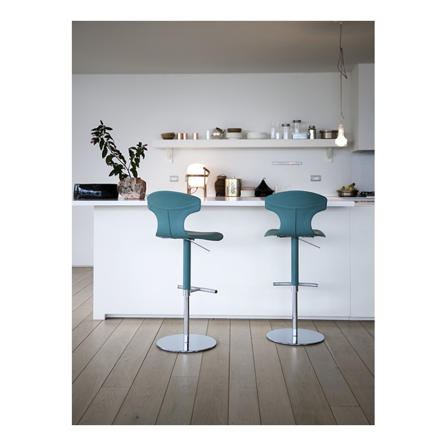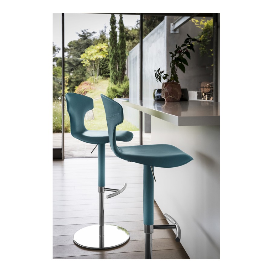 The shell of the Montera stools is produced from moulded steam-curved and -pressed beech plywood with padding in polyurethane foam. The base is in wenge- or moka-stained solid ash wood. The stools have plastic caps and a little piece of sheet metal with gunmetal grey finish to protect the top of the footrest. The Montera column stool can be rotated 360° and its height can be adjusted thanks to a gas spring controlled by a chrome steel lever positioned underneath the seat. The base, in chrome steel, is made up of a four-bracket cross plate, a column, a footrest and a round plate. The cross plate, with black nylon spacers, fixes the shell to the base. The tubular footrest has a distinctive knurled finish with diamond motif. The upper part of the column (above the footrest) is upholstered with Cuoio Saddle Extra leather or Pelle Frau® leather to match the upholstery of the shell.