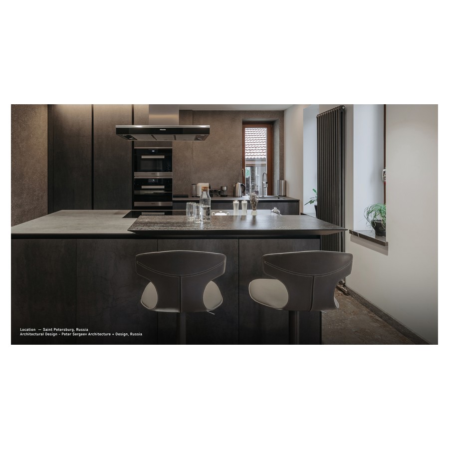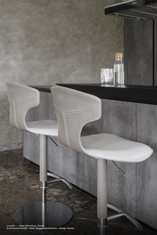 In the Montera stool the legs are raised and stand out for their cross-like structure and the gunmetal grey metal footrest at the front. The backrest is smaller, maintaining its characteristic curved shape. The same materials and finishes are employed: Pelle Frau® leather and Cuoio Saddle Extra leather, stitched together with raw-edge seam, complement each other perfectly. A version entirely upholstered in Pelle Frau® leather is also available. In this case the stitching has tone-on-tone thread.