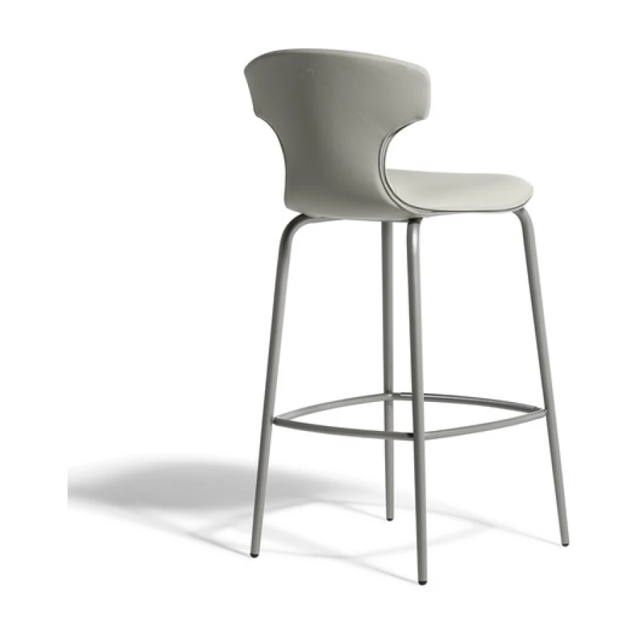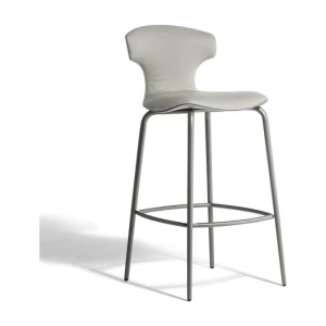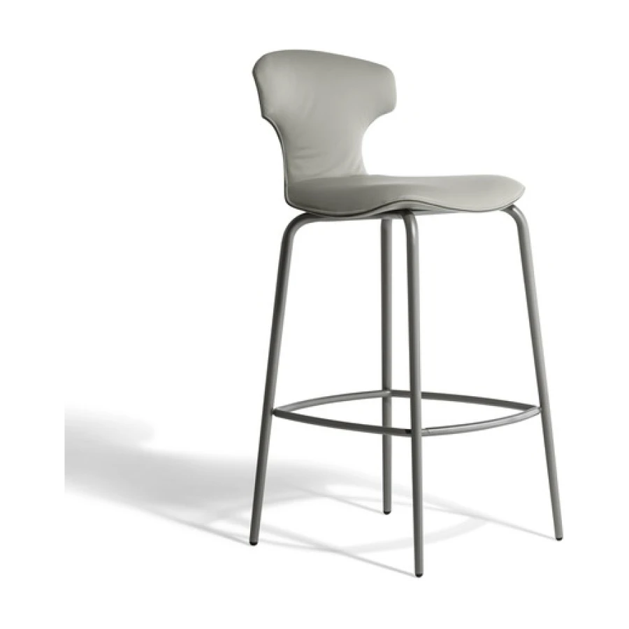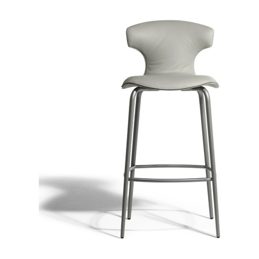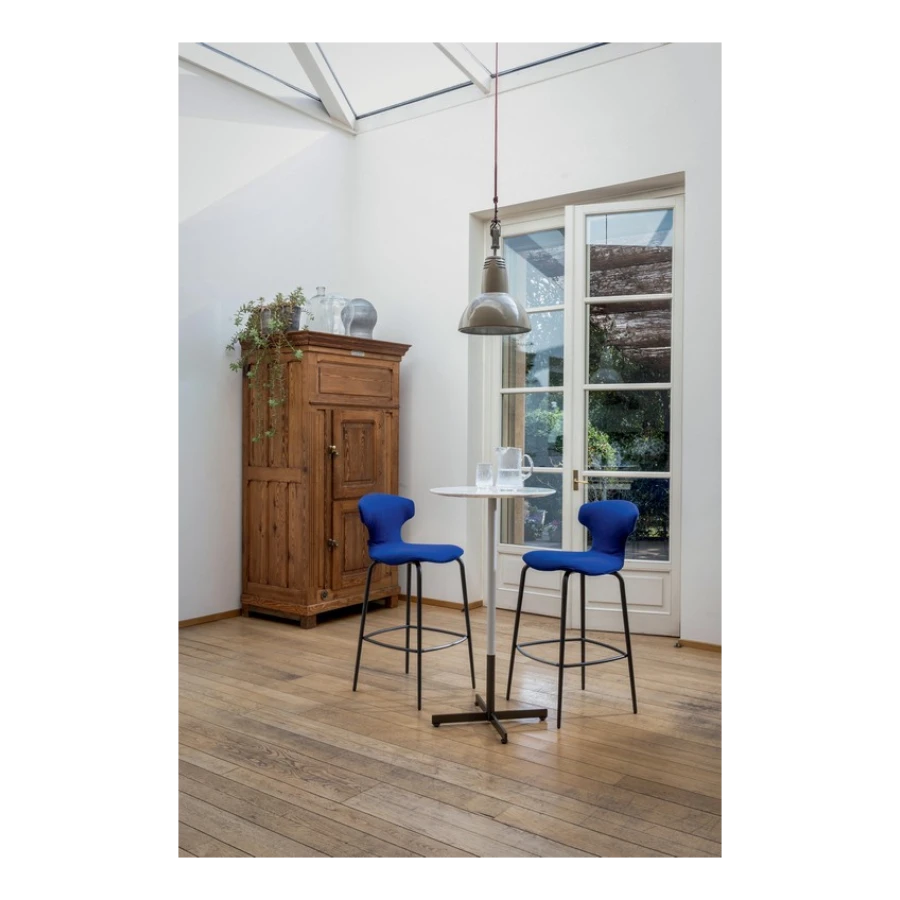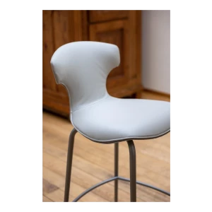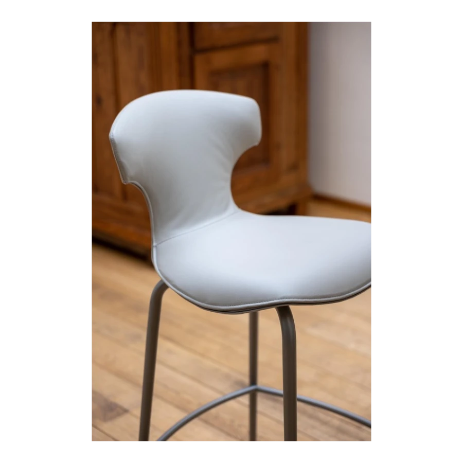 The Montera Mas stool, upholstered in Pelle Frau® leather or removable fabric, is available in two heights and is marked by the softness of the seat, made of polyurethane foam. The metal base is composed of tubular steel legs, available in multiple finishes. The legs are connected by a footrest ring in the same finish as the base and equipped with a brushed stainless steel scratch guard plate.