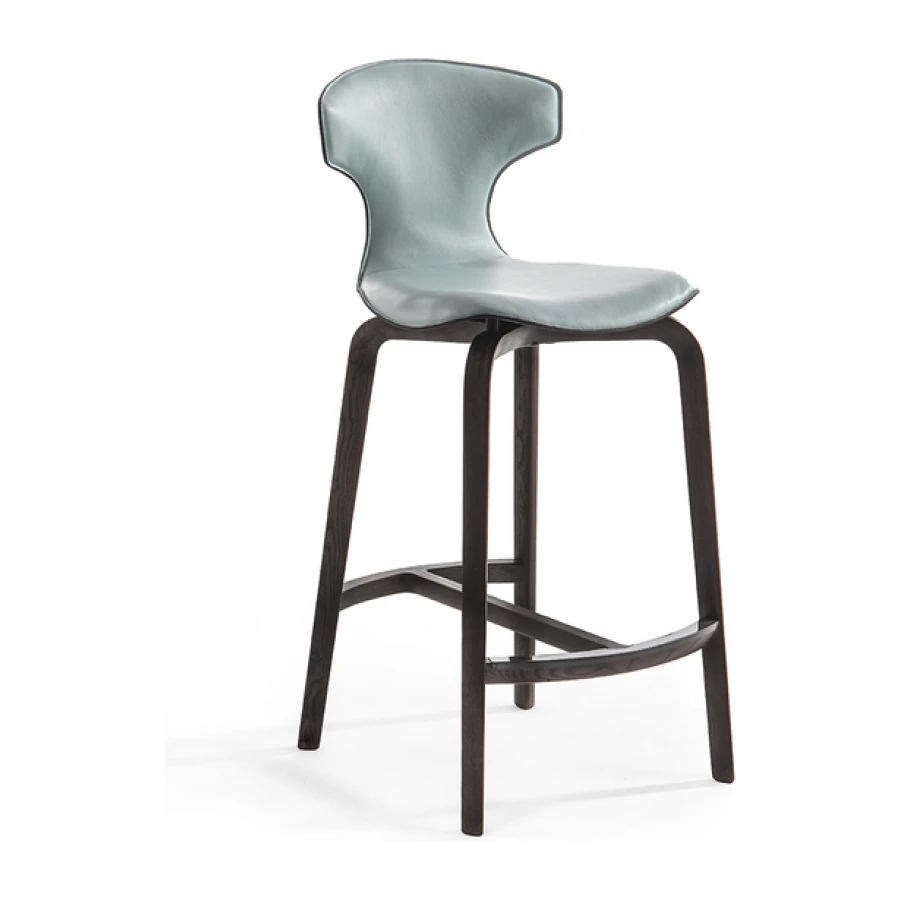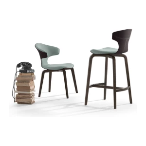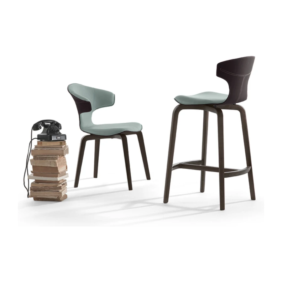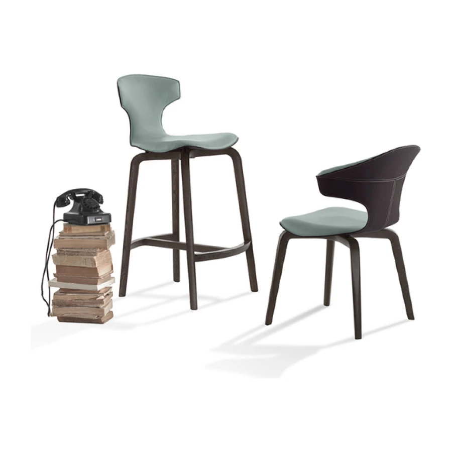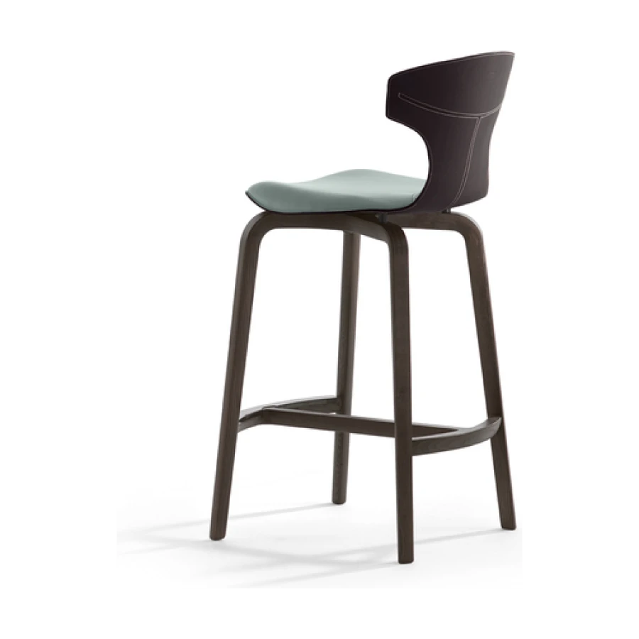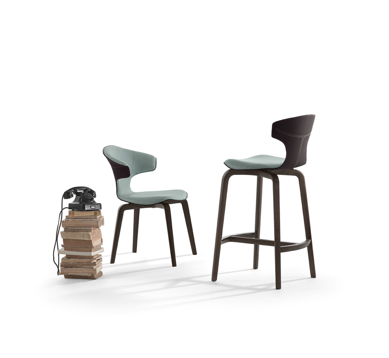 The shell of the Montera stools is produced from moulded steam-curved and -pressed beech plywood with padding in polyurethane foam. The base is in wenge- or moka-stained solid ash wood. The stools have plastic caps and a little piece of sheet metal with gunmetal grey finish to protect the top of the footrest. The Montera column stool can be rotated 360° and its height can be adjusted thanks to a gas spring controlled by a chrome steel lever positioned underneath the seat. The base, in chrome steel, is made up of a four-bracket cross plate, a column, a footrest and a round plate. The cross plate, with black nylon spacers, fixes the shell to the base. The tubular footrest has a distinctive knurled finish with diamond motif. The upper part of the column (above the footrest) is upholstered with Cuoio Saddle Extra leather or Pelle Frau® leather to match the upholstery of the shell.