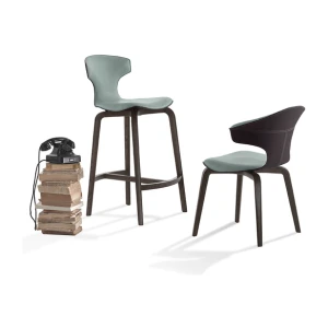 The Montera series designed by Roberto Lazzeroni has a formal lightness that expresses the sensory charm of its materials: the raw cut processing exalts the tactility of the saddle-leather and leather which, combined together, complement each other perfectly; the light stitching on the backrest forms a smile. Montera is a chair, an armchair, a stool of two different heights, a column stool and a stackable chair.