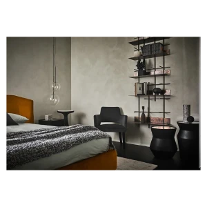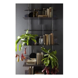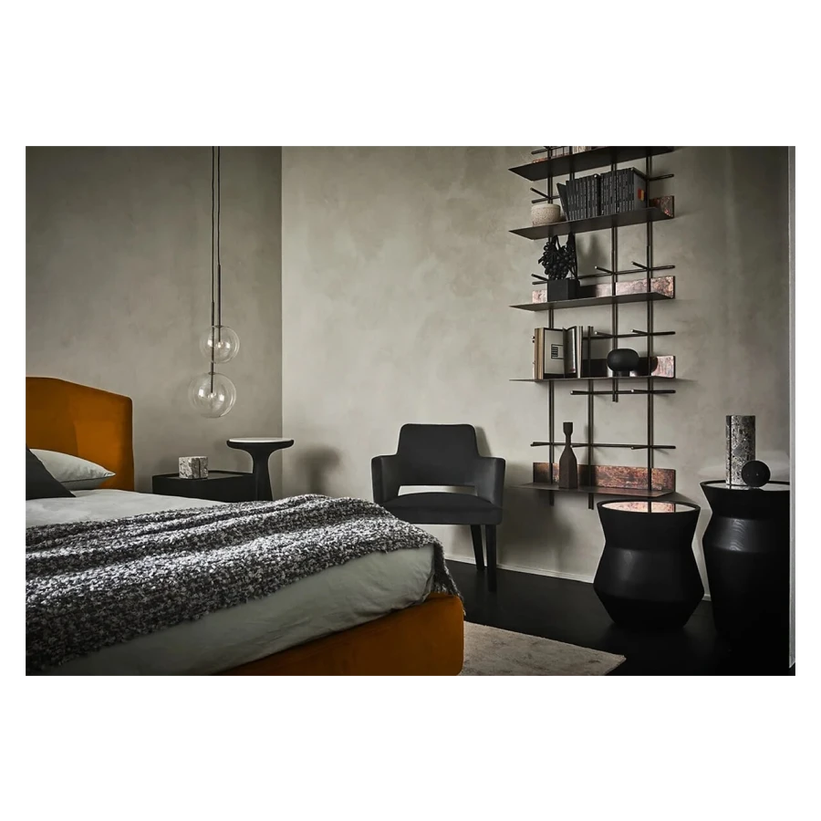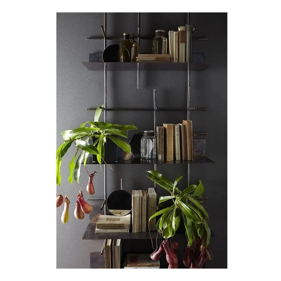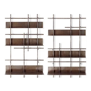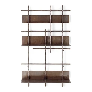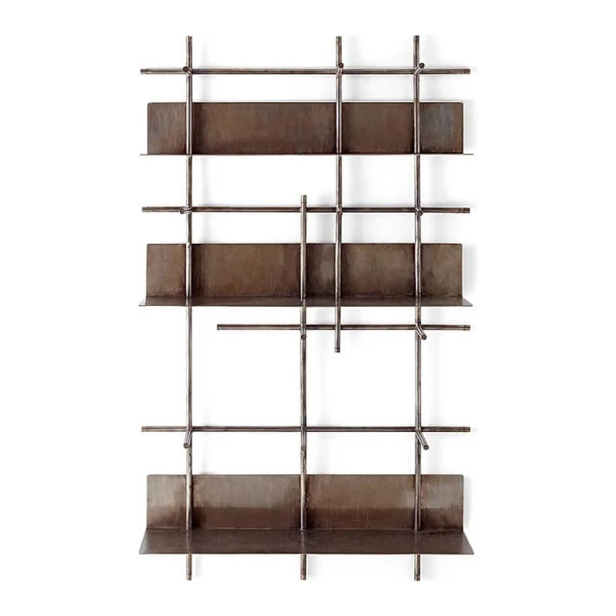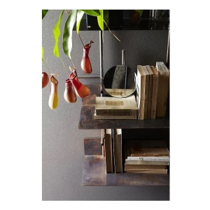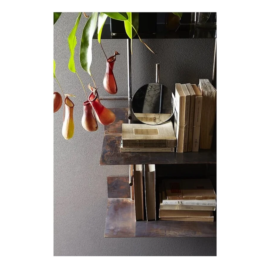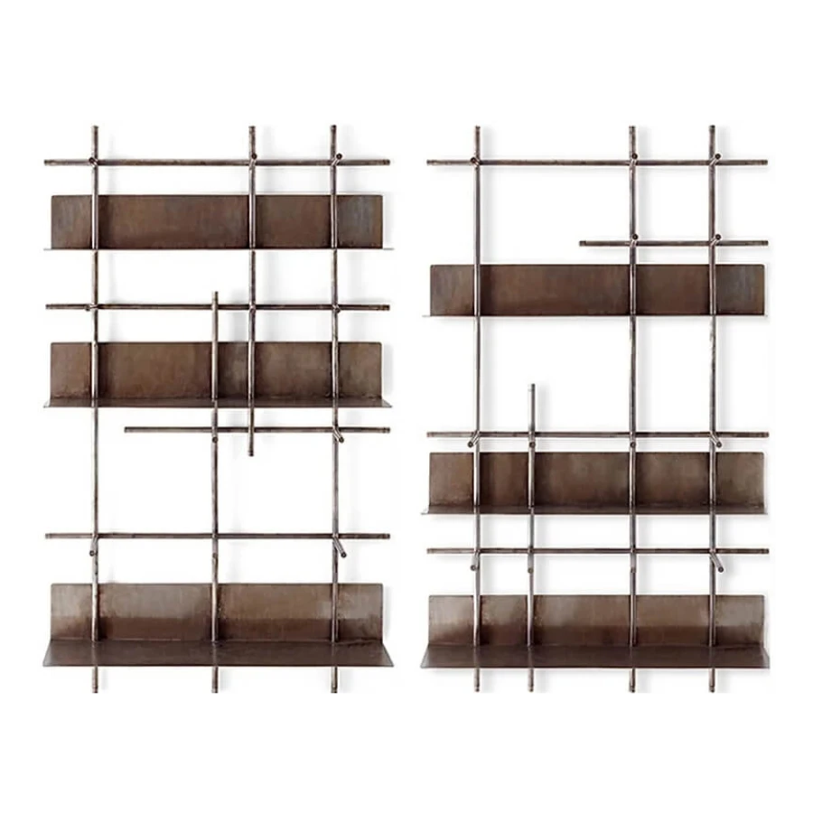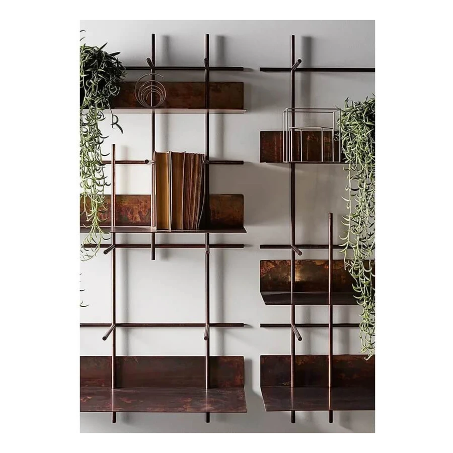 Wall shelving system with hand burnished copper structure and shelves. The hand burnished copper finish looks naturally spotted and irregular. Due to this craftmade processing, each product is unique and exclusive. Available in two versions A and B.