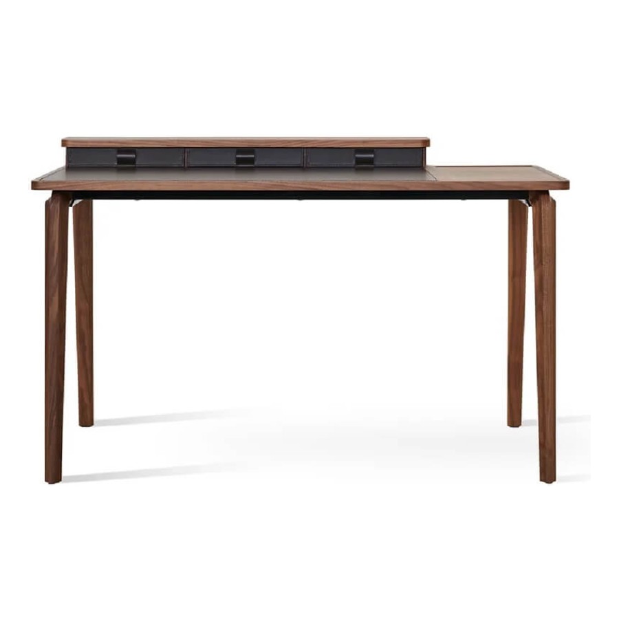 The top, positioned asymmetrically on the structure, has two trays carved into its wood surface, and the central tray is covered in saddle leather. The wood on the rear is made with a pronounced curved shape that allows it to hold small drawers, which are also covered in saddle leather. The legs are made with a complex three-dimensional woodworking technique in which grooves are carved into three sides of the piece. The resulting product shows a good balance of essential style and elegance, simultaneously modern and linear while also refined and rich in expert cabinet-making details.