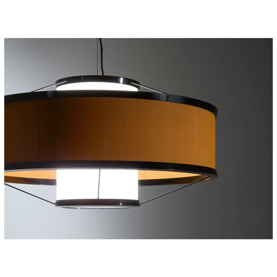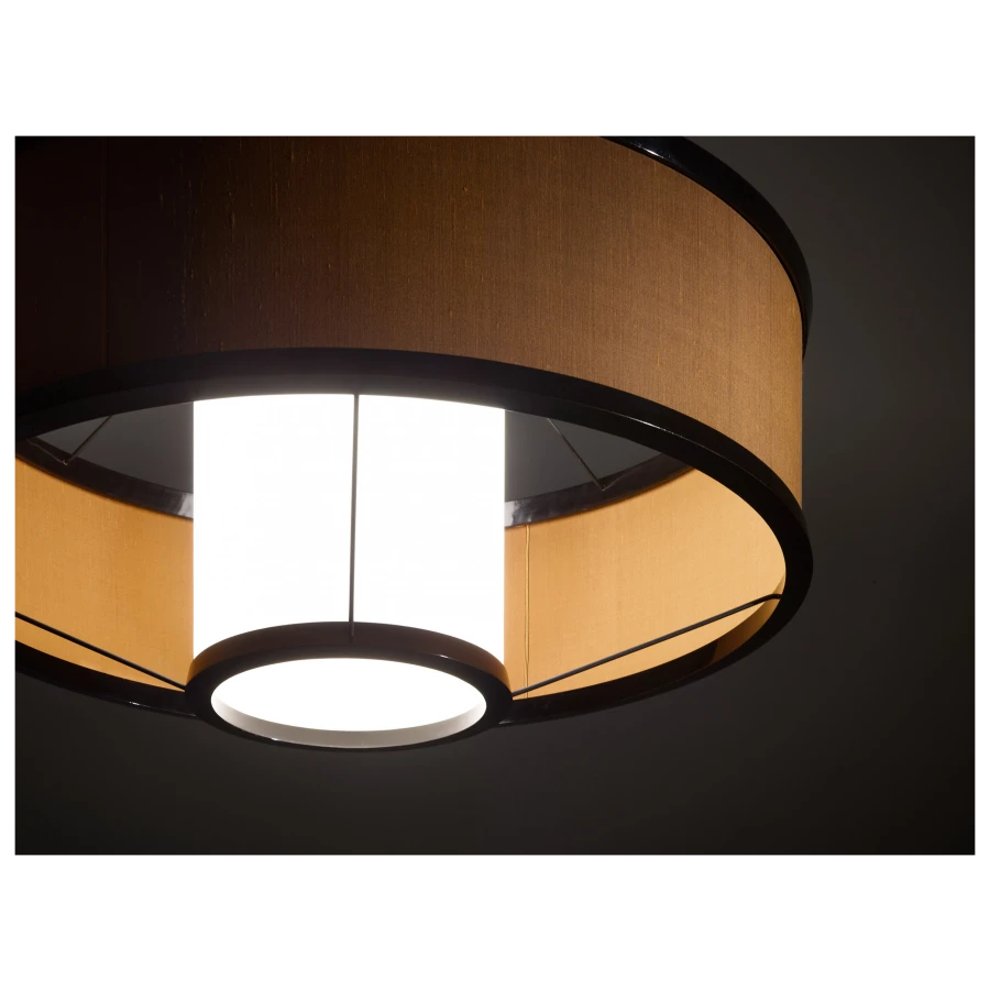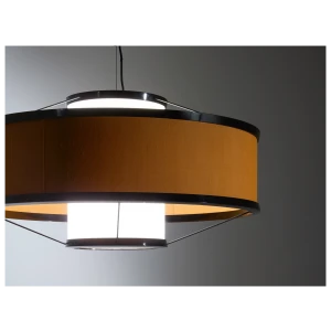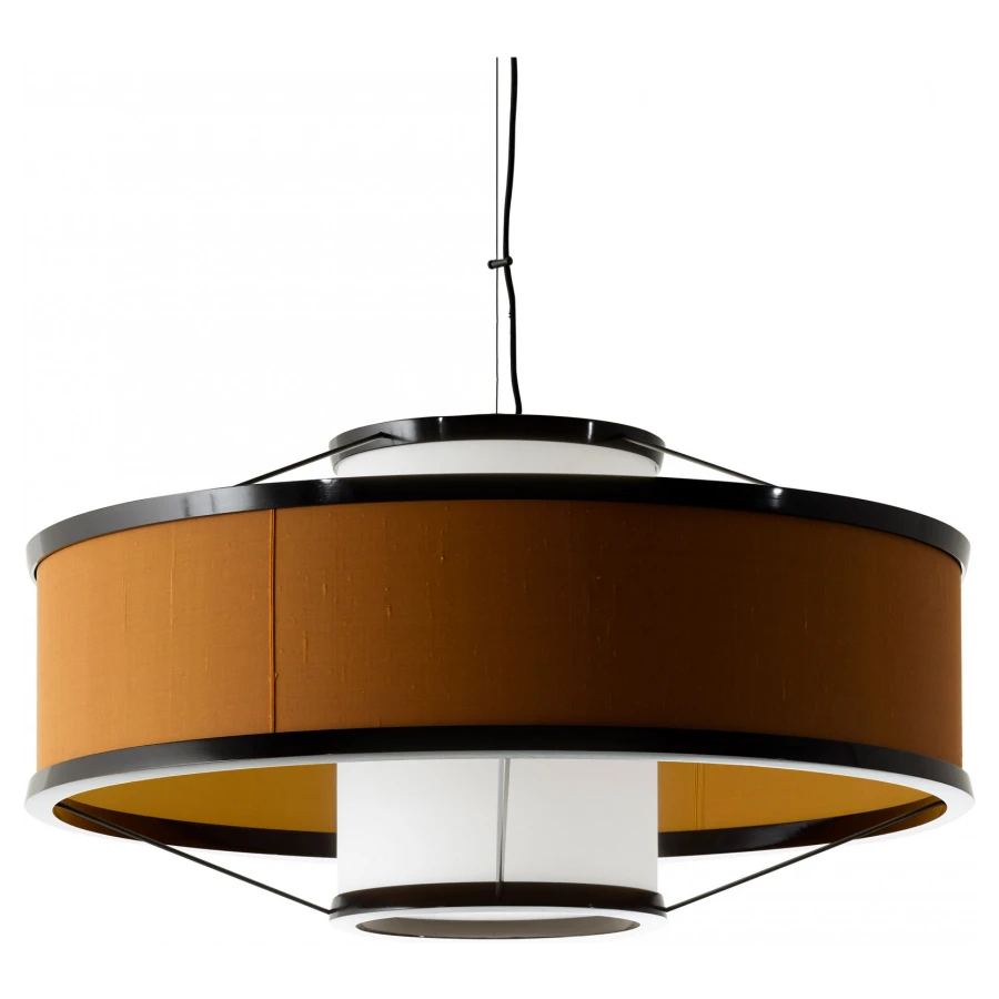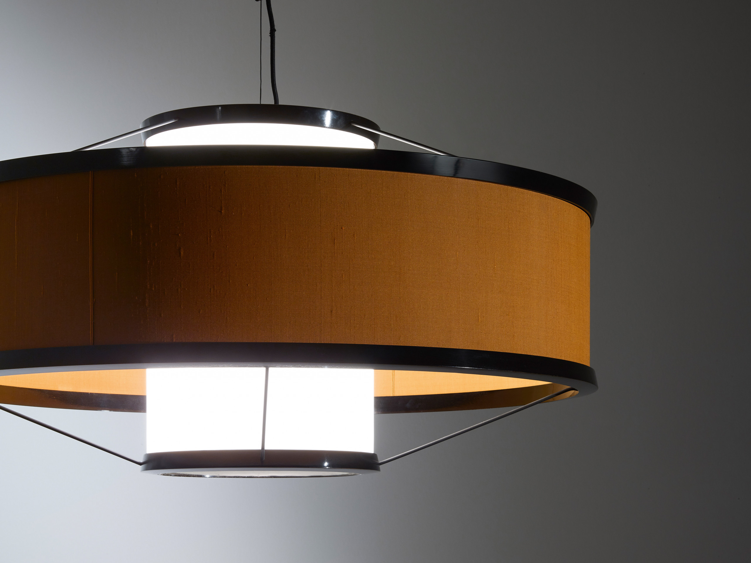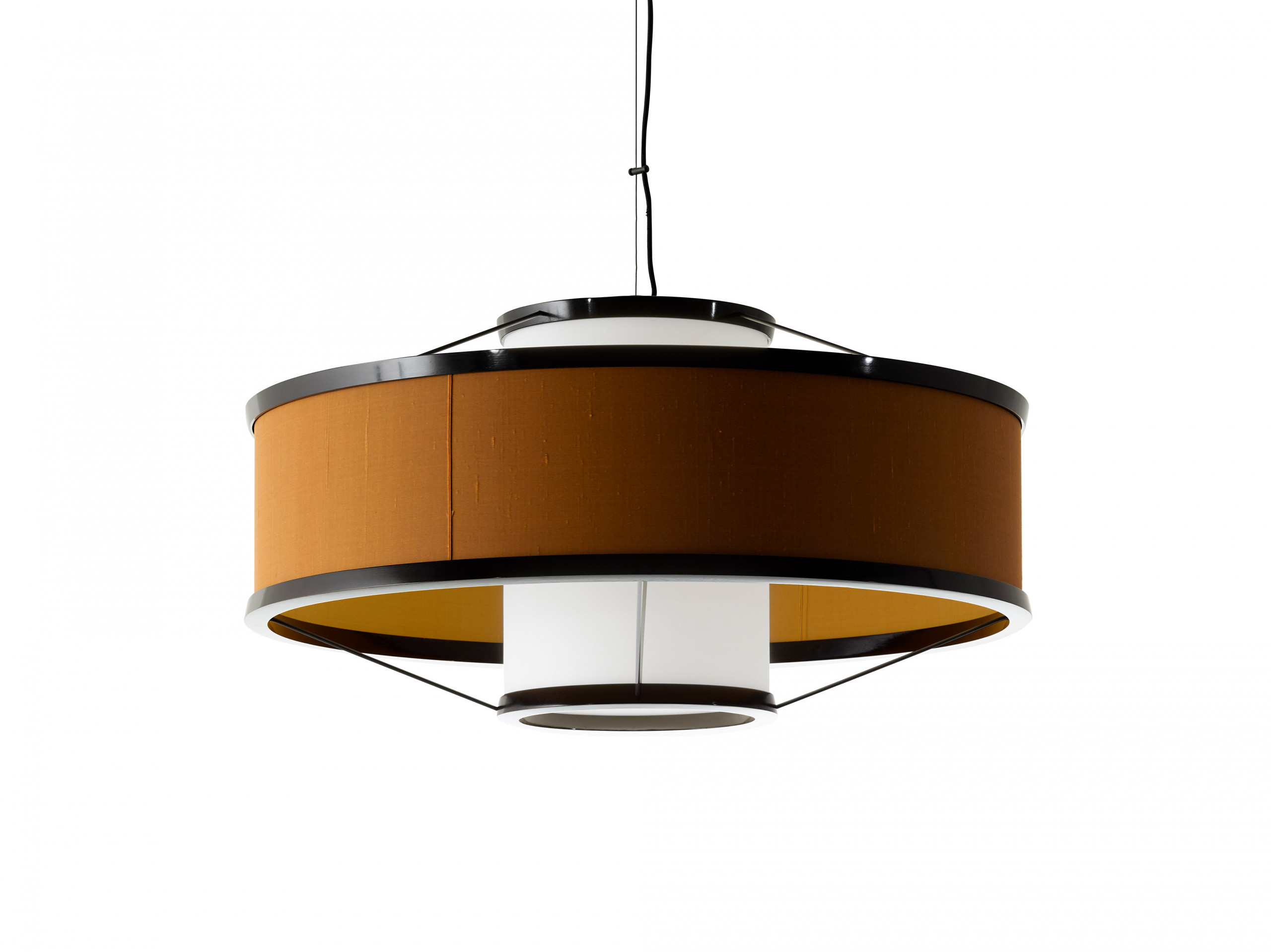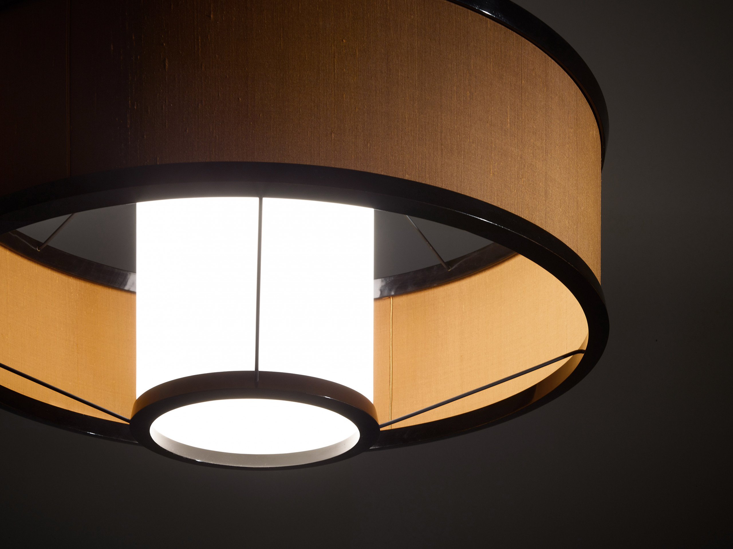 Other than its large size, this chandelier also stands out due to its mix of materials: the lantern at the centre is made of white opal glass, the two external rings are made of American walnut, the lampshade is covered in silk and the rods that link it in the centre are crafted from burnished bronze.