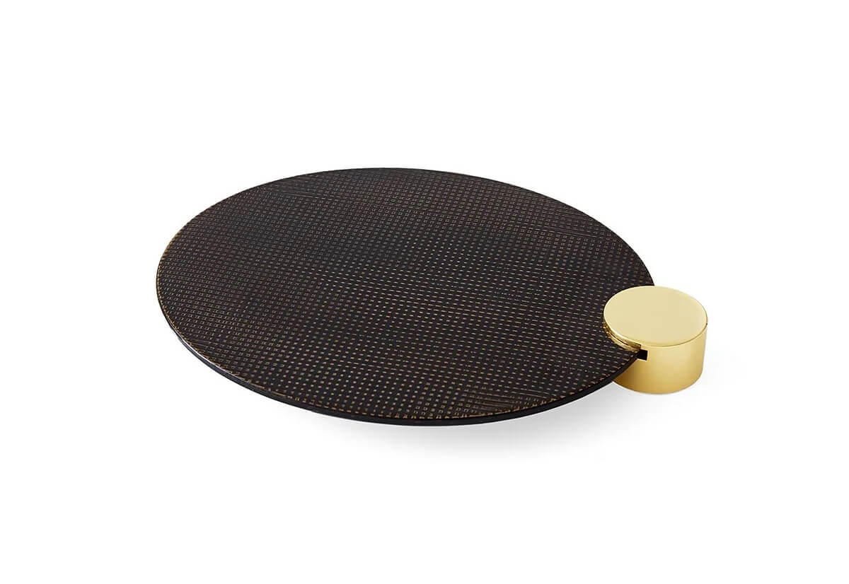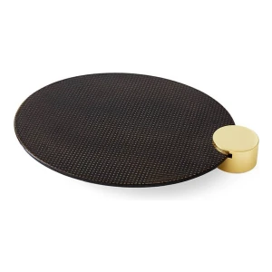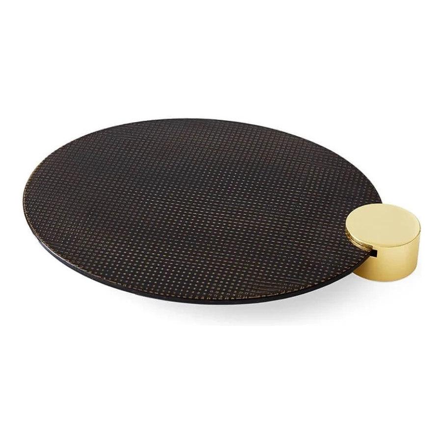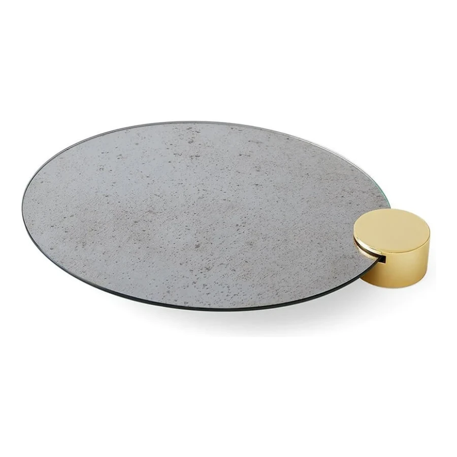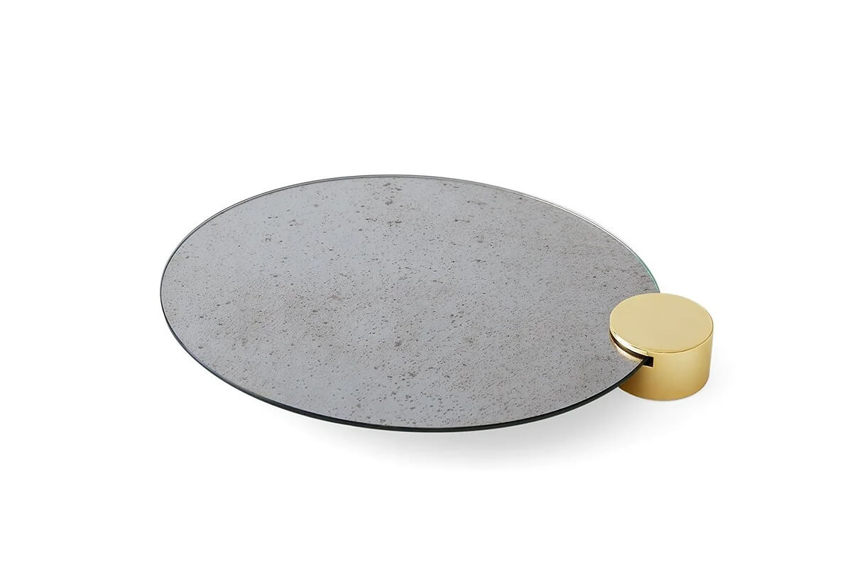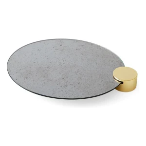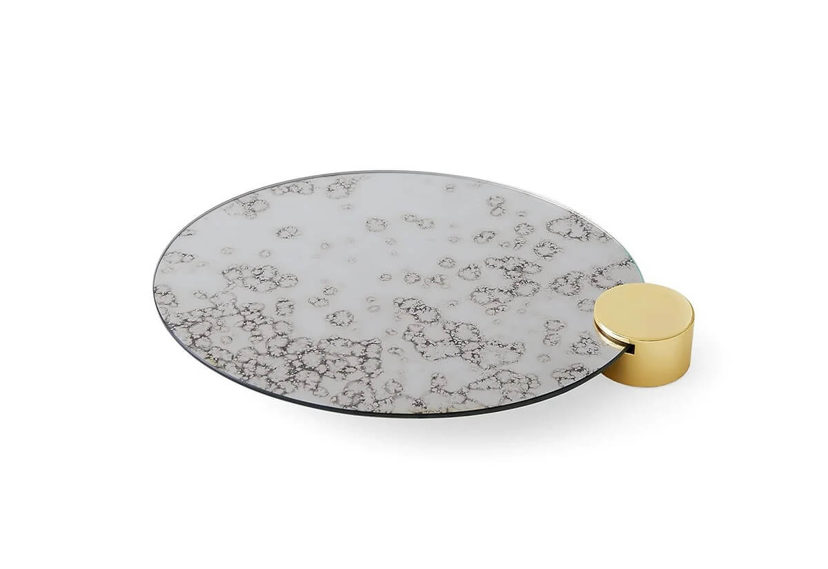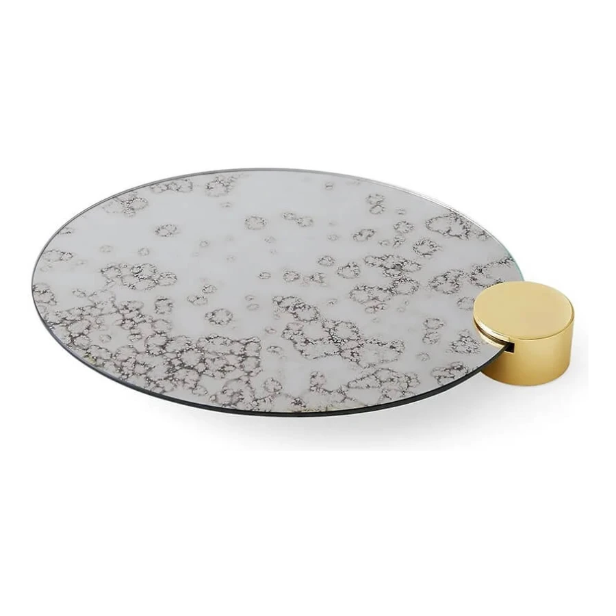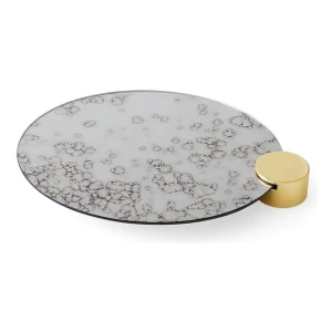Tray in antiqued mirror or decorated glass. Brassed metal support.
