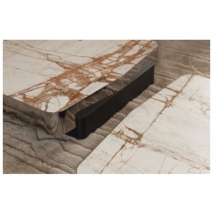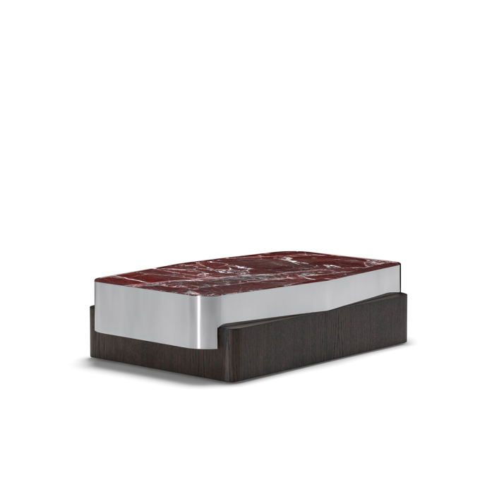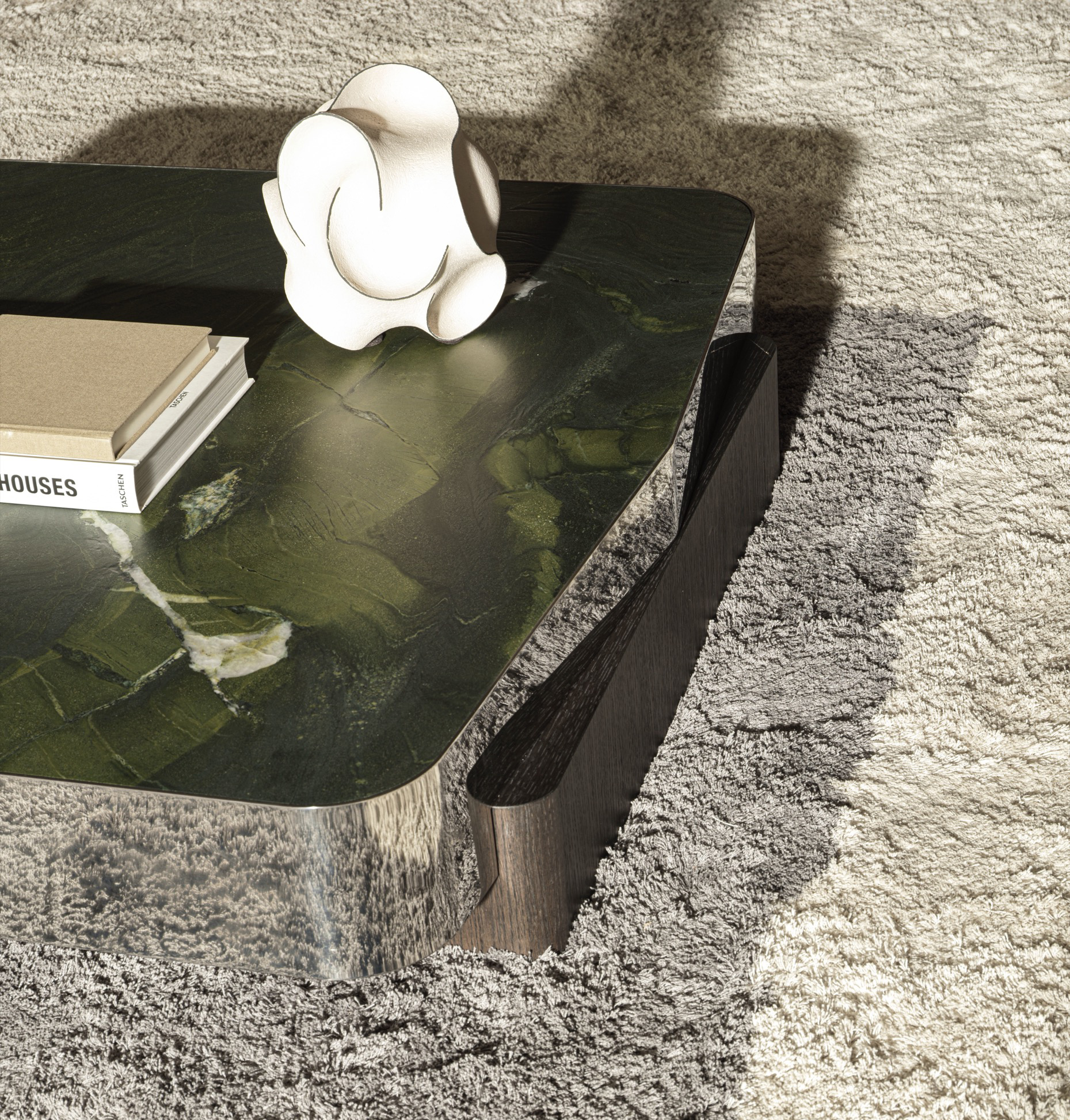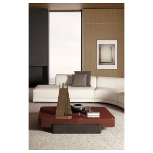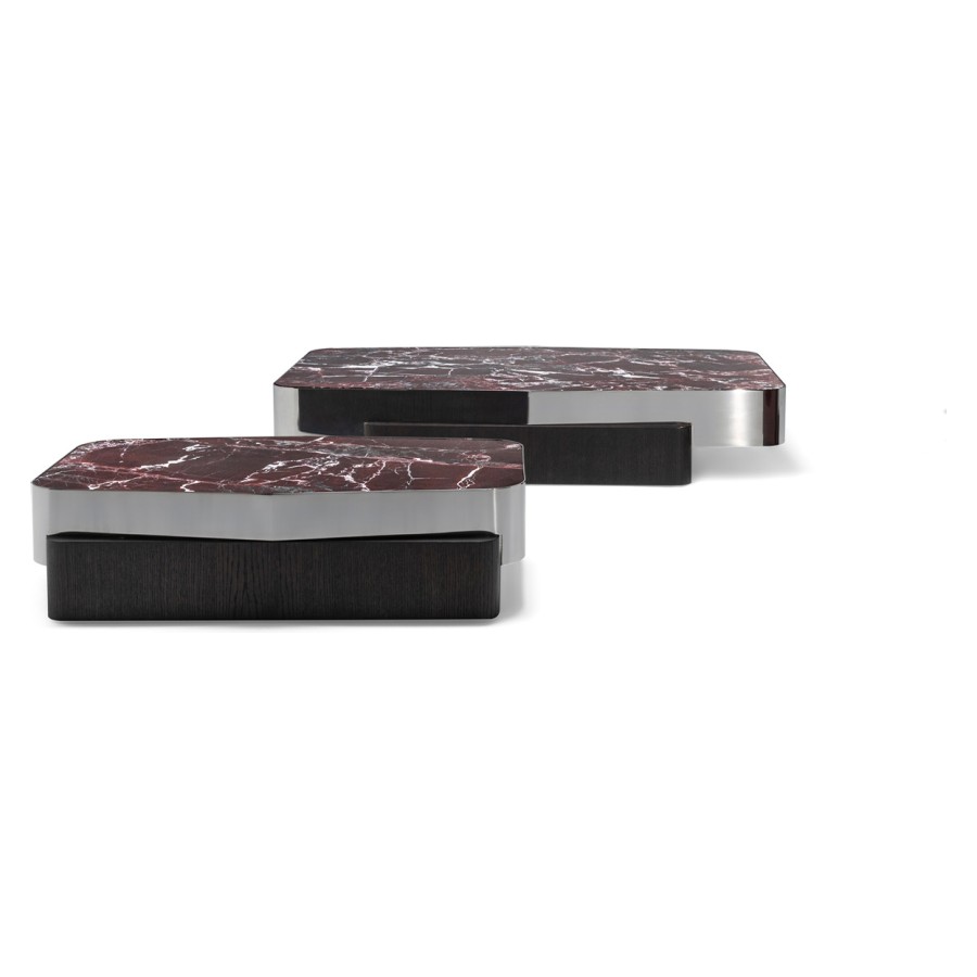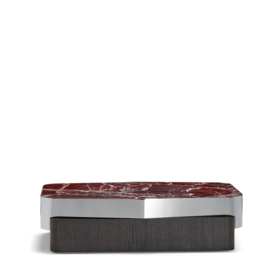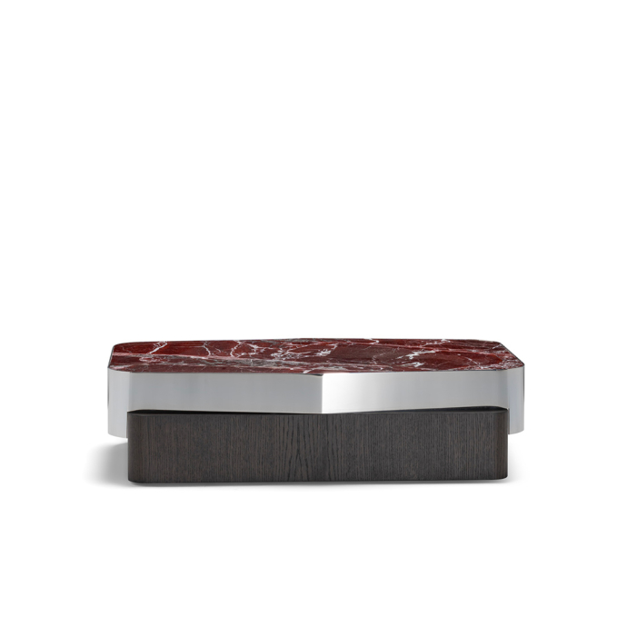 Its hexagonal top is available in high-gloss lacquer or marble, framed by a glossy steel edge that adds a touch of refinement. The base, in rich coffee oak or black oak finishes, provides a grounding contrast to the sleek top.