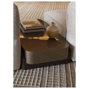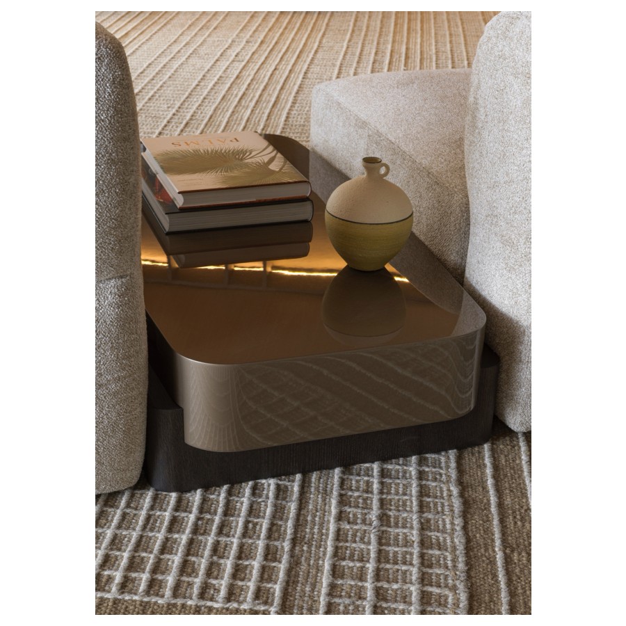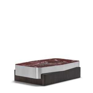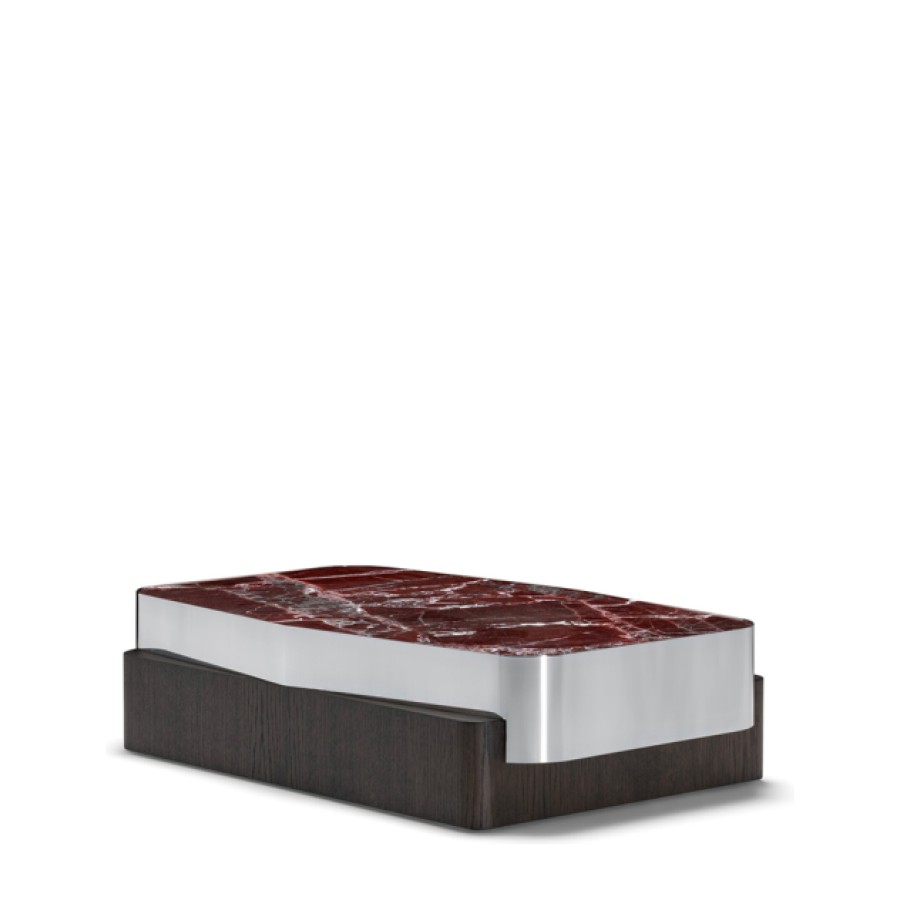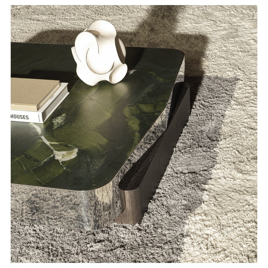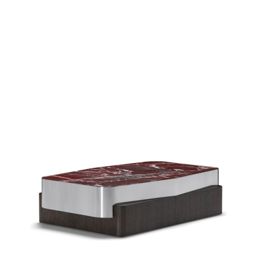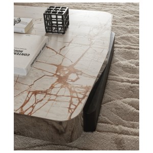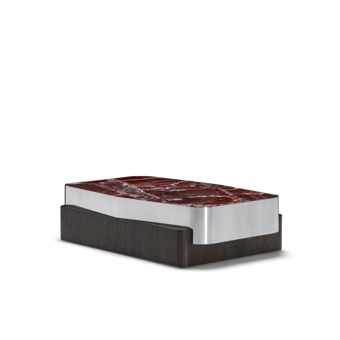 Its hexagonal top is available in high-gloss lacquer or marble, framed by a glossy steel edge that adds a touch of refinement. The base, in rich coffee oak or black oak finishes, provides a grounding contrast to the sleek top.