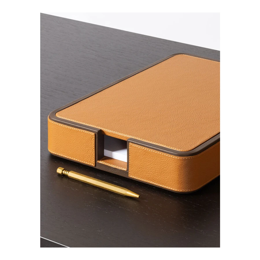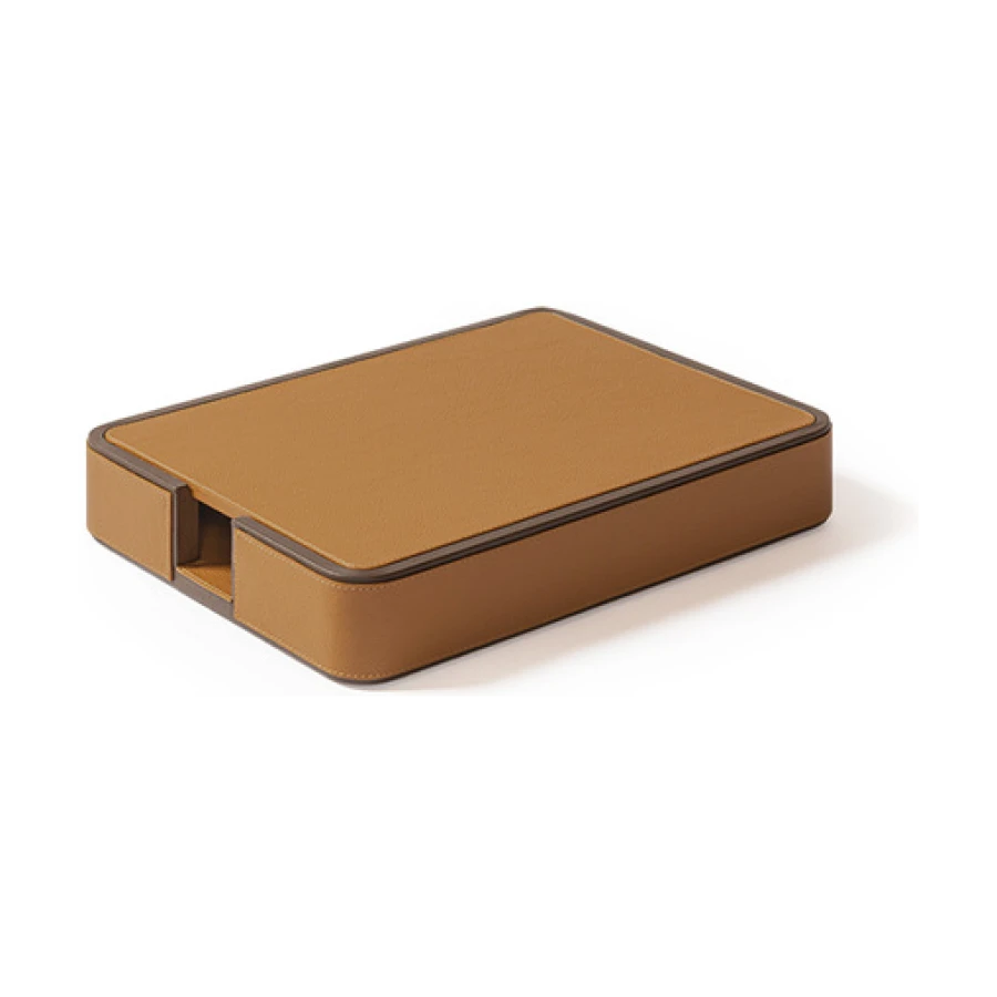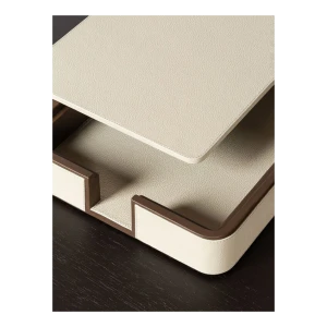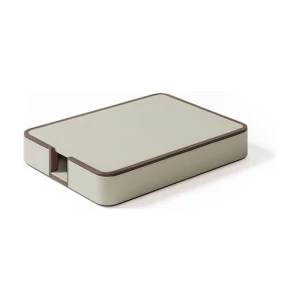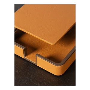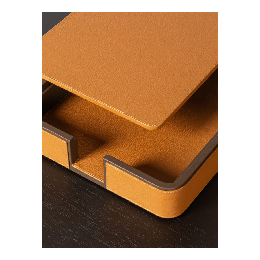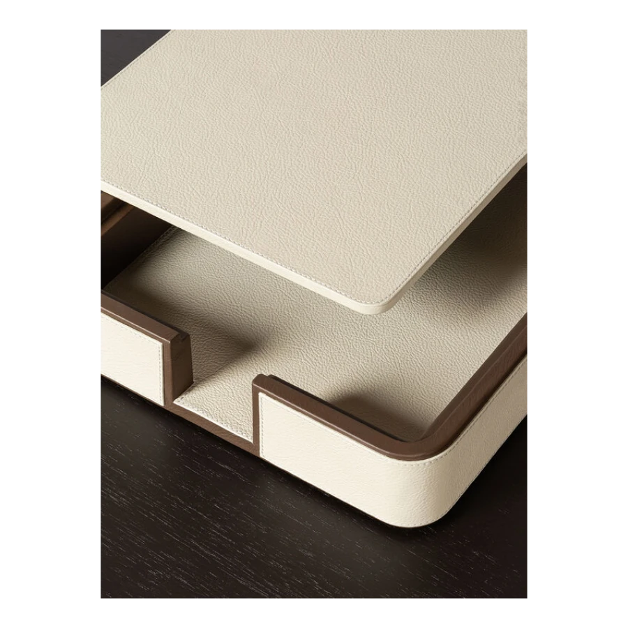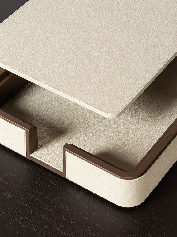 Giobagnara designs practical items for organizing envelopes and documents on desks. The rounded-corner design allows envelopes and papers to be picked and placed without ruining them, ensuring they are always within reach. The letter holder is fully upholstered in Pelle Frau® leather, available in a choice of colors. The practical and stylish A4 paper tray, fully covered in Pelle Frau® leather, features a lid designed to protect the sheets from dust or light, keeping them neatly stacked and ready to use. The central grooving makes it easy to pick up single sheets without ruining them.