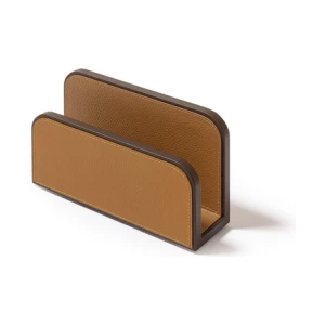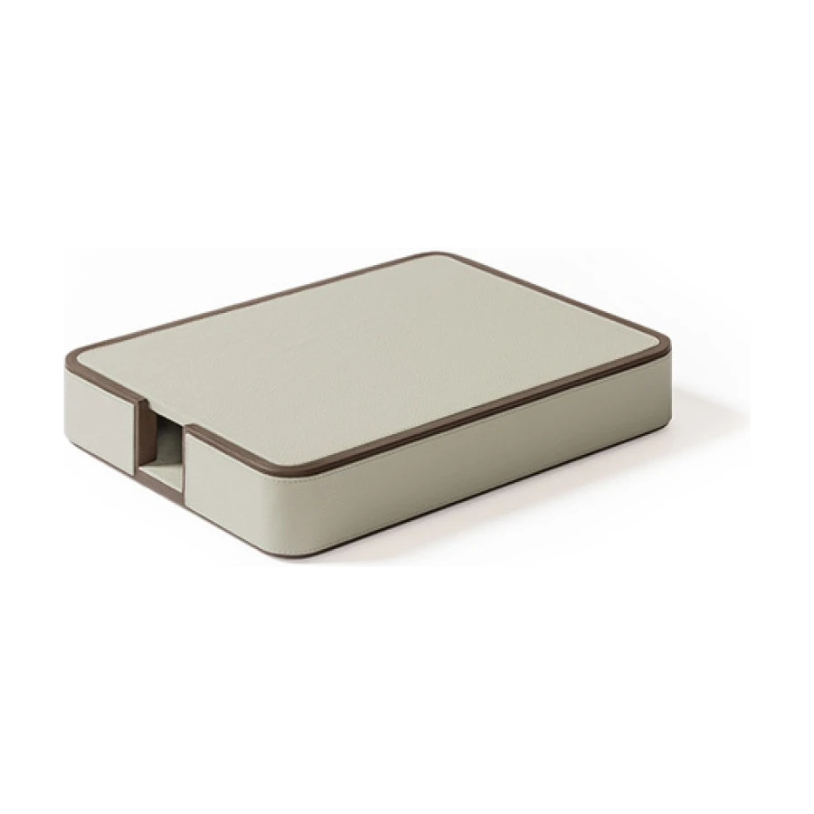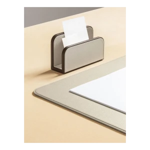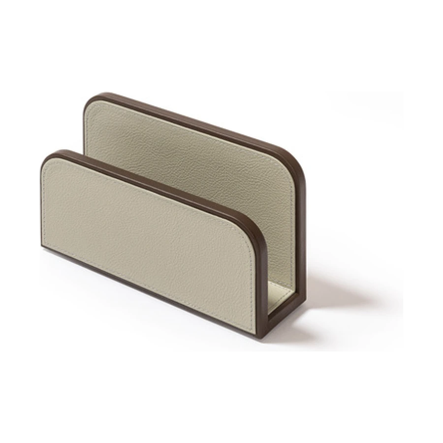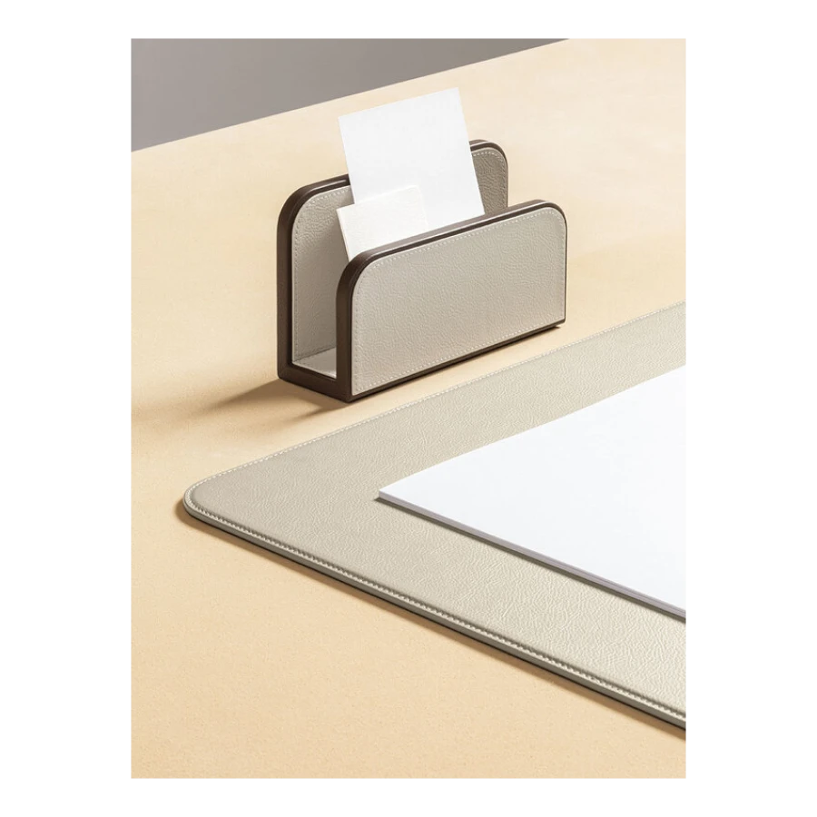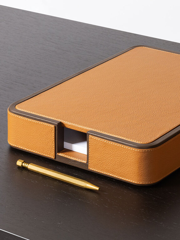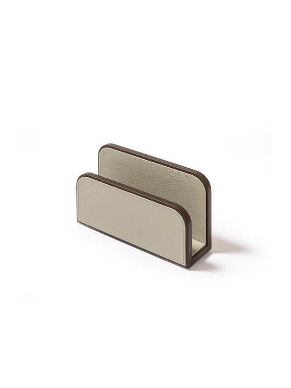 Giobagnara designs practical items for organizing envelopes and documents on desks. The rounded-corner design allows envelopes and papers to be picked and placed without ruining them, ensuring they are always within reach. The letter holder is fully upholstered in Pelle Frau® leather, available in a choice of colors. The practical and stylish A4 paper tray, fully covered in Pelle Frau® leather, features a lid designed to protect the sheets from dust or light, keeping them neatly stacked and ready to use. The central grooving makes it easy to pick up single sheets without ruining them.