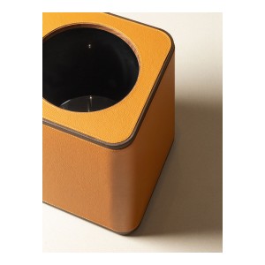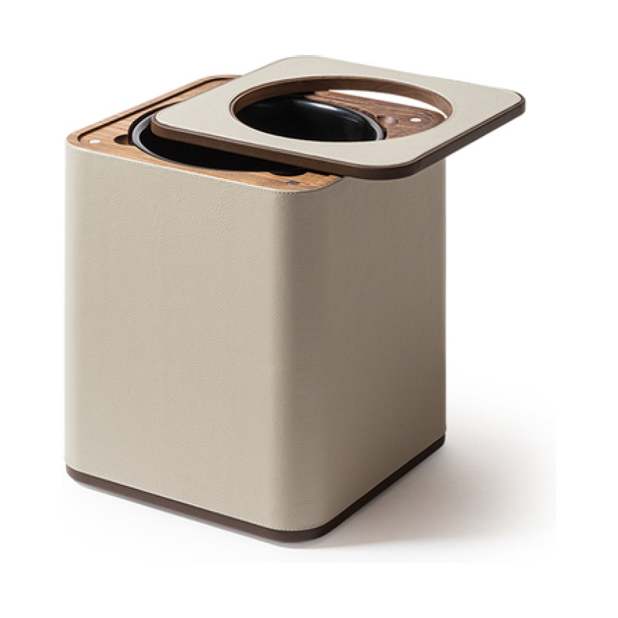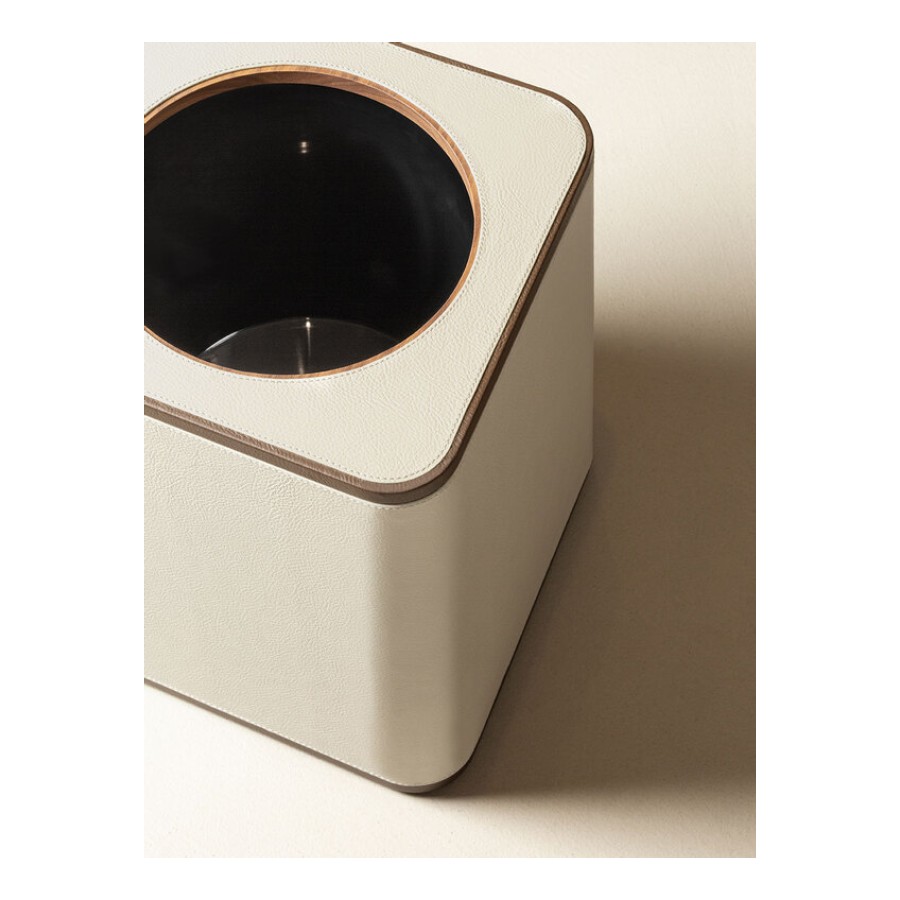 The wastepaper basket, designed by Giobagnara for Poltrona Frau, features an elegant parallelepiped shape with rounded corners, crafted from wood and fully upholstered in Pelle Frau® leather with precious visible stitching. A version with lid, similarly made of wood and covered in Pelle Frau® leather, is also available.