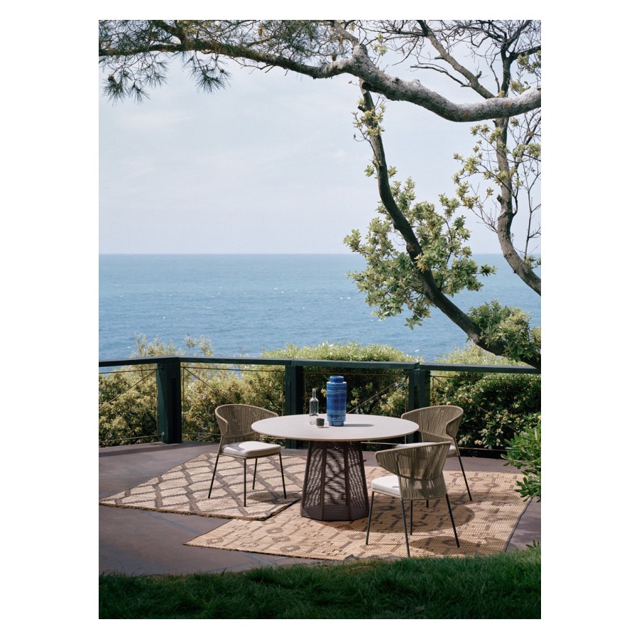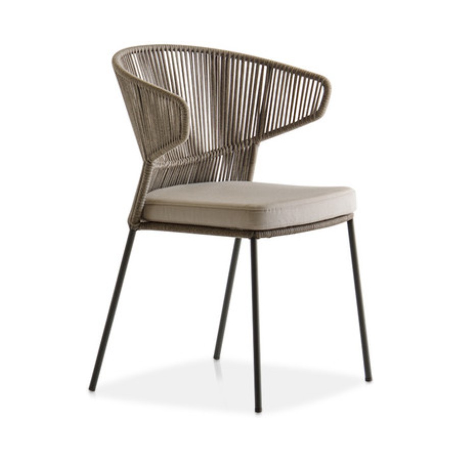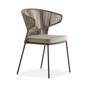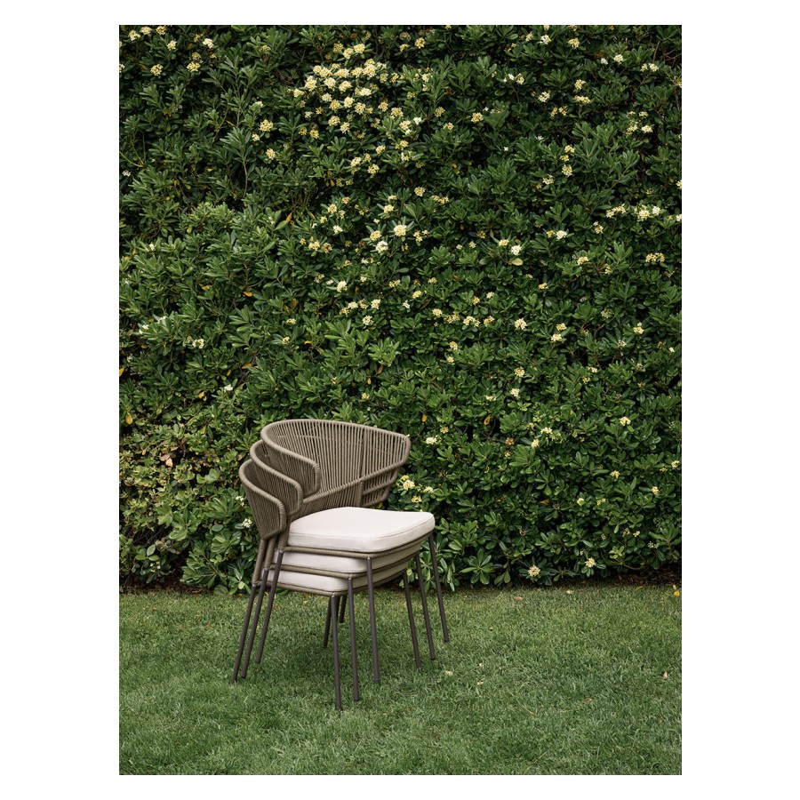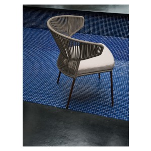The Ola small armchair, in the new stackable version, is characterized by the shape of the enveloping backrest, in metal rod, which recalls the fluid image of the waves. This seat has a structure made of metal lacquered outdoor powder coated frame hand woven in “Fly” ribbon. The inside of the cushion consists of fire retardant polyurethane foam and polyester padding. Waterproof fabric underlining with sealed seams; final lining in outdoor catalog fabrics with breathable mesh bottom. The cushion is removable and detachable. Legs in painted AISI 316 stainless steel tube.