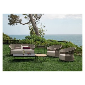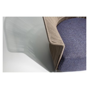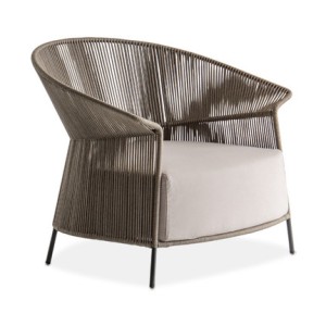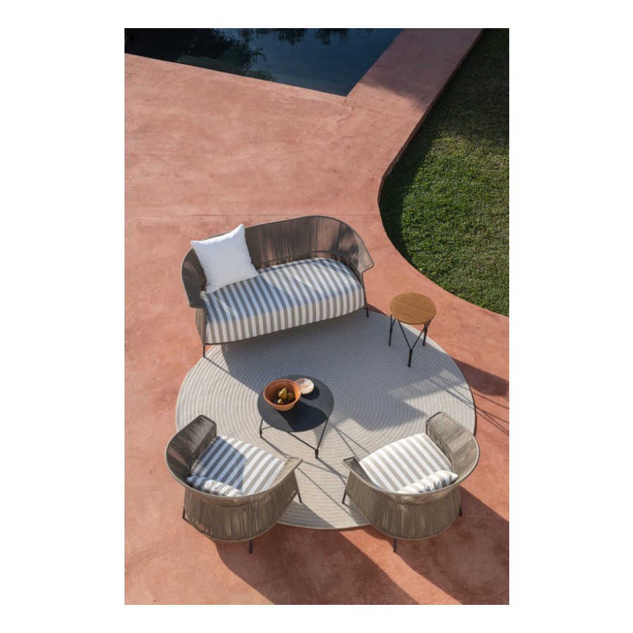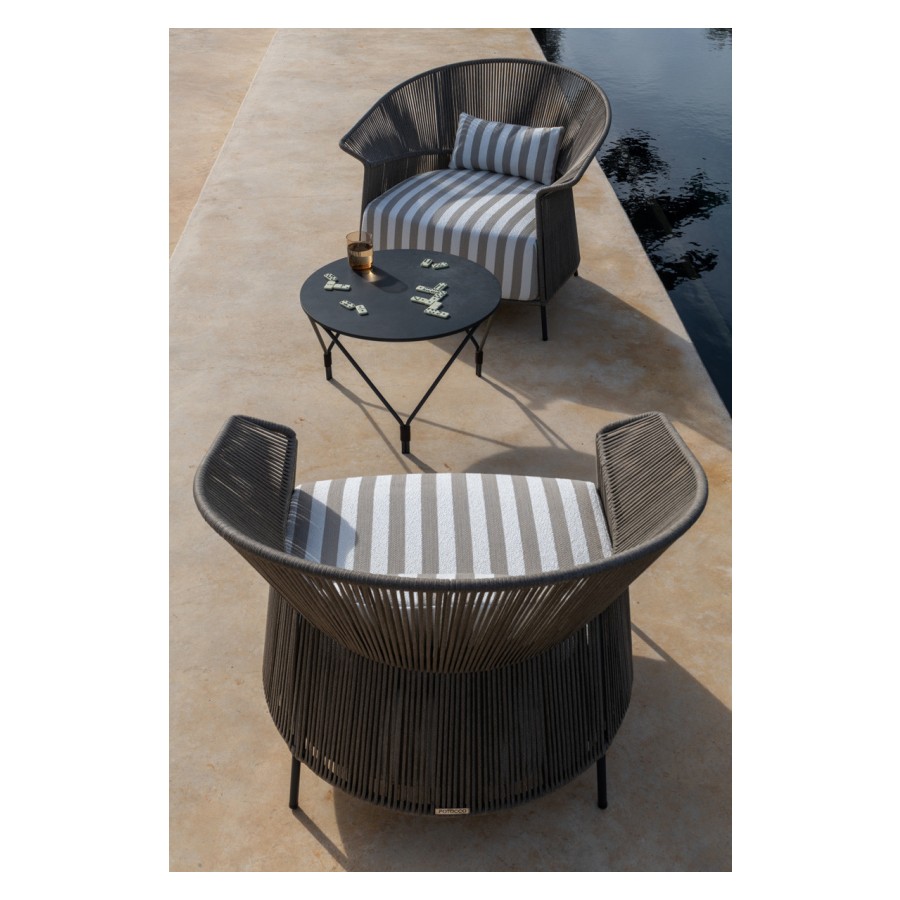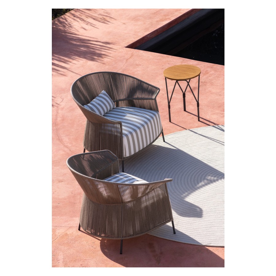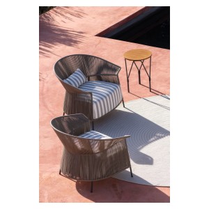 The armchair is characterized by a wrapping backrest, made of metal lacquered outdoor powder coated frame, hand woven in “Fly” ribbon.