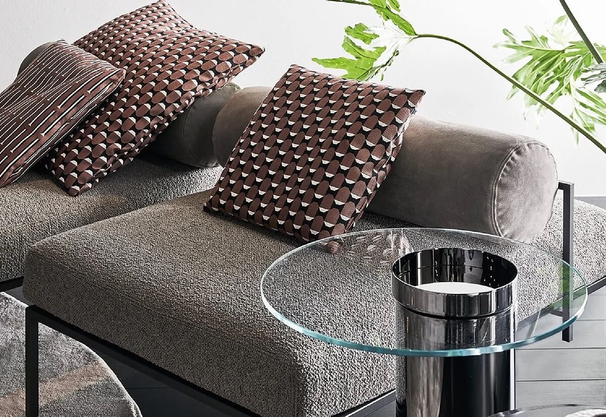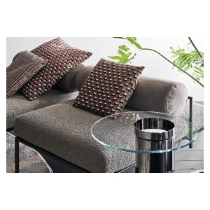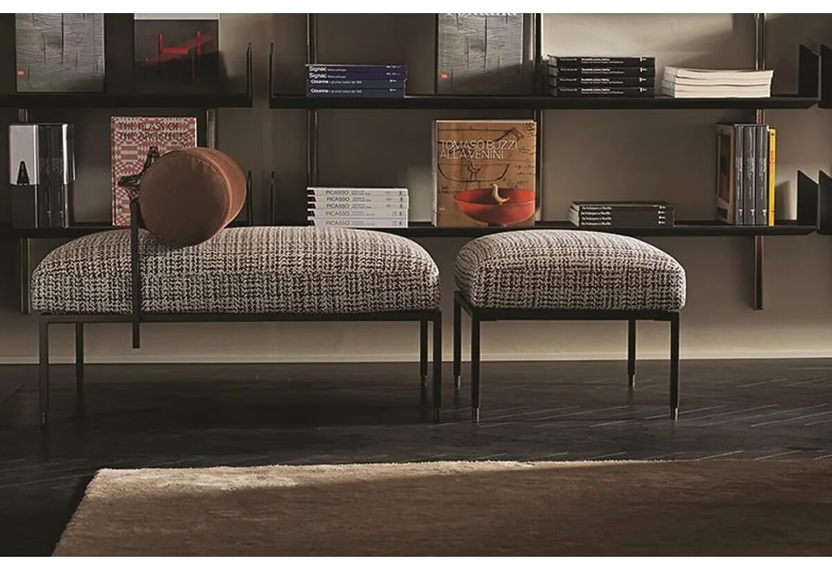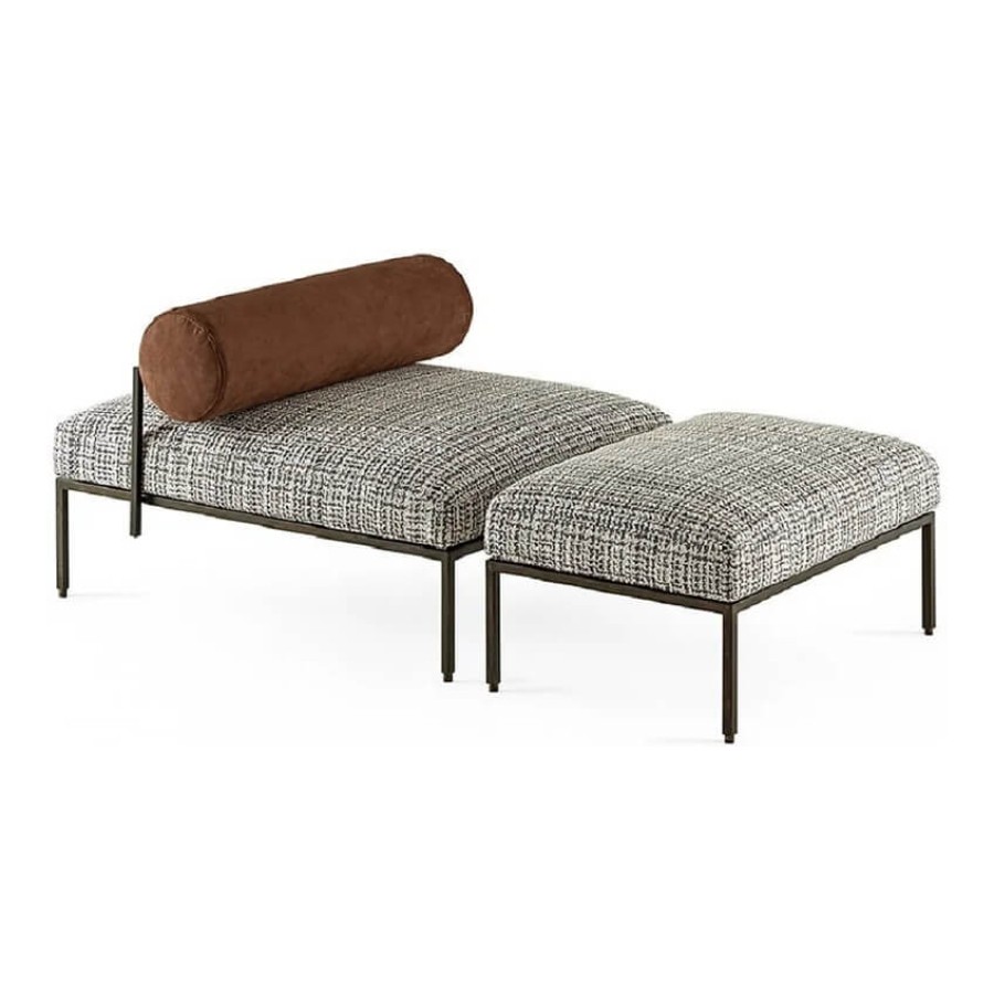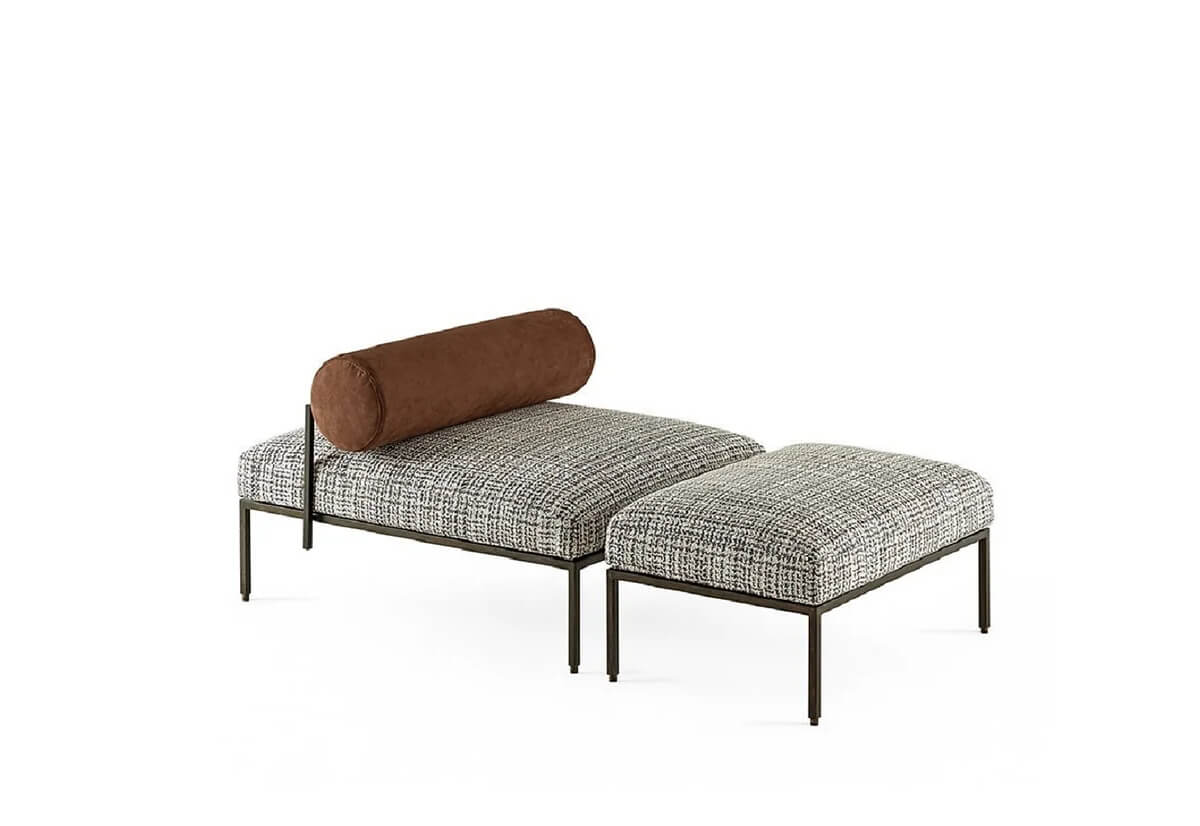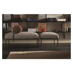Bench and pouffe with bronzed black metal structure. Seat cushion in non-deformable foam polyurethane in different density and polyester fibre and back rollcushion covered by fabric or leather as per samples. Decorative polyester fibre cushions, on request.