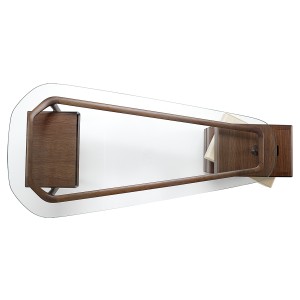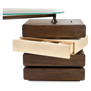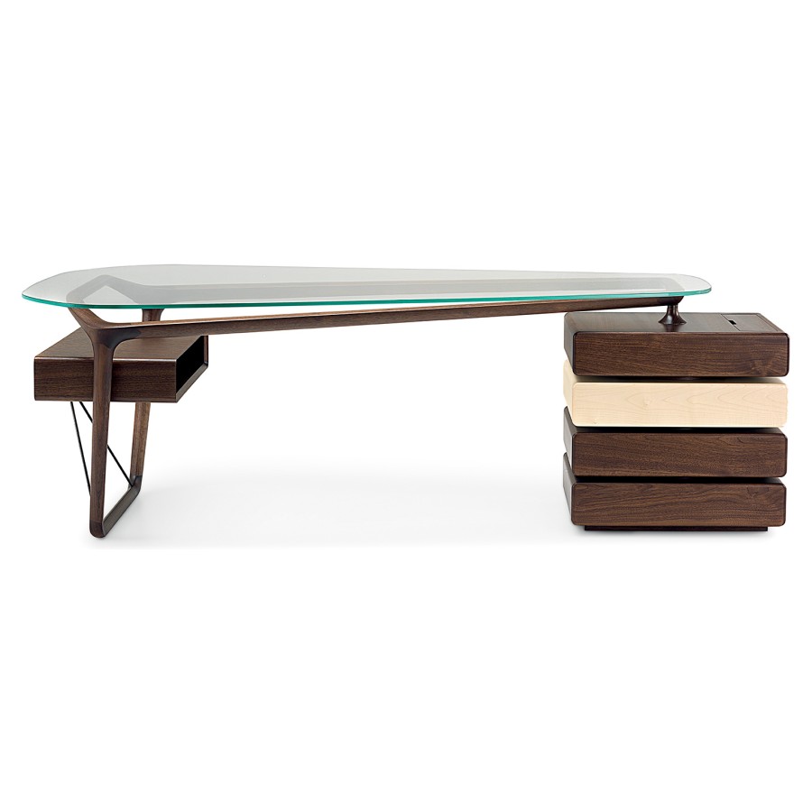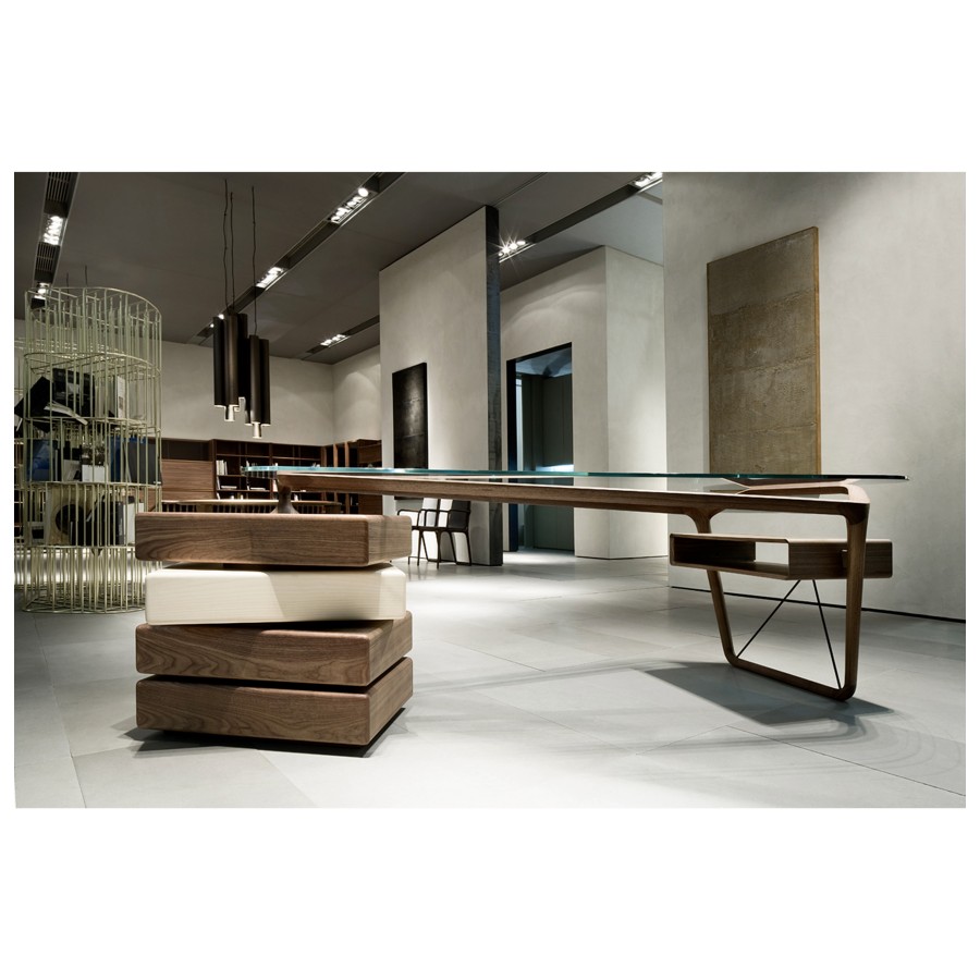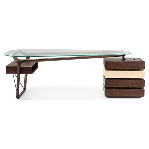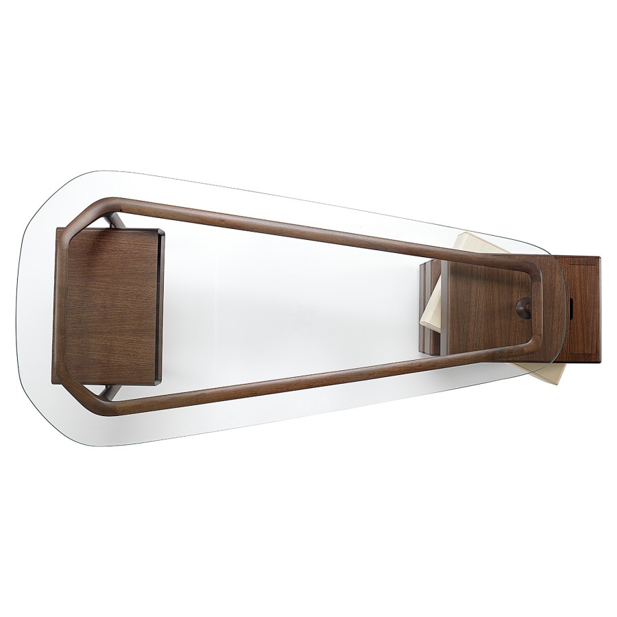 On the right, the base of the desk includes a chest of drawers, rounded on all four sides and with a minimal profile. A simplicity that is also sought in the details, such as in the drawer handles, which are formed from a hole in the lower part of the drawer to remain hidden. The second drawer of the four vital elements of the storage unit , can be rotated, and it’s made of bleached maple with an internal organizer. The others three drawers are made with solid American walnut, with the first that has a retractable compartment for cables. This stylistic solution livens up the entire piece even more. Greater functionality is guaranteed by the open storage placed on the sinuous legs of the desk, on the opposite side. The 12 mm tempered glass top with slight lateral grinding, which can be chosen in the transparent or smoked version, enhances the visual aspect of the design.