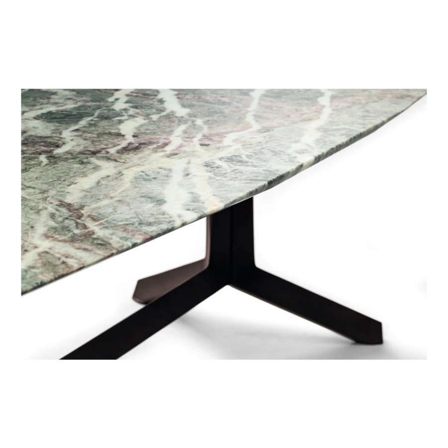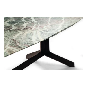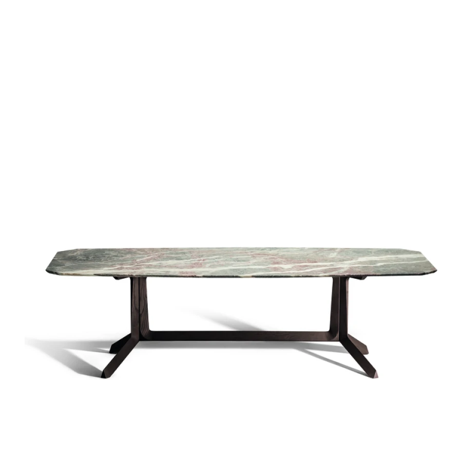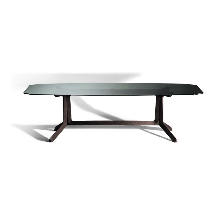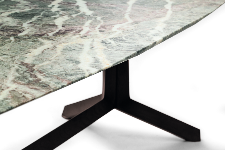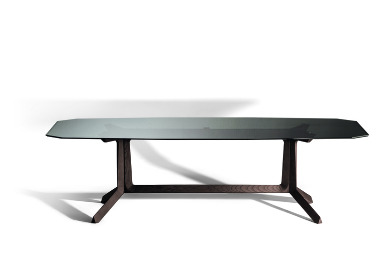 The legs in solid ash with a moka or wenge stain have the impact of a geometric sculpture. In contrast, the tops are soft and curved, in both the round and rectangular versions. The most distinctive feature of the Othello tables is the wooden structure with triangular cross-section and clean edges, beautifully echoed in the diamond workmanship along the edges of the tops. Poltrona Frau has chosen two different materials for the tops. Smoked glass, semi-transparent and light, exalts the architectural solidity of the legs. Fior di Pesco, a particularly prized variety of marble, grabs the attention with its rich and delicate veins which reveal translucent, almost transparent areas in natural light. Alternatively, there is the equally precious Calacatta gold marble. The glass Othello tables are integrated with visible spacers in brushed stainless steel. In the marble version, with polished or semi-polished finish, the underneath of the top is reinforced with a technical mesh to guarantee its resistance. The top is supported by an HPL laminate substrate.