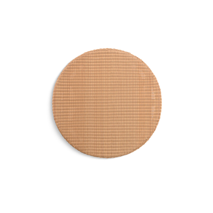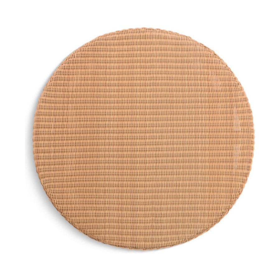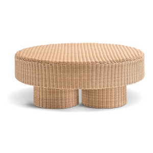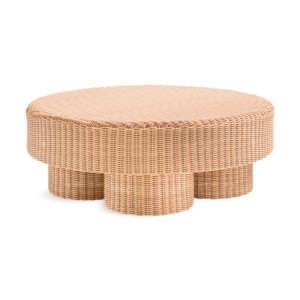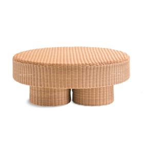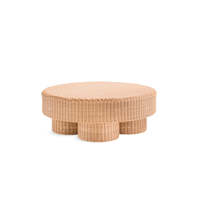 The coffee table’s sturdy aluminum frame is shaped into four cylindrical bases and a circular tabletop, all embellished by carefully woven synthetic rattan made of polypropylene. Evoking a natural look and feel, the woven material is fully weatherproof.