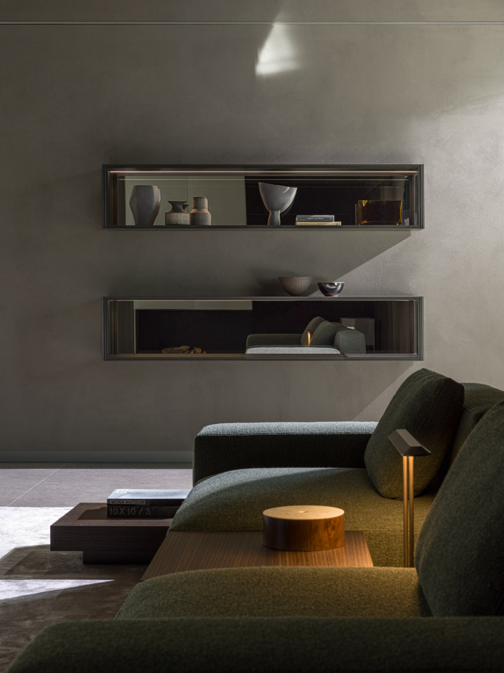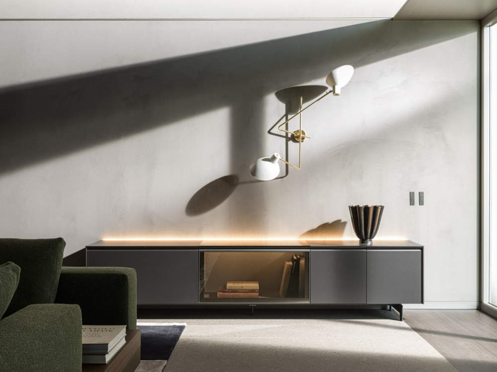 The latest addition for 2023 is represented by the completion of the horizontal glass wall unit, updated with an innovative upward patented flap opening. The movement of the door is activated by a cushioned mechanism hidden inside the profiles, which negates the need for visible side arms, making the wall unit unique of its kind. The completely transparent floating shelf is designed to be mounted above a console element, providing a delicate sense of balance. Within, LED lighting softly illuminates the shelves’ contents. The Pass-word system adds a touch of elegance and complements any modern living space.