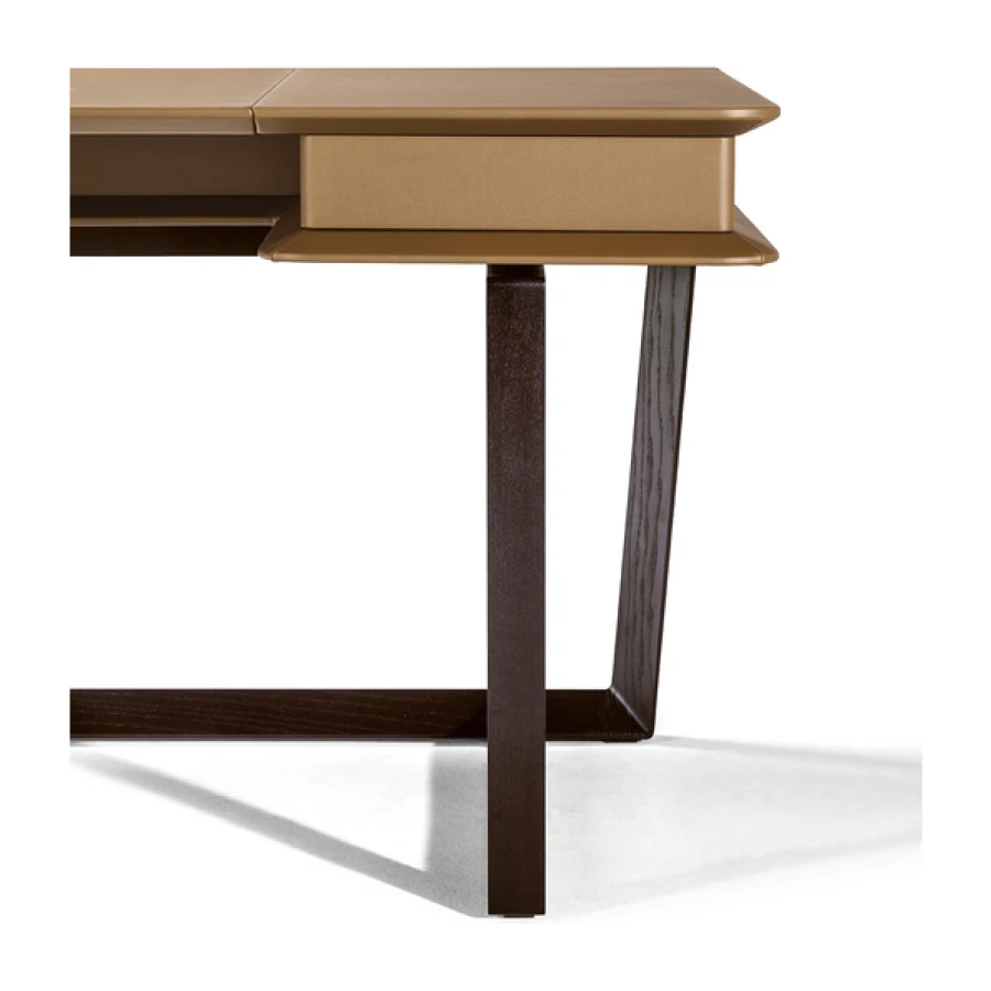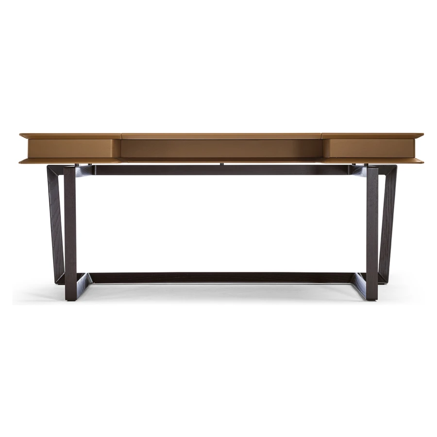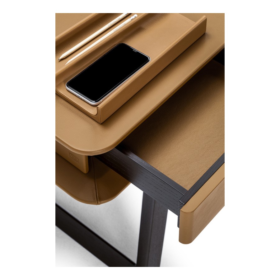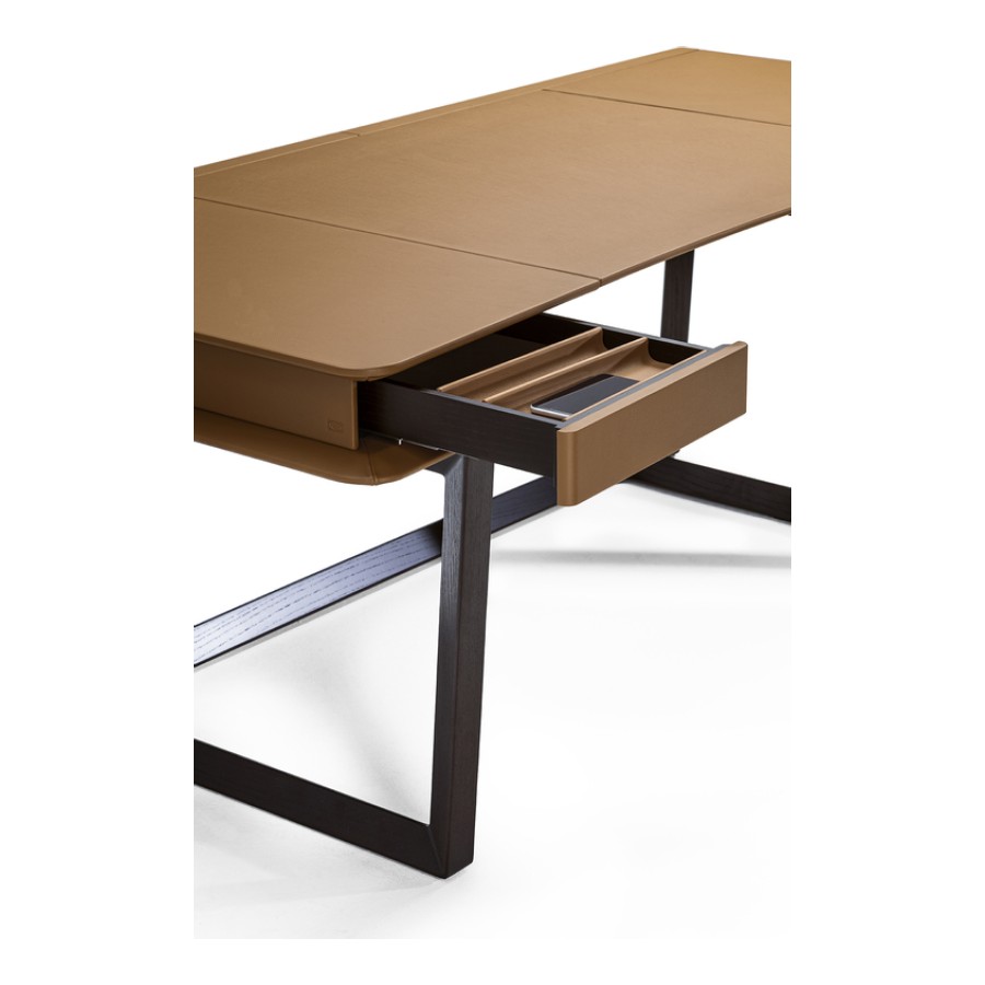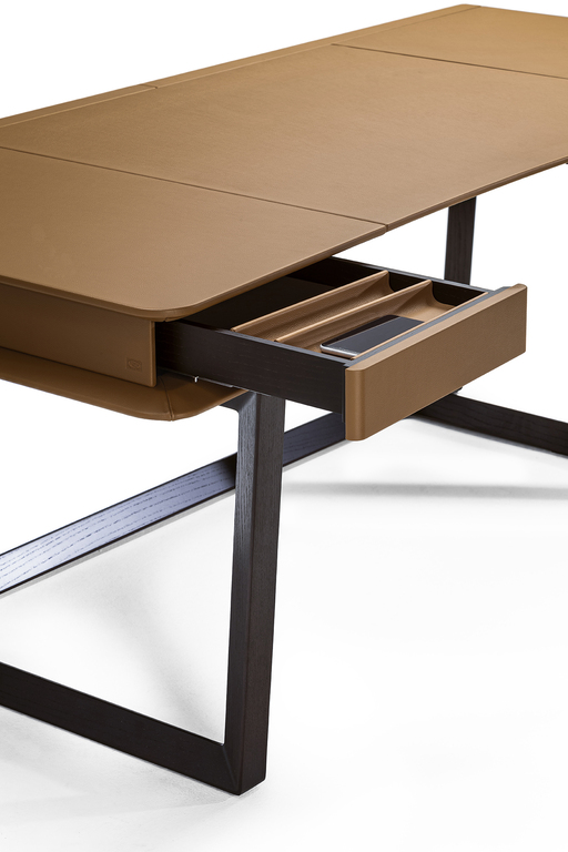 The base structure consists of an easel made from triangular-section solid ash in a moka or wenge stain which forms three trapezium-shaped supports connected to each other with fine joints created in the wood. The front of the two drawers is in MDF covered in Pelle Frau® leather matching the upholstery of the top, while the internal structure is made from solid ash in a wenge stain. The upholstery of the top, the front of the drawers, the side walls and the doors accessing the rear compartments is in Pelle Frau® ColorSphere.