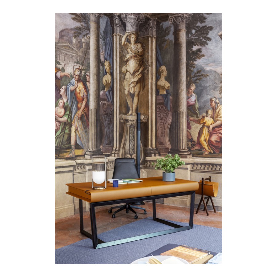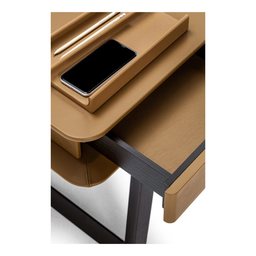 The Peek-a-Book desk consists of an extremely simple sheet of poplar plywood covered in Pelle Frau® leather which is curved and folded in two to form the base and the desktop, as well as to accommodate two drawers. The visual effect is that of a valuable leather-bound book that symbolises the function of the object. In fact, the desk is a place for thinking, collecting our thoughts and looking back over our memories: the most intimate and personal side of the person that uses it to study or work.
