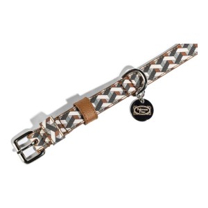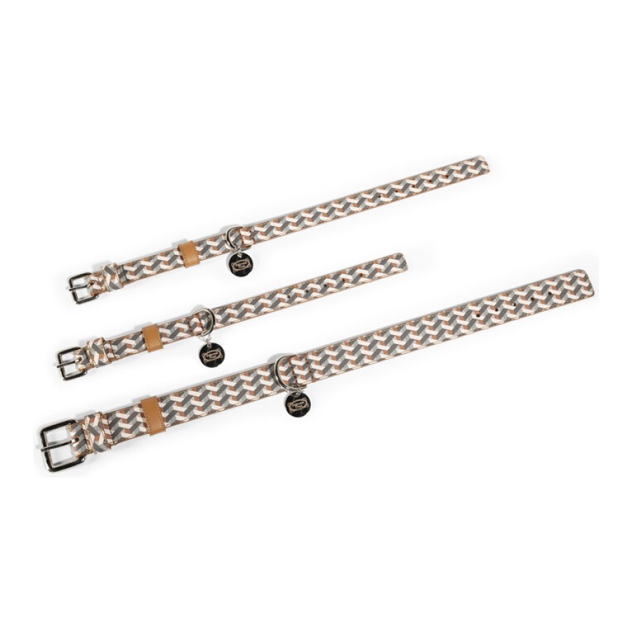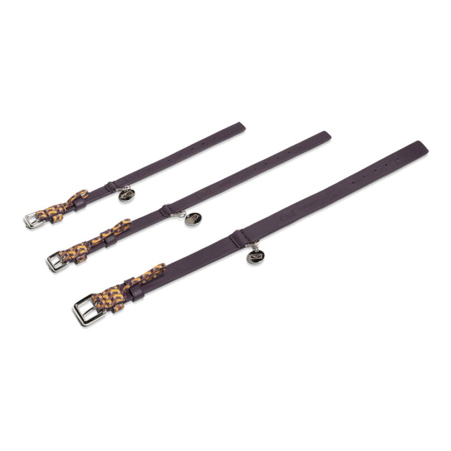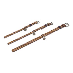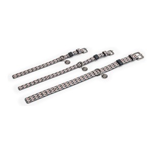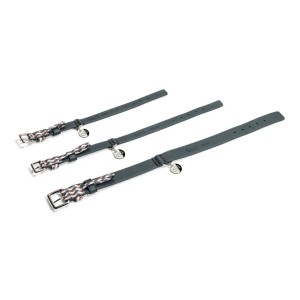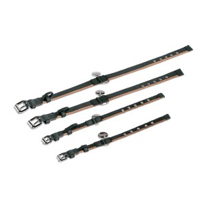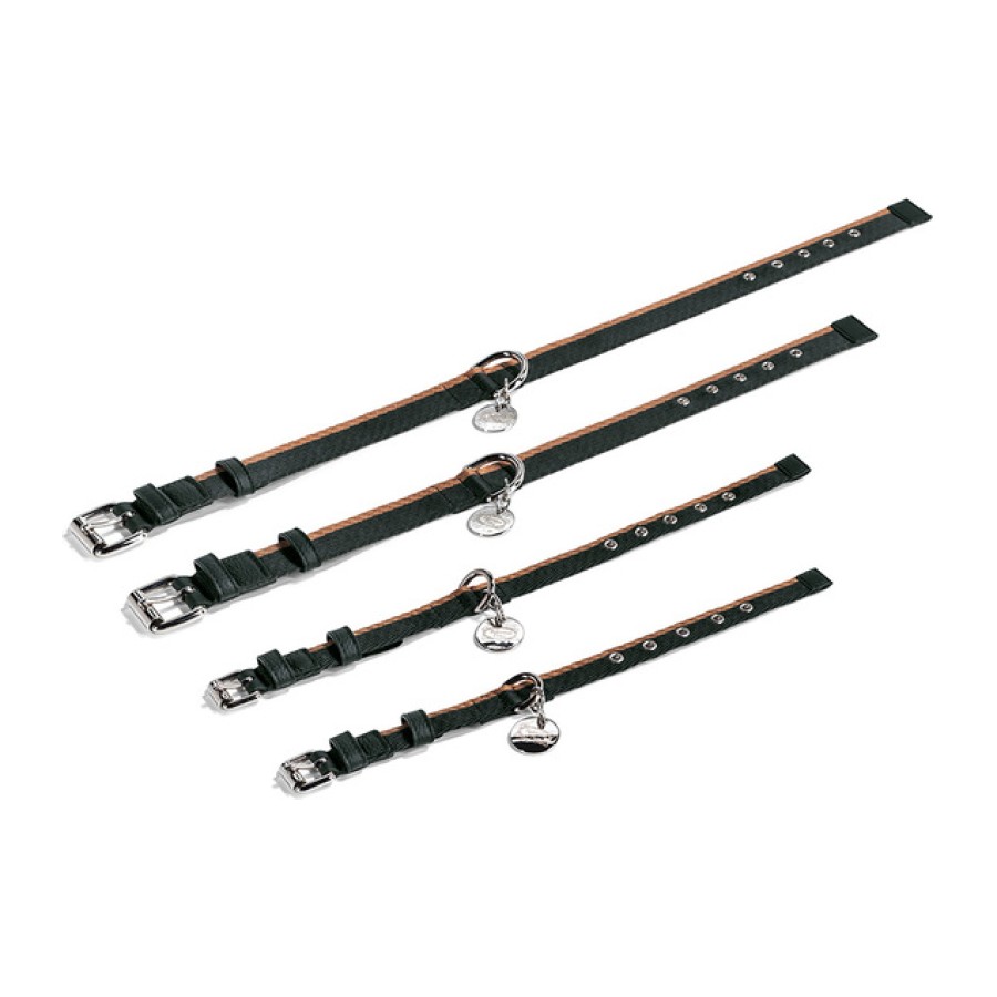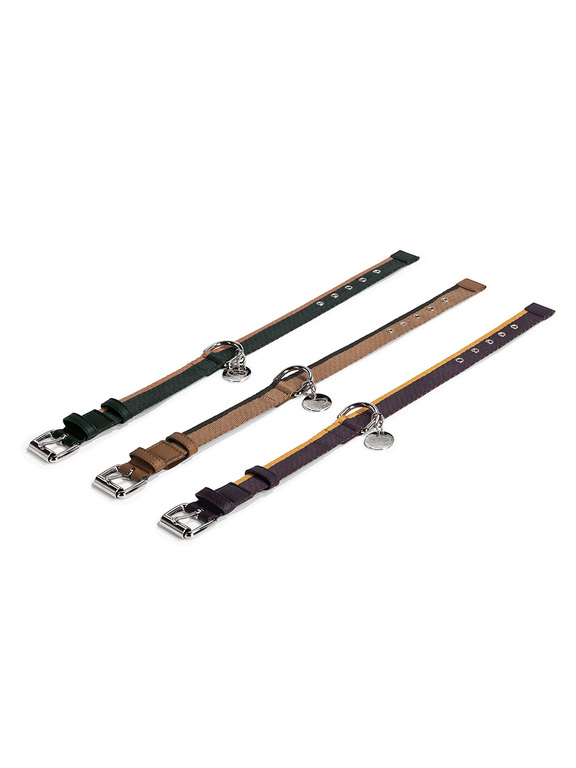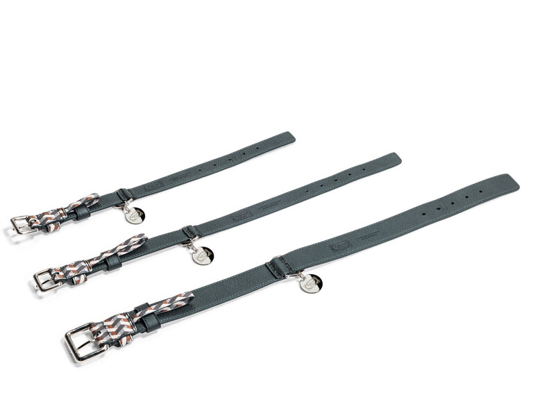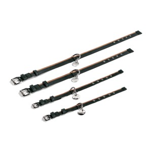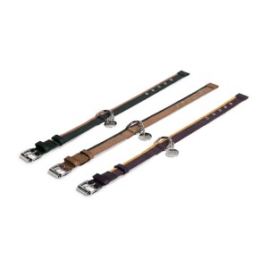 The collar can be made of Pelle Frau® leather or jacquard woven ribbon with Pelle Frau® leather loops, available in various colors. It includes a fixed loop and adjustable loop with lock, and a D-ring to attach the leash. It is available in various sizes. The collar also features inner tear-resistant reinforcement, nickel-plated brass rings and a galvanized zamak tag in polished nickel.