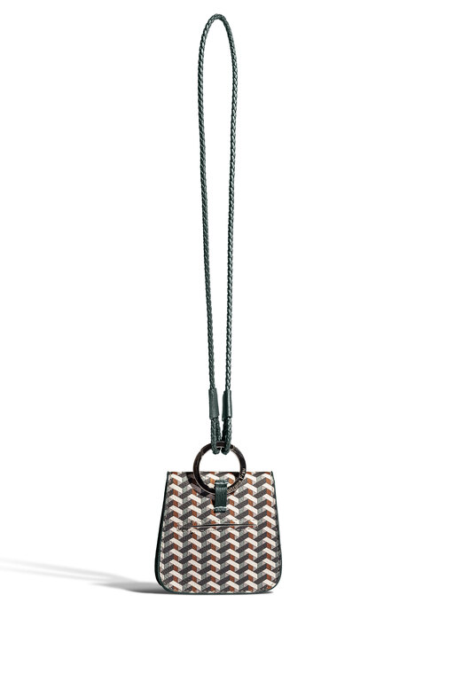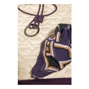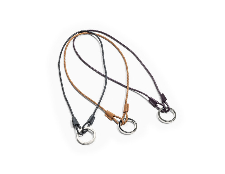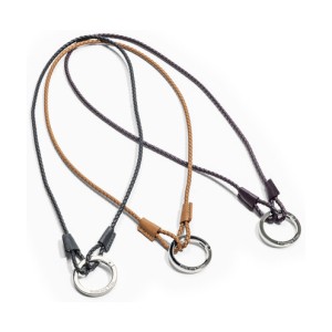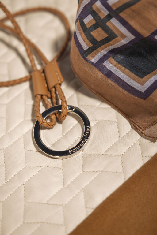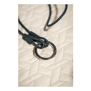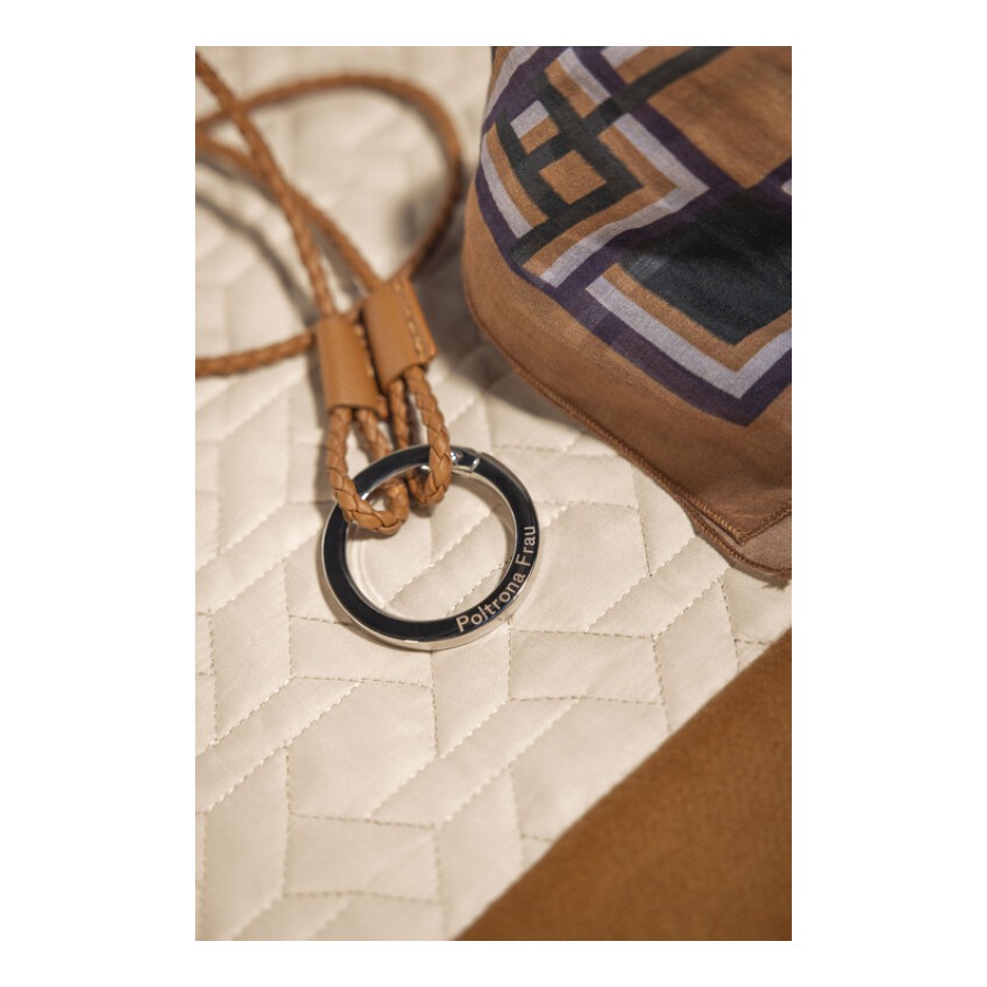 The key ring is a stylish and versatile accessory that allows to clip on keys or biscuit pocket. It is made of woven Pelle Frau® leather with a polished nickel galvanized Zama ring.