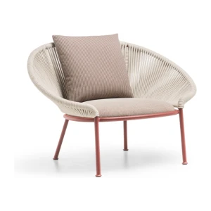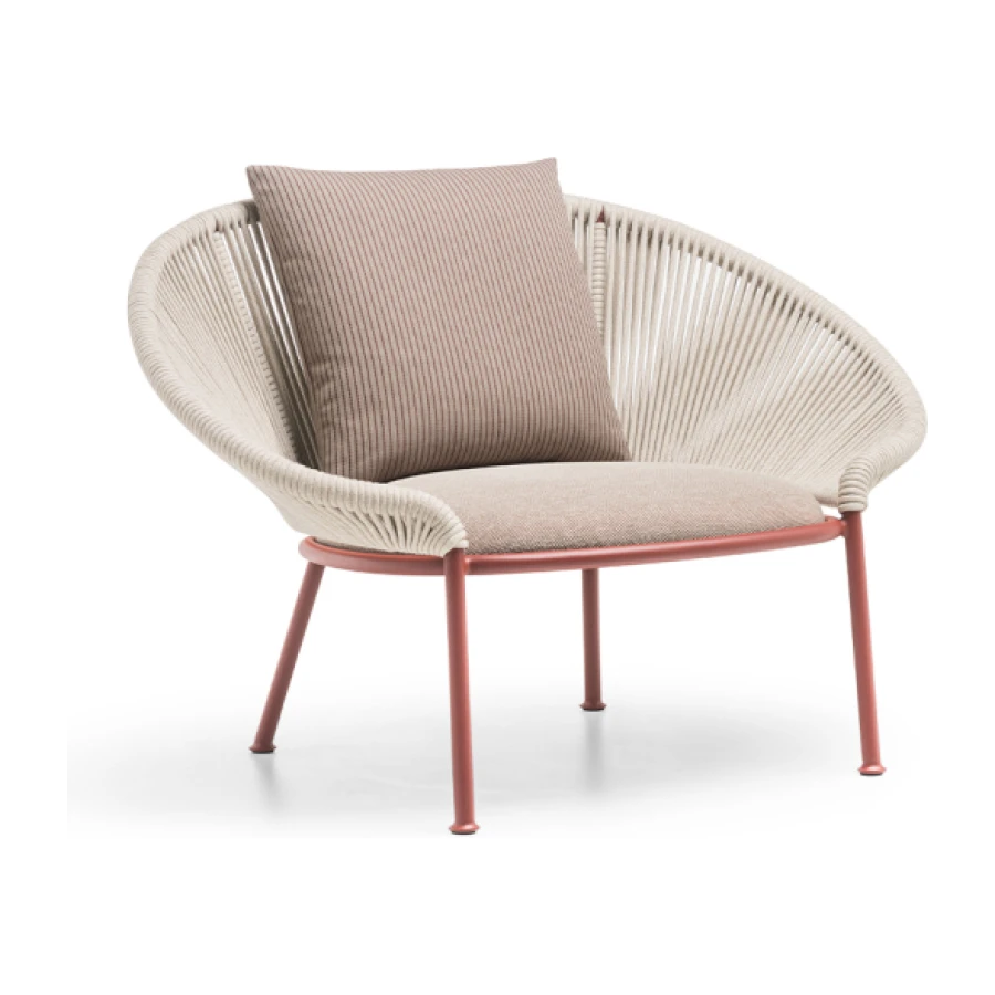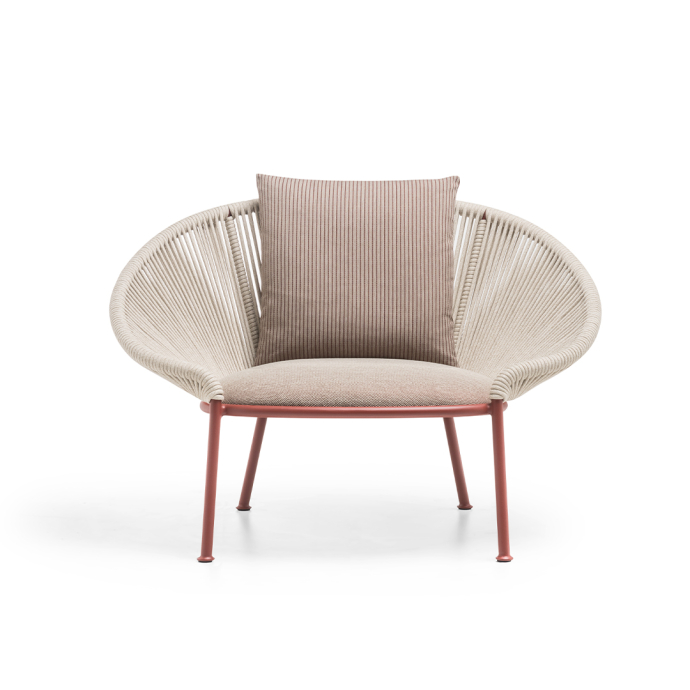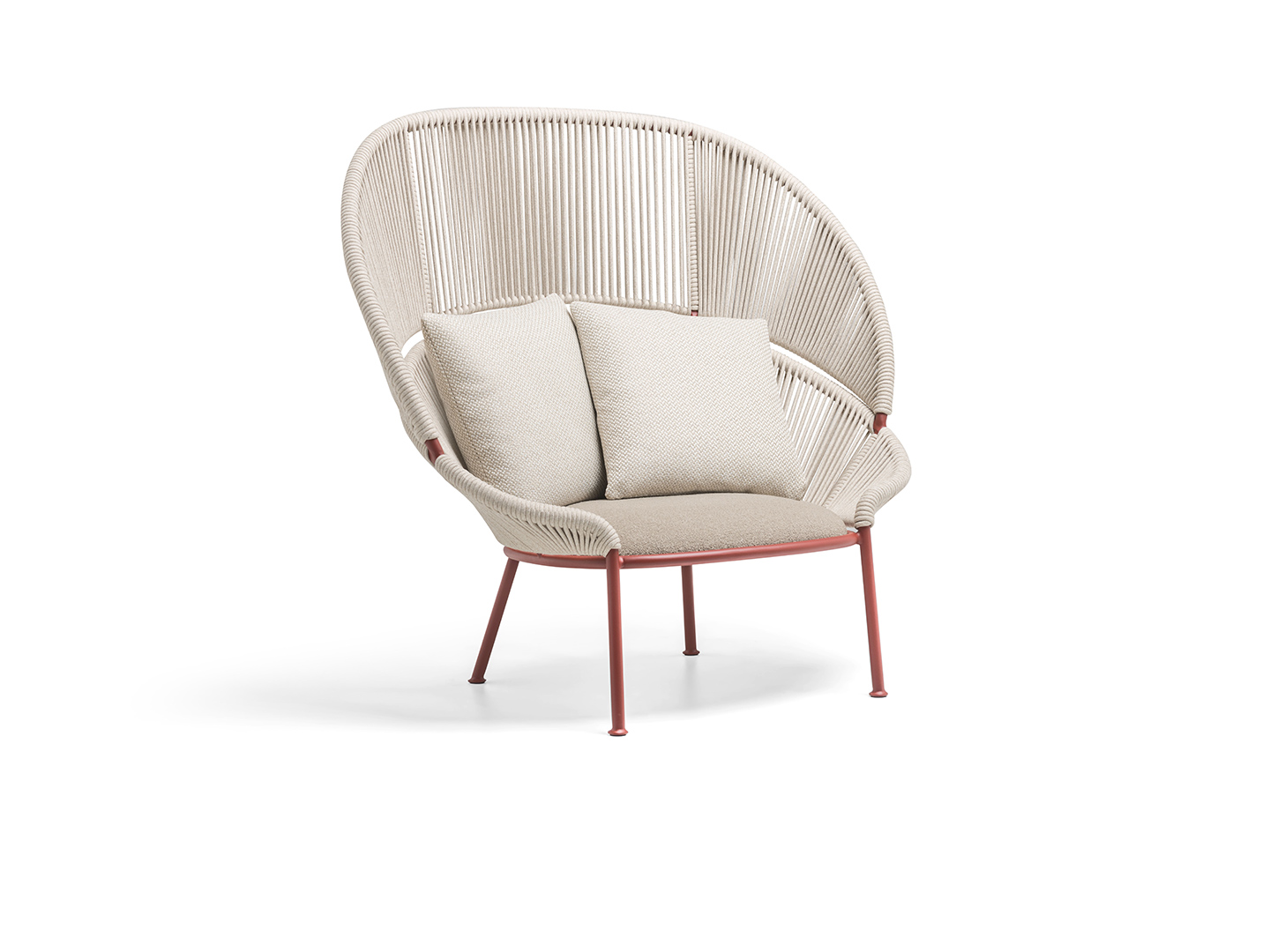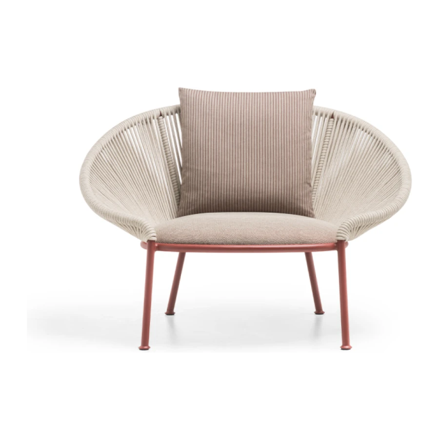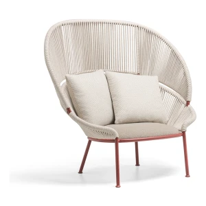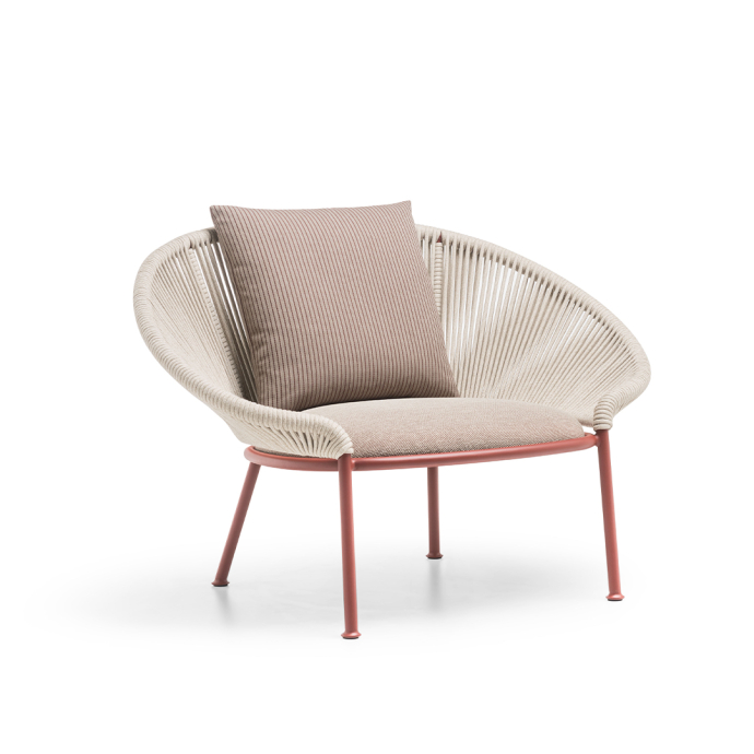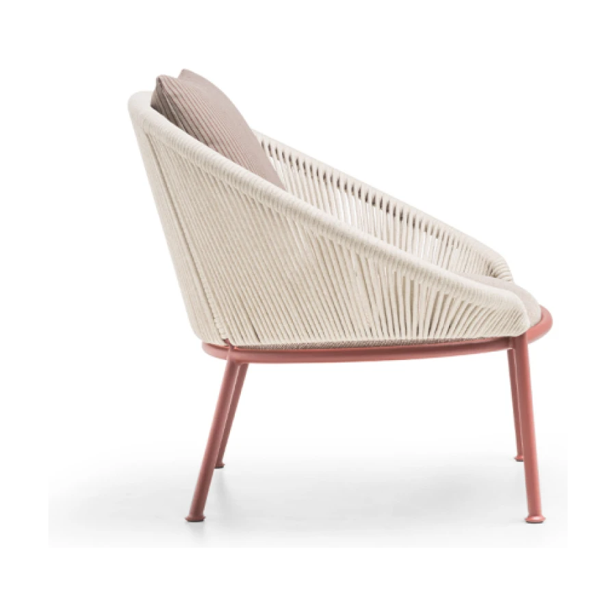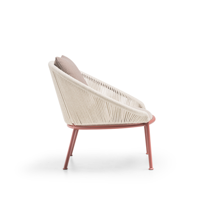 The backrest, available in high and low versions, becomes a canvas for the intricate dance of polypropylene fiber ribbons. These ropes, reminiscent of nautical elements, add a touch of elegance while being resistant to water and challenging climates.