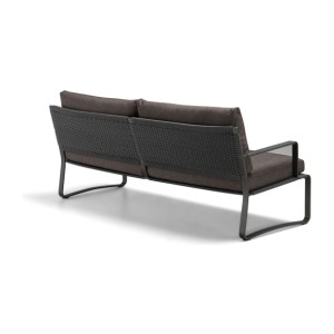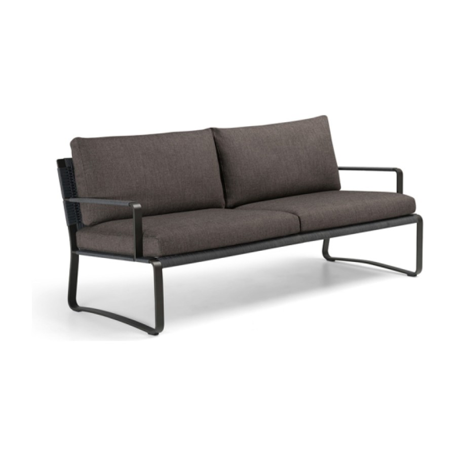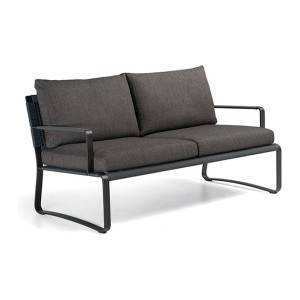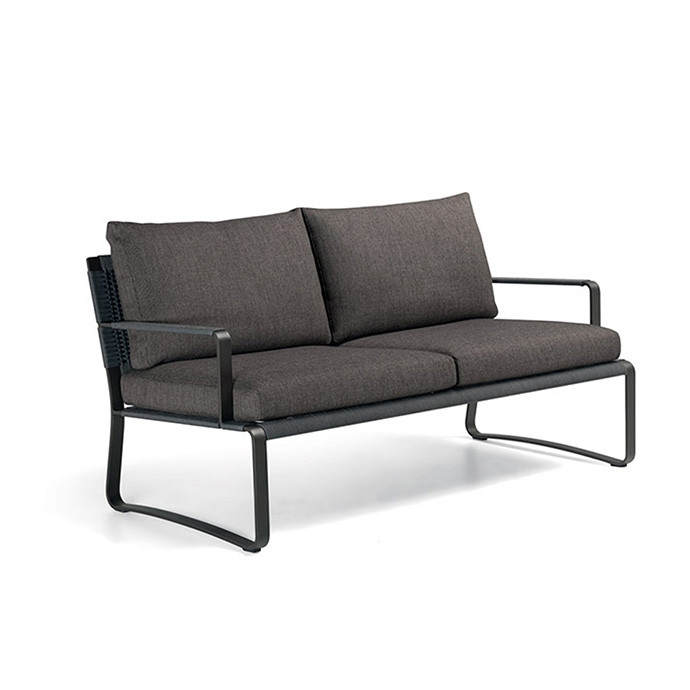 The sofa is available in two versions, also with two cushions, with widths of 150 and 180 cm. The use of aluminium, which weighs significantly less than iron, allows for easy movement of generously sized furniture. The easy movement and reconfiguration of elements is an inherent feature of outdoor furniture.