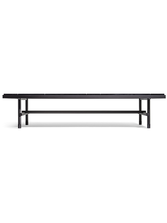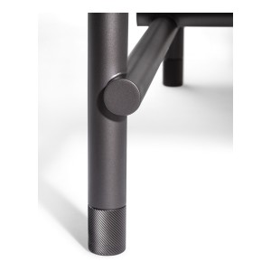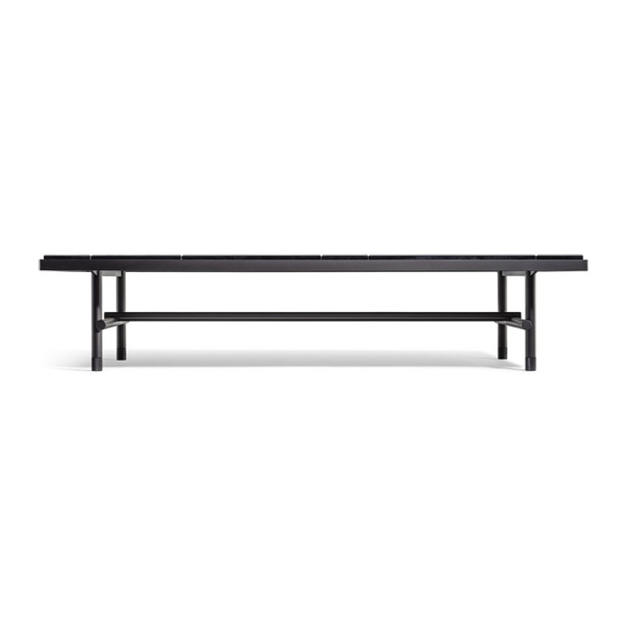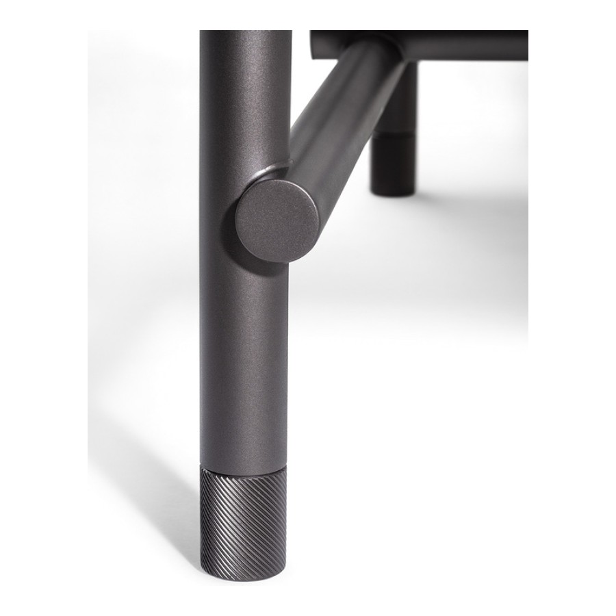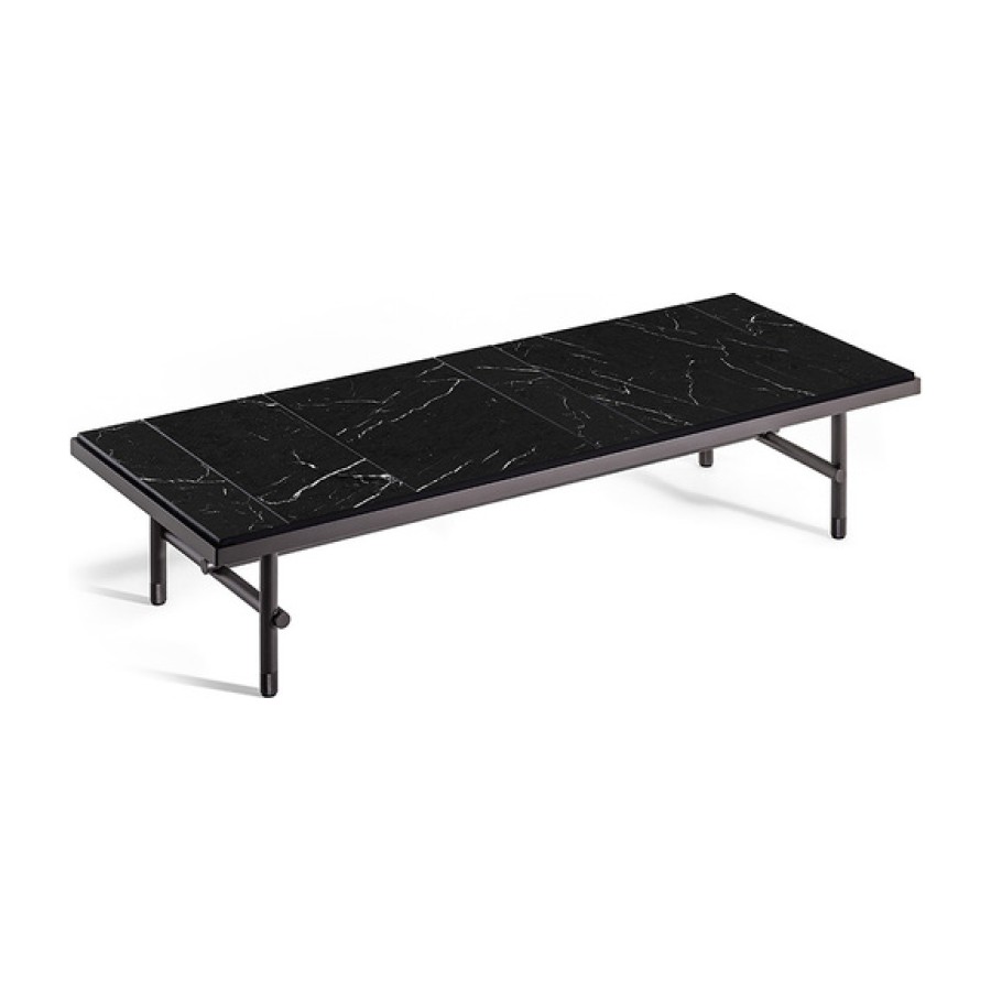 The structure of the side tables consists of an L-section aluminium shelf and an underlying base made from tubular steel. The entire product is lacquered with a burnished finish. The thin shelf supports the marble tops, highlighting their thickness and beauty without artifice.