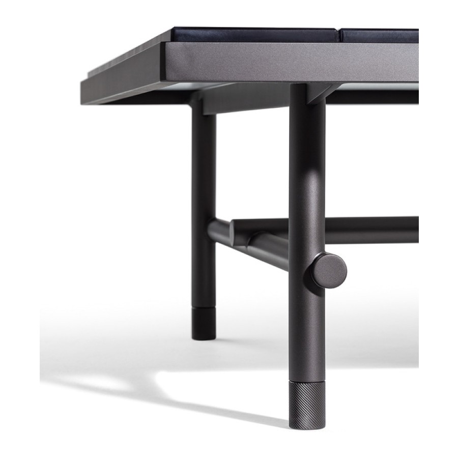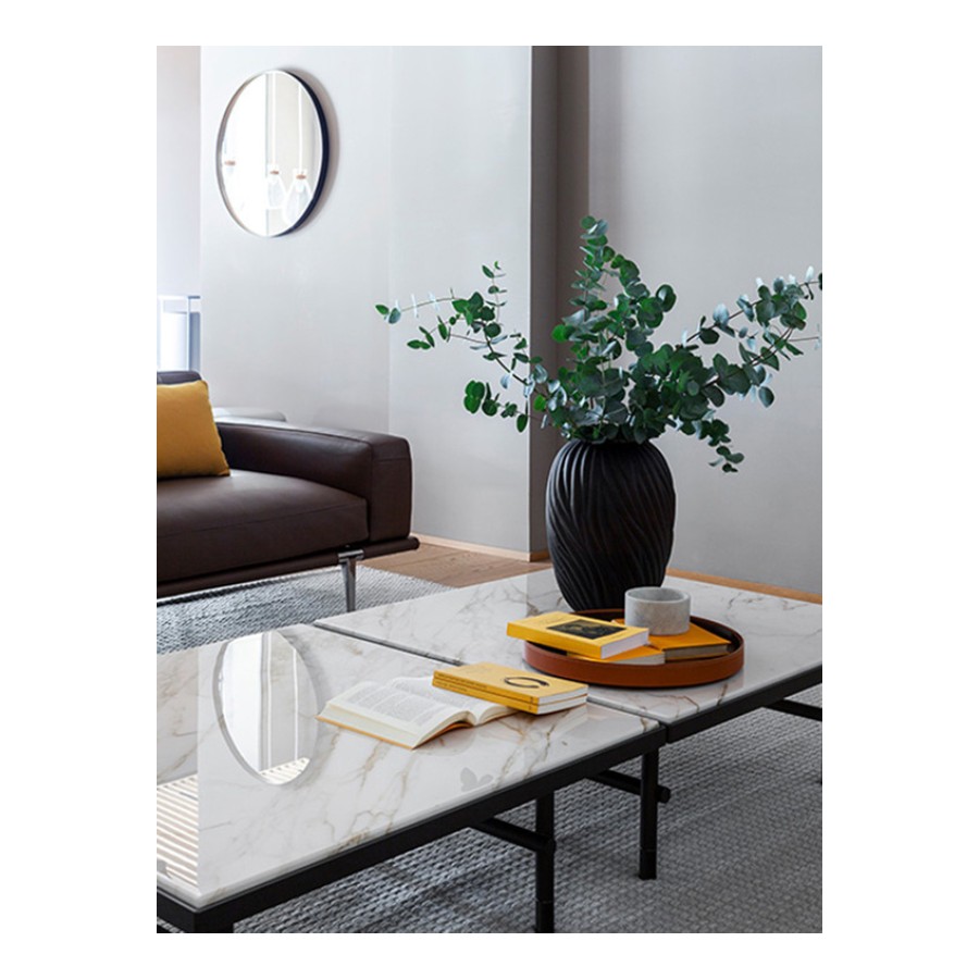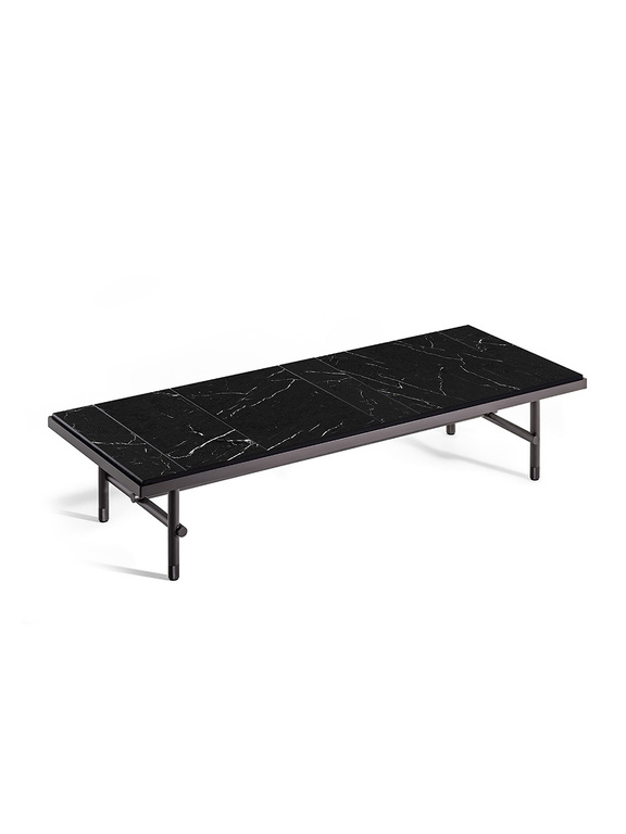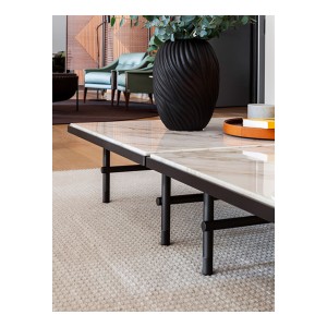 The workmanship accentuates the aesthetic characteristics of the different marbles. The Calacatta and Arabescato Venato tops are available in glossy and semi-glossy versions, and are made with a single slab in order to perceive the uniqueness of the grain in its maximum extension. The Nero Marquinia marble side tables come in a glossy natural finish. The slab is characterised by a particular graphic effect that is achieved through scoring to simulate a pattern of multiple tiles of various widths.