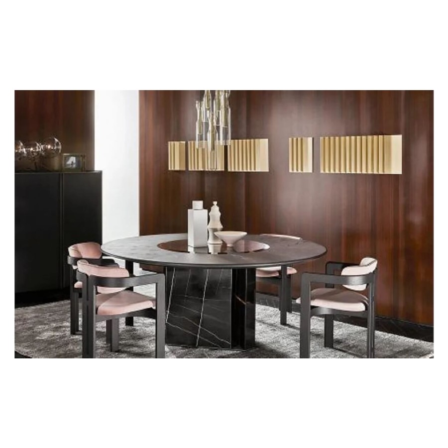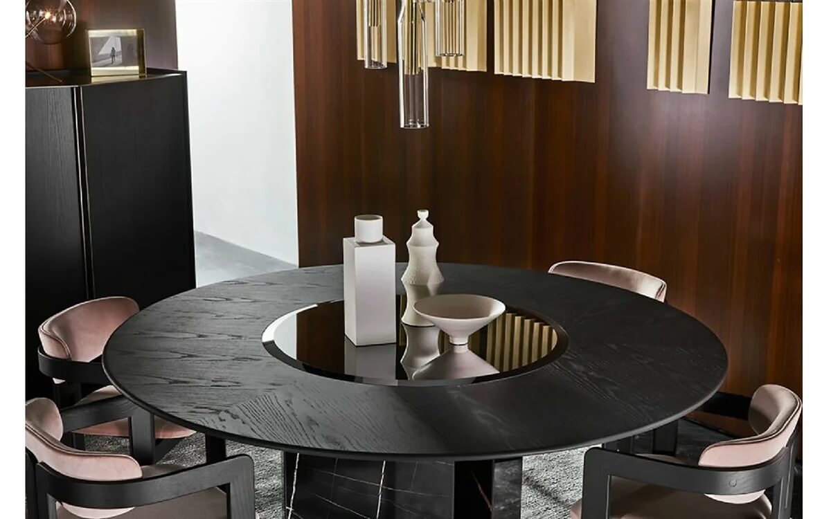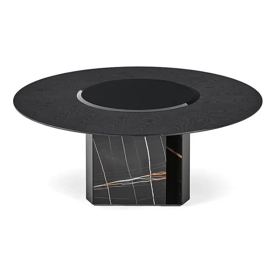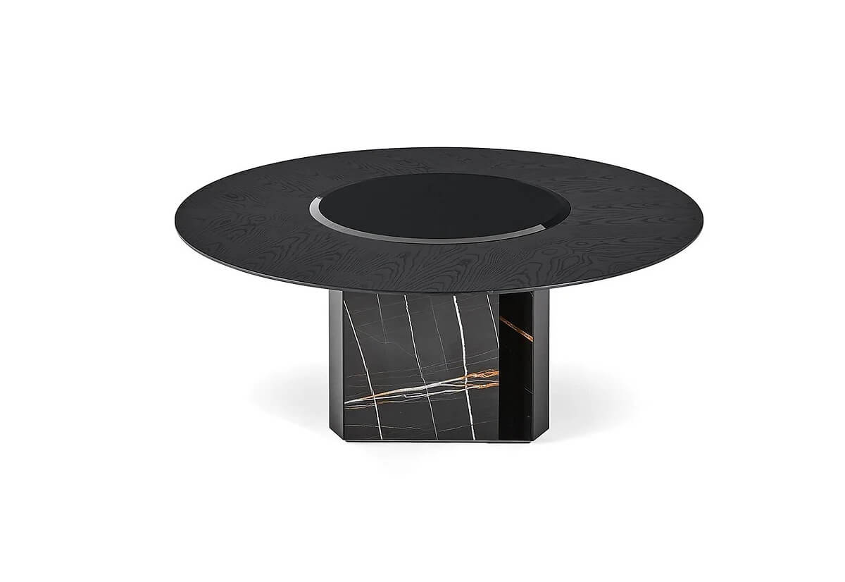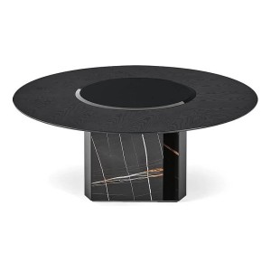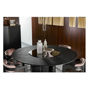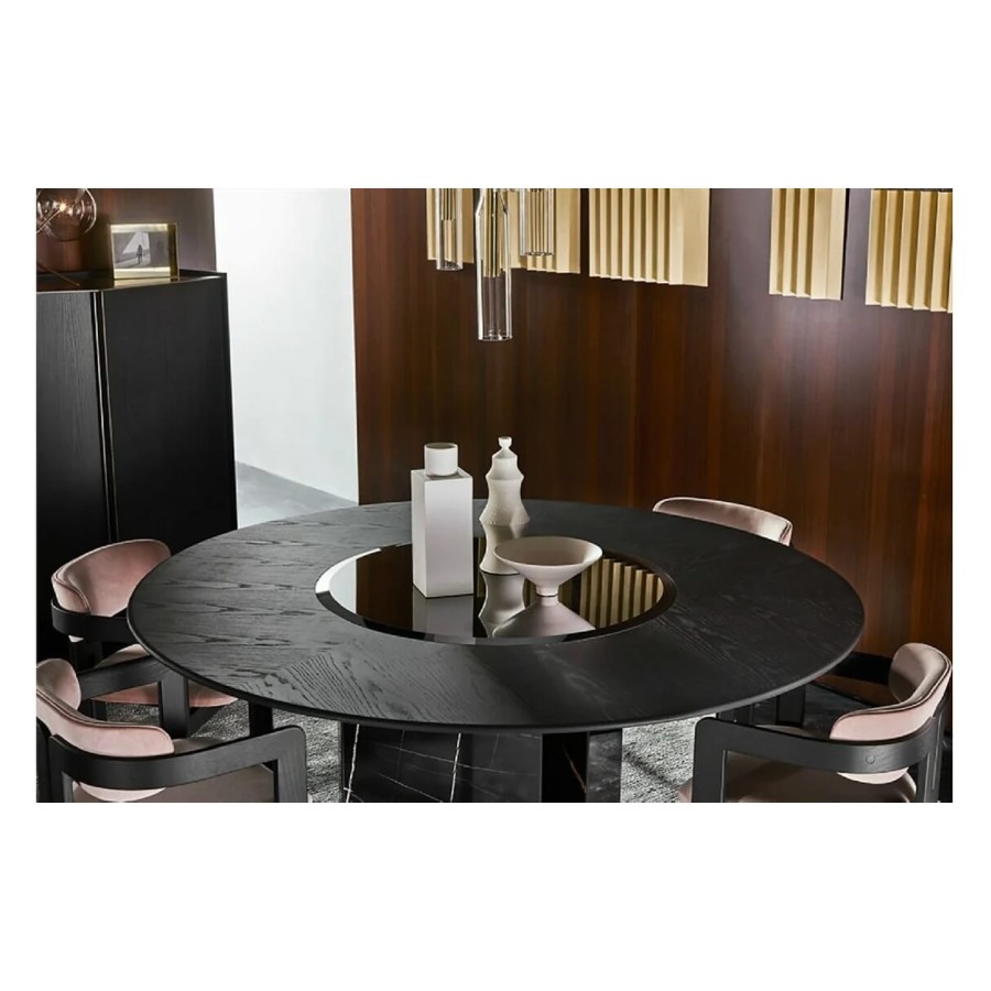Table with black stained brushed ash top. Rotating plate in 10mm tempered bevelled black bright painted glass. Sahara Noir marble base. “Supermirror” bright stainless steel bottom plate.