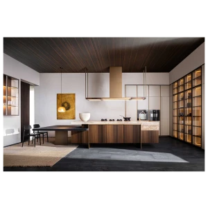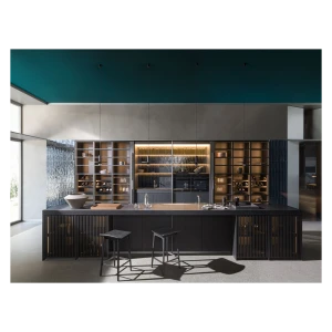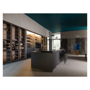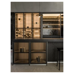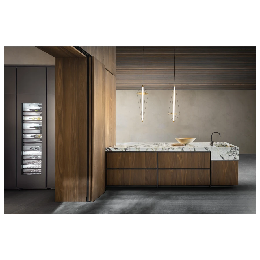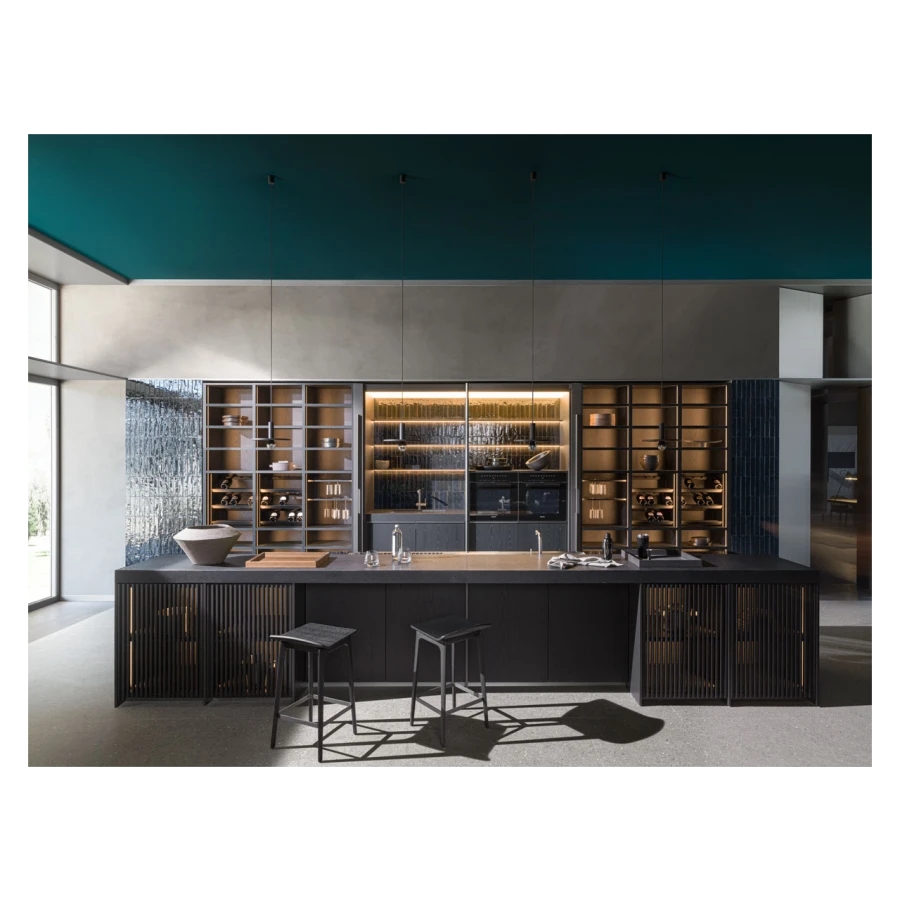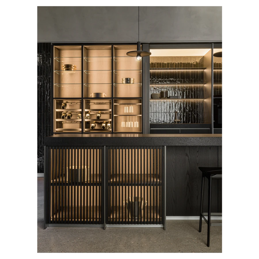 Metal grids define the basic architecture, wall units, columns, hoods and accessories. Full volumes, empty volumes and tops of different thicknesses are hooked to the slender and minimal techno/structural elements, creating an elegant interplay of balances.