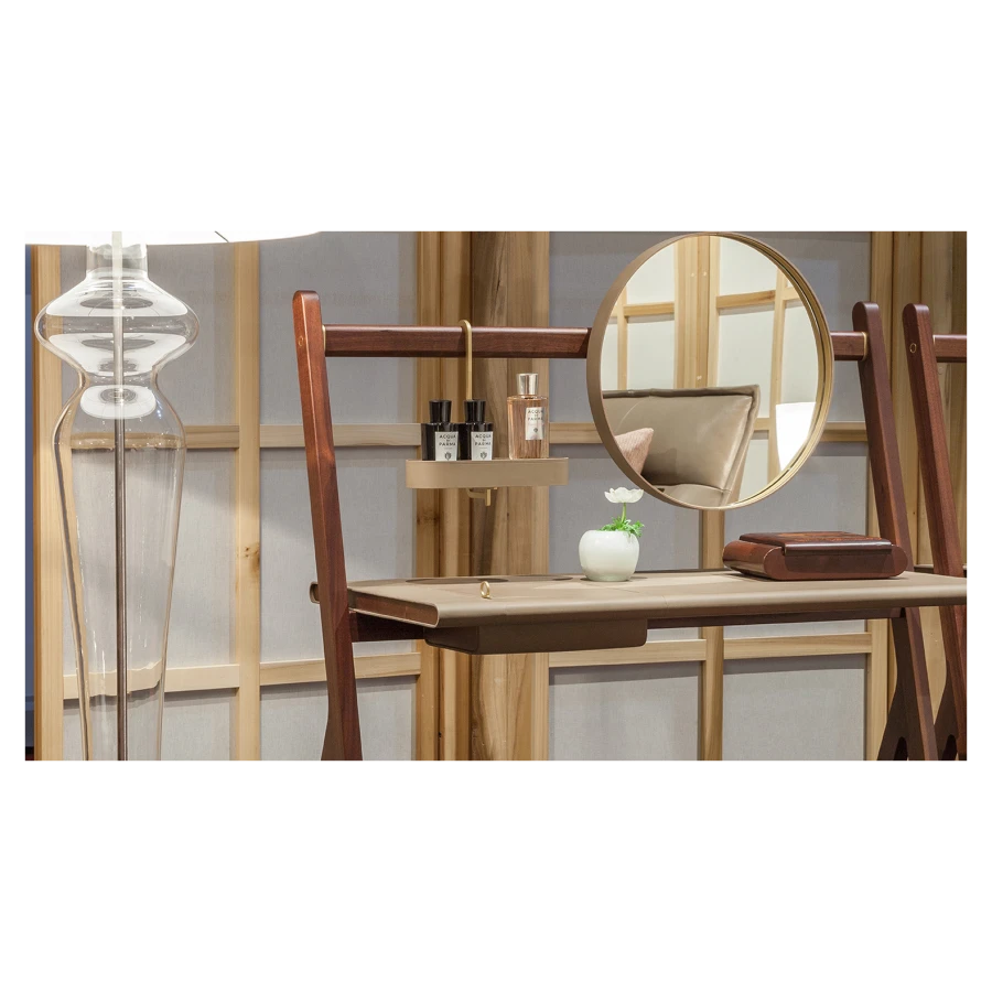 Ren, floor and wall mirror and mirror clothes rack, is part of the large collection designed by Neri & Hu for the entrance hall, the place where we welcome guests and offer them the first taste of our furnishing style. With their refined craftsmanship and versatile forms, the Ren floor and wall mirrors welcome visitors with true Poltrona Frau elegance but can also be used in other spaces: from the living room to the bedroom, from the bathroom to the study.