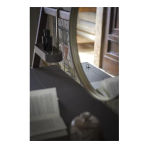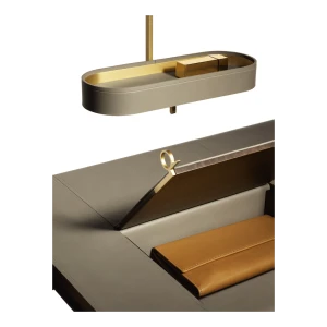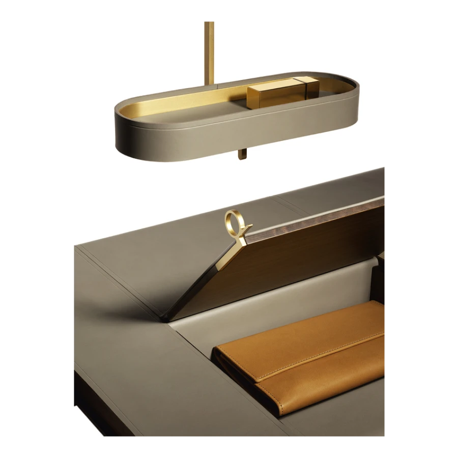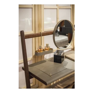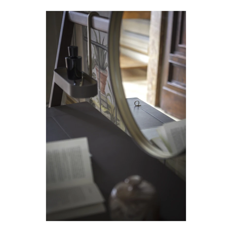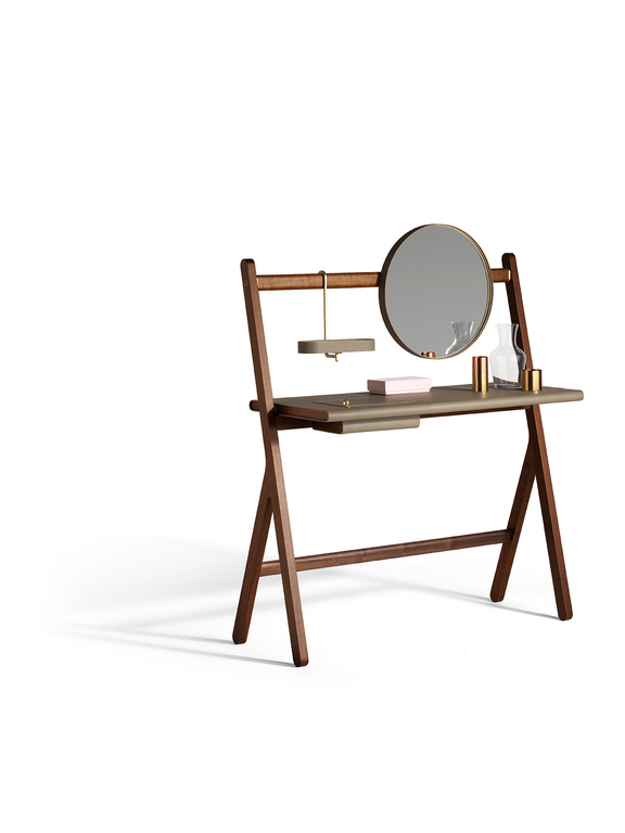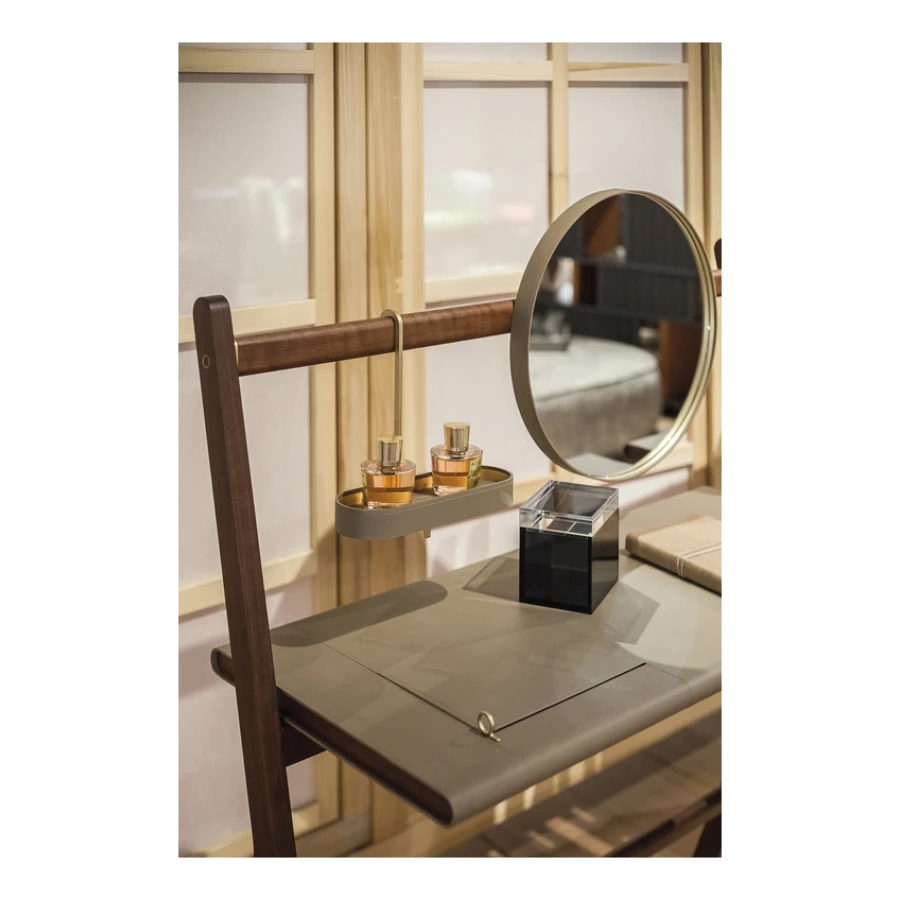 Designed to complete the home with a touch of discreet and comfortable style, the Ren mirrors are available in the Round mirror (Ø 430 mm) or Oval mirror (280 x 1200 mm) versions, also separately, and in the table version (Ø 310 mm). They have a brass frame covered with Saddle Extra leather while the back is in birch plywood with a Canaletto walnut veneer. The table mirror consists of a round mirror fixed to a supporting structure with a brushed steel hook with brass finish. The free-standing mirror clothes rack consists of an oval mirror, a low shelf and two hooks for hanging clothes. The wall-hung mirror clothes rack is composed of a Canaletto walnut bar to which a round mirror, a circular key tray and two hooks for hanging clothes are attached (wall-mounting system not included). The dressing table consists of a round mirror, an oval key tray and a table top with a second in-built compartment with lift-up top in Saddle Extra leather and ring-shaped brass handle. The bottom of the compartment is covered with a saddle-leather insert.