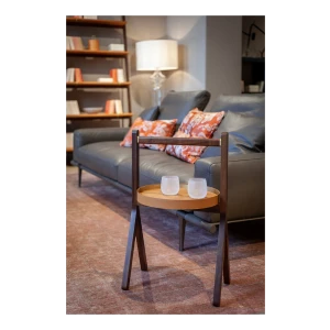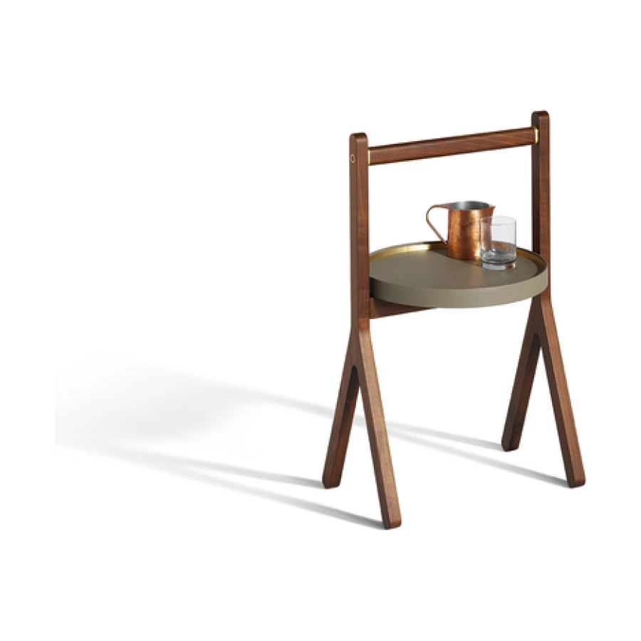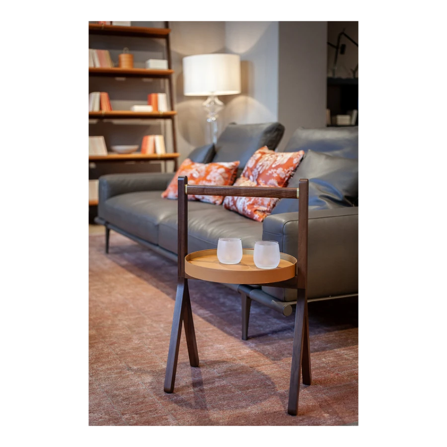 The Ren side table features a tray table with a birch plywood base in Canaletto walnut veneer and a curved frame in leather-upholstered brass. The base is upholstered with a mat in Saddle Extra leather.