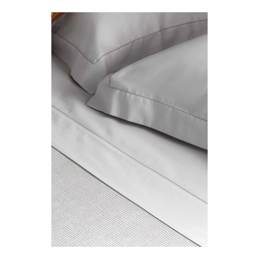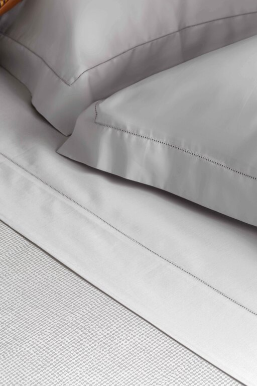 The best cotton satin for an unrivalled feeling of softness and silkiness. The Riomaggiore set of coordinated night accessories is made of 300-thread-count cotton, a perfect balance between dense weave and the lightness of the fabric. The prevalence of warp in the weave and the finishing with calendering give it a refined touch and a high lustre, a symbol of quality and luxury. In optical white, ivory and oyster, the top double-bed sheet features a 10 cm bracelet finished with a jour hem; detail taken from the pair of pillowcases, featuring four 6-cm ruffles finished with the same continuous hem. The double-sided double-bed duvet cover displays a sober tone-on-tone diamond pattern on the side of the fine jacquard fabric, which recalls the motif of Ligurian floors, in reference to the territory that inspired the collection. The lower side of the duvet cover, made with 45 cm flaps on the bottom, is instead in plain satin, simpler but equally precious and bright. Riomaggiore is a bed linen that offers excellent temperature regulation: soft and enveloping in the cold seasons, fresh and light on the skin when temperatures rise.
