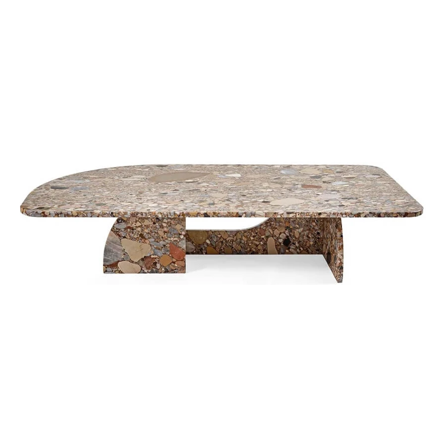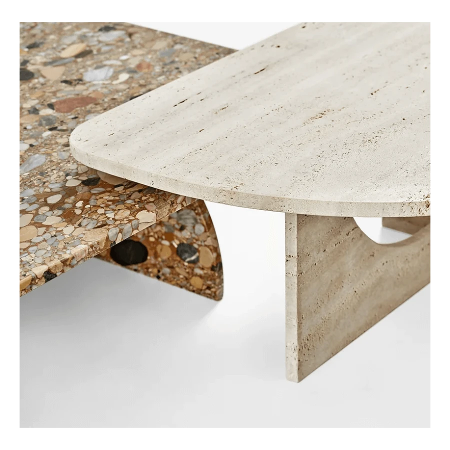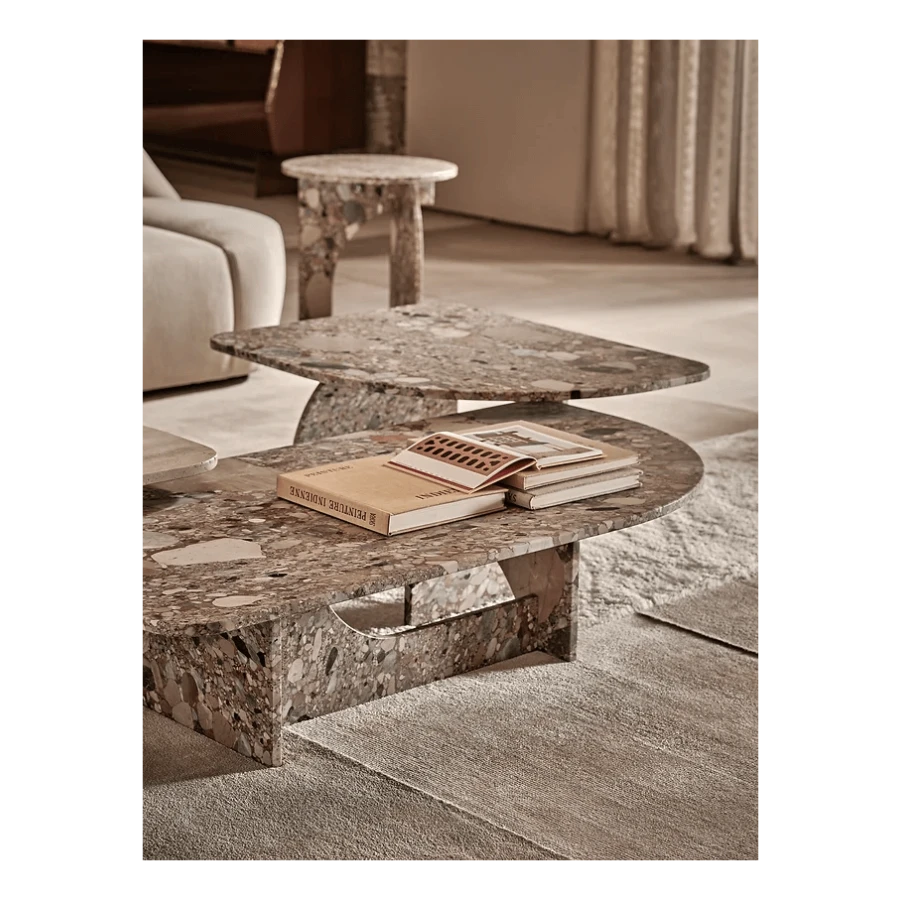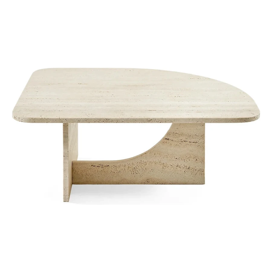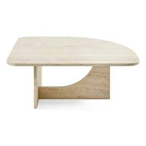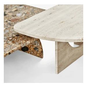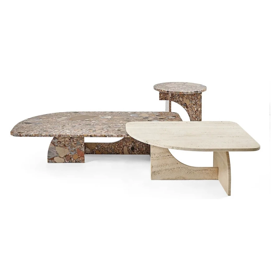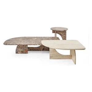 Coffee table in stone. Available in “Ceppo dei Volpi” or “Ceppo Antico”. On request also available in natural brushed Travertino Romano (not treated with resin). Right or left version (A and C) to be specified when ordering.
