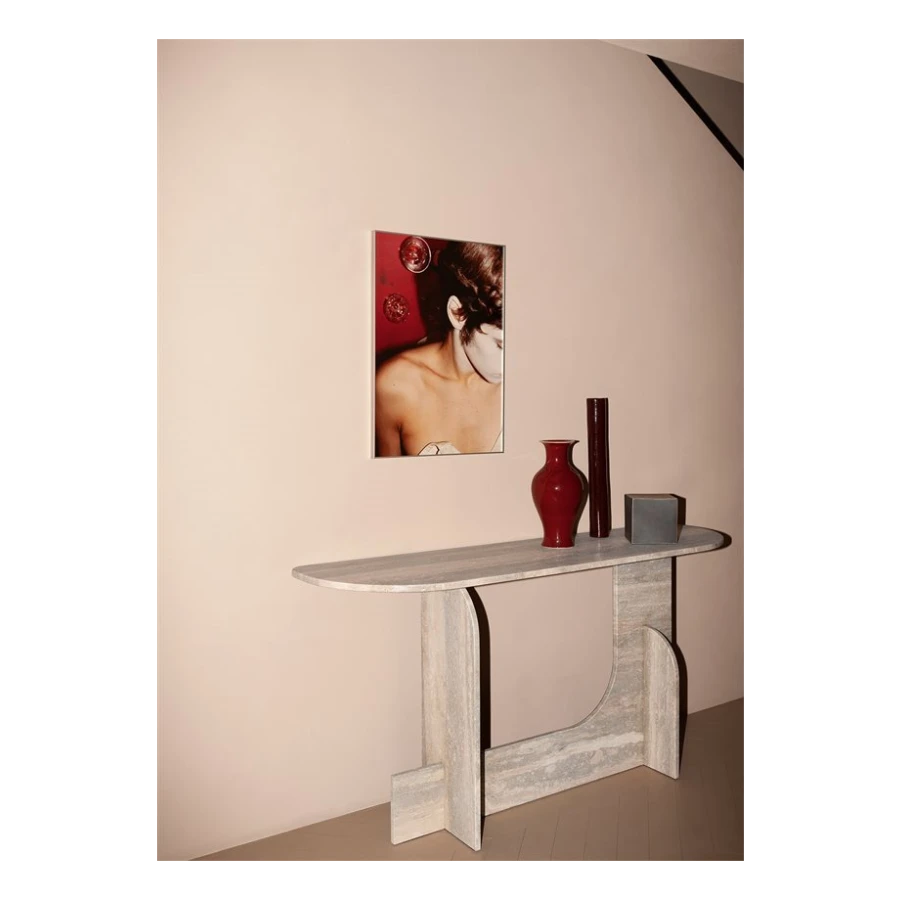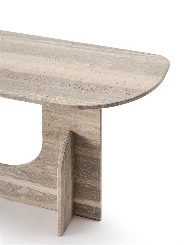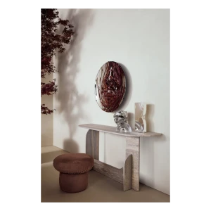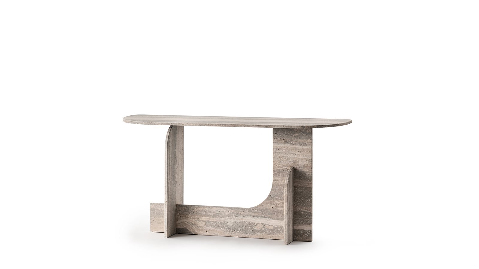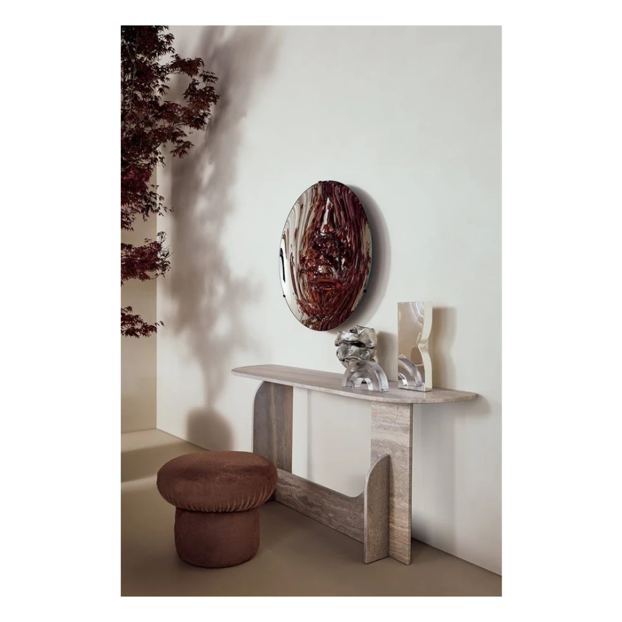 Console in stone. Available in “Ceppo dei Volpi”, “Ceppo Antico”, natural brushed Travertino Silver (not treated with resin) or satin Arabescato Orobico Rosso marble. “Fango” lacquered metal parts. Wall positioning recommended.