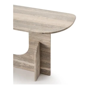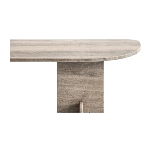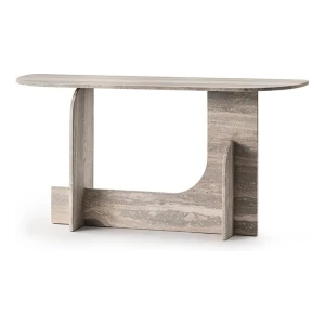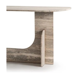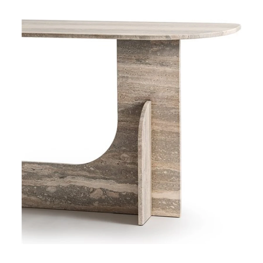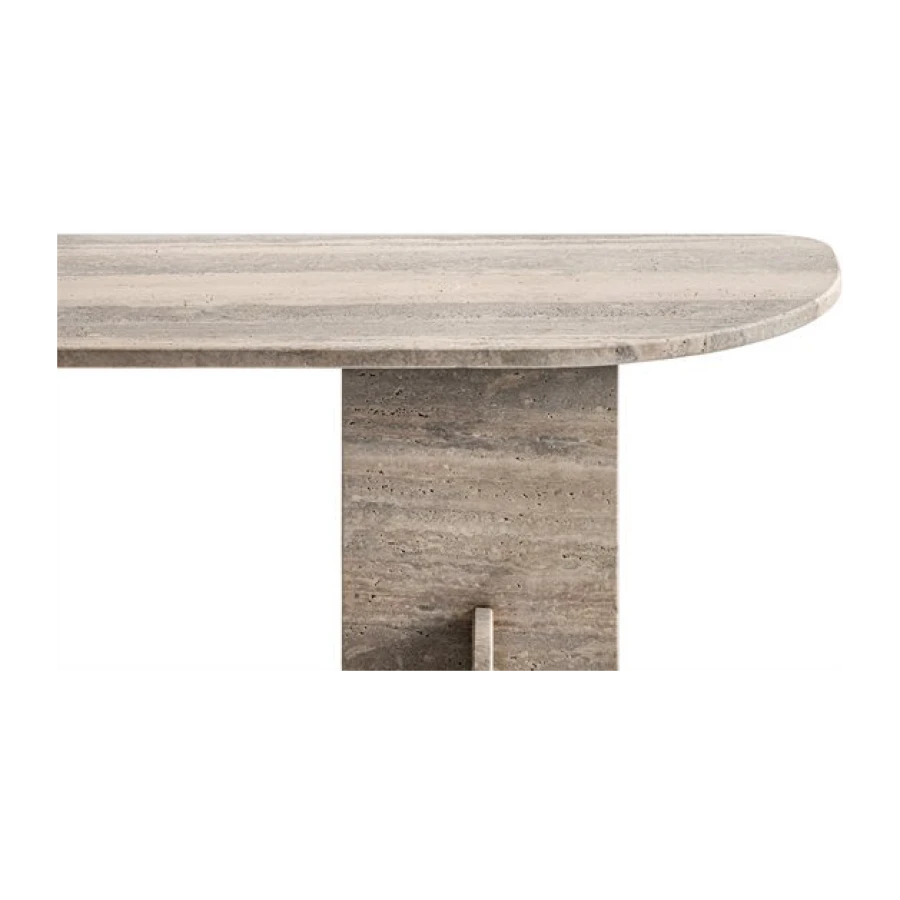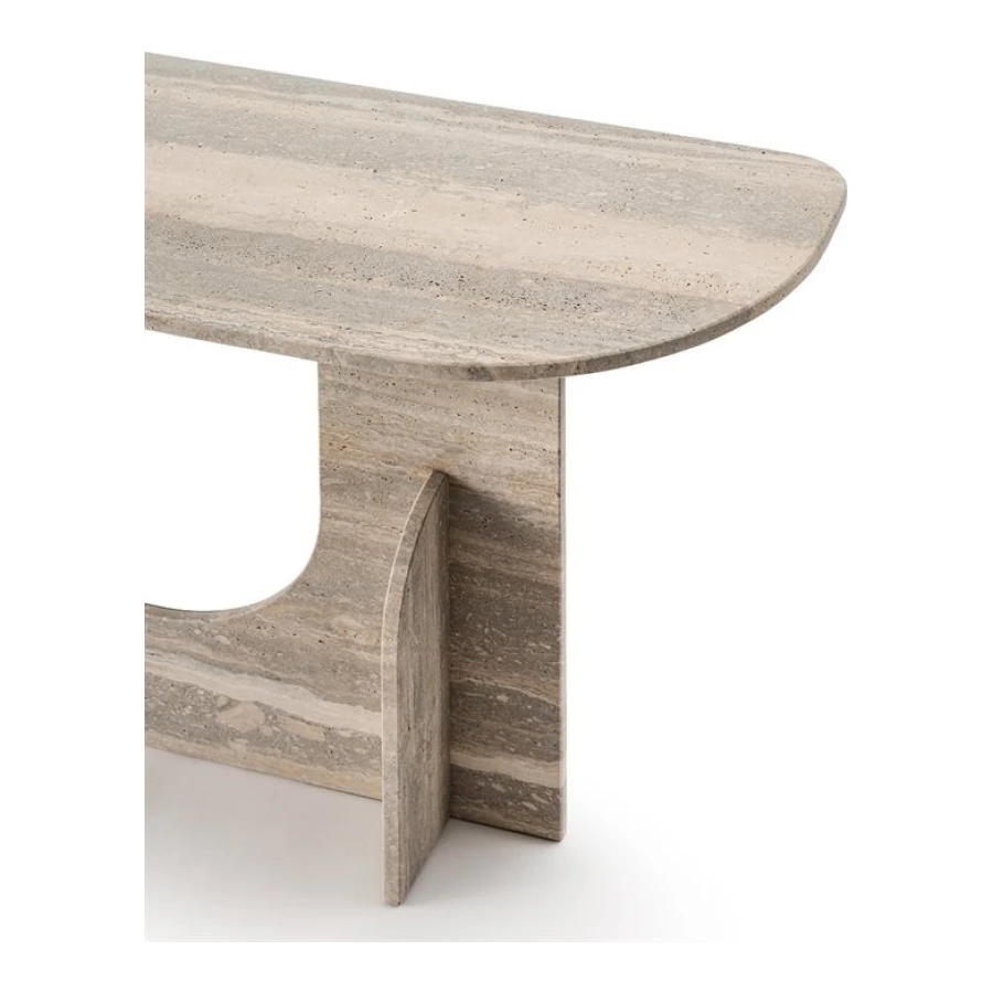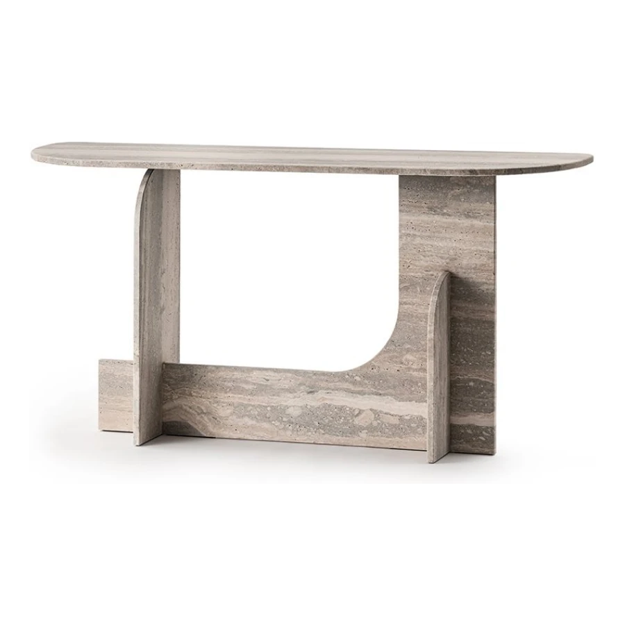Console in stone. Available in “Ceppo dei Volpi”, “Ceppo Antico”, natural brushed Travertino Silver (not treated with resin) or satin Arabescato Orobico Rosso marble. “Fango” lacquered metal parts. Wall positioning recommended.