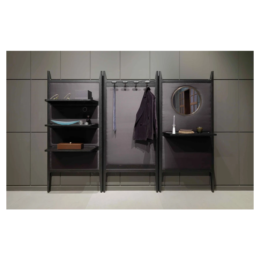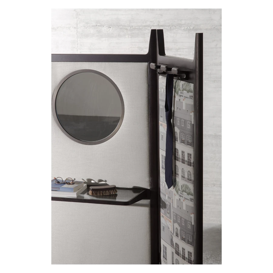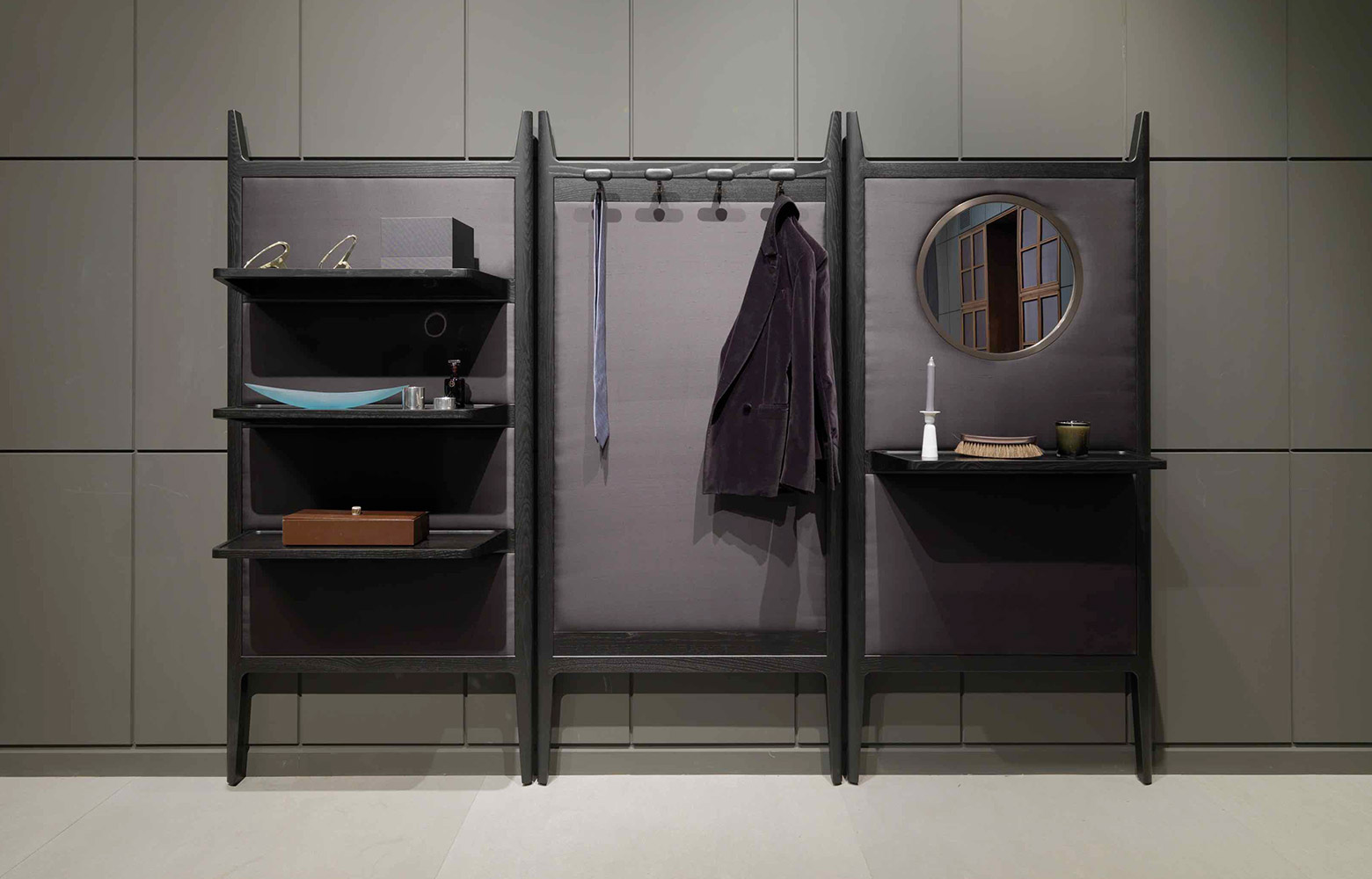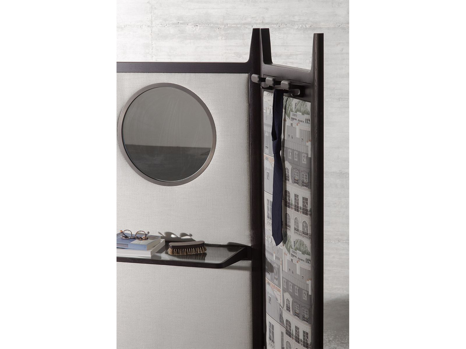 The modules are available in two heights and two widths. They can be accessorised with clothes hangers, shelves and mirrors to add functionality and flexibility. The possibility of organising the panels into linear structures but also into complex and articulated geometries makes Set a genuinely multi-faceted product. At home it can be used to separate two areas, for example the dining room from the living room. Alternatively, it can be used to creatively cordon off the entrance, and with two or three panels it is possible to create little boudoirs in the bedroom. Large spaces have different requirements. Long linear panels can be used to indicate paths and more structured compositions are also possible, perhaps creating sequences of exclusive spaces for private gatherings or business meetings. One of the key features of the project is the use of fabric. The panels are padded with thin slabs of foam but it is through the choice of fabric that these accessories can be personalised and given an exclusive touch. The colour and texture of the materials enhance the expressiveness and communicative power of the product and the large surfaces of the panels lend themselves to high-impact colour solutions.
