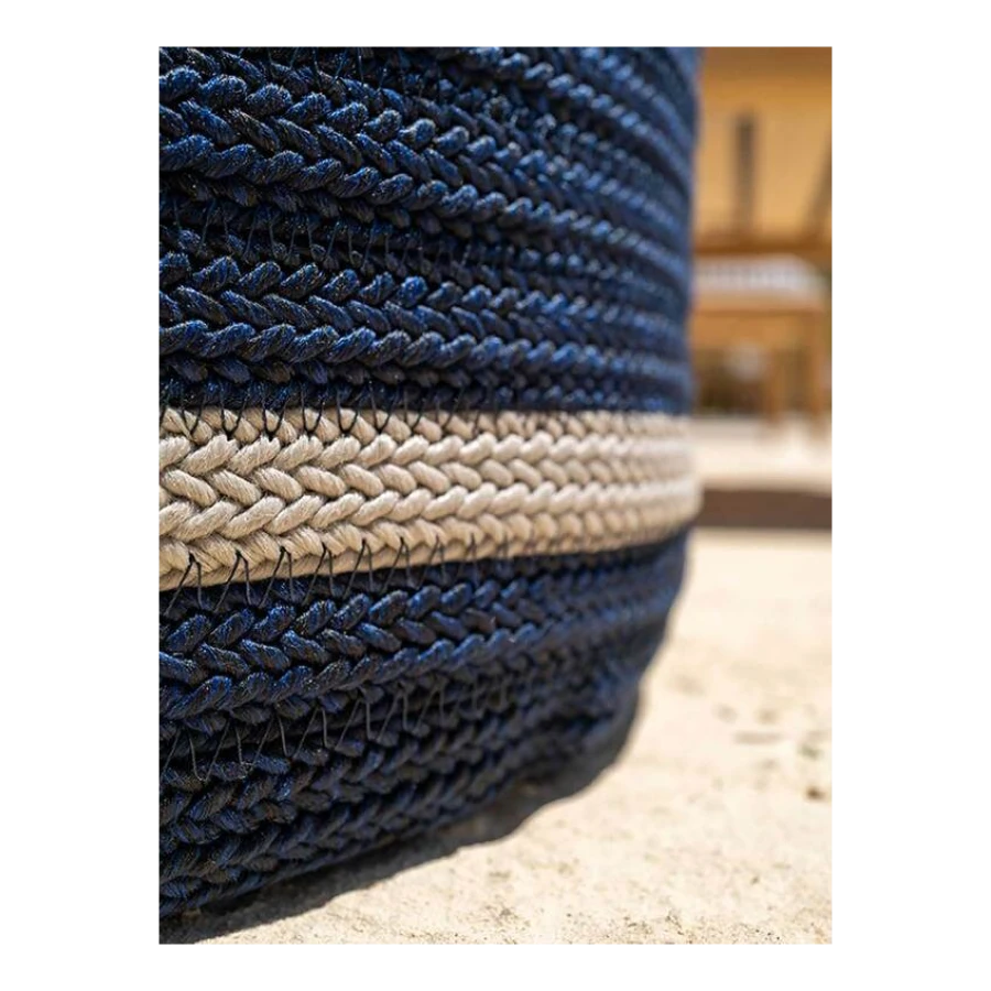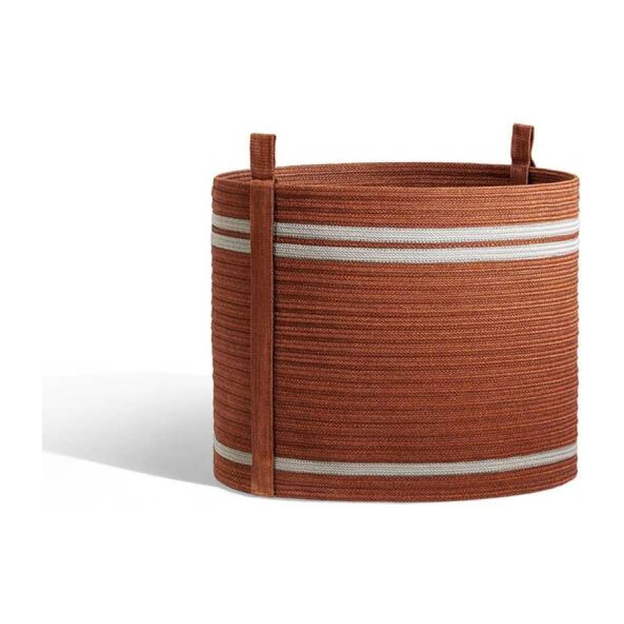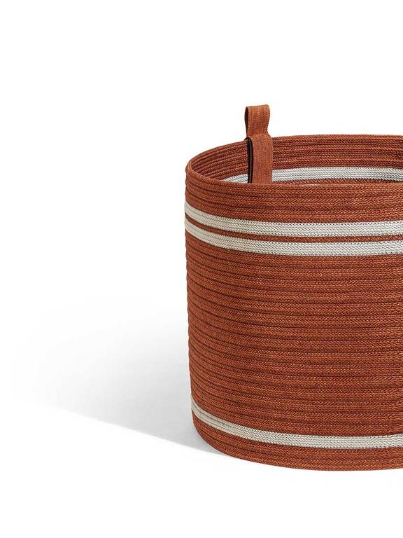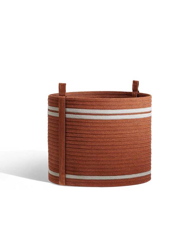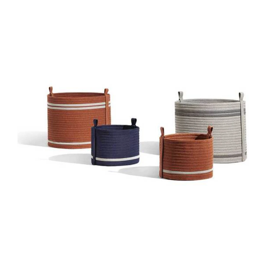 A touch of colour to personalise indoor and outdoor spaces and carefully store your items and accessories. The Sherazade outdoor baskets, designed by Simona Cremascoli, are made from a polypropylene braid sewn together. Combined with the outdoor rug of the same name, the baskets come with two fabric handles and are available in two sizes: the large basket is perfect for holding pots and plants, while the small basket is designed to hold cushions, blankets and accessories. Three shades to choose from: ecru, blue and rust. In hard-wearing, weather-resistant outdoor fabrics, they are part of Poltrona Frau’s Boundless Living Outdoor Collections.