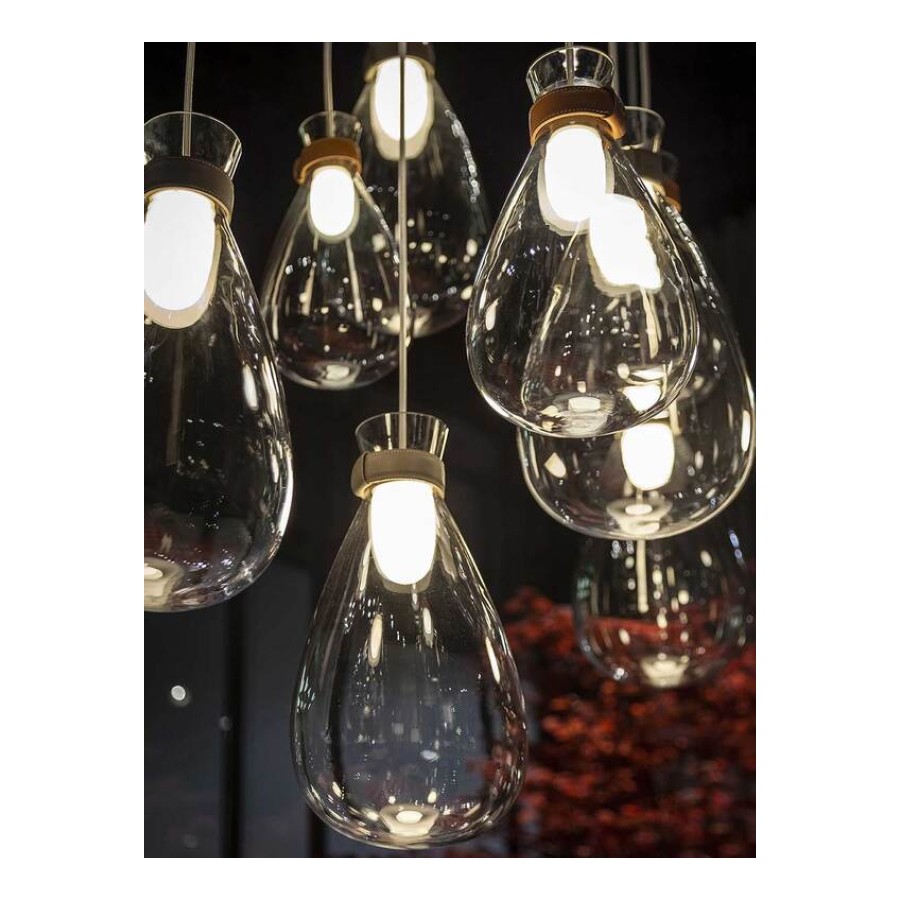 GamFratesi’s minimalist design captures the exact moment in which the blowing technique gives the glass its form. Delicate and irregular globes seem to emerge from a slim saddle-leather strap, suspended in space by gravity.