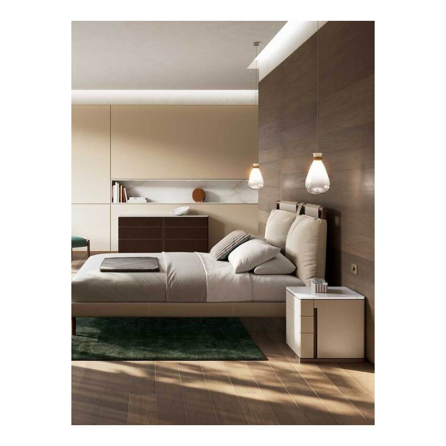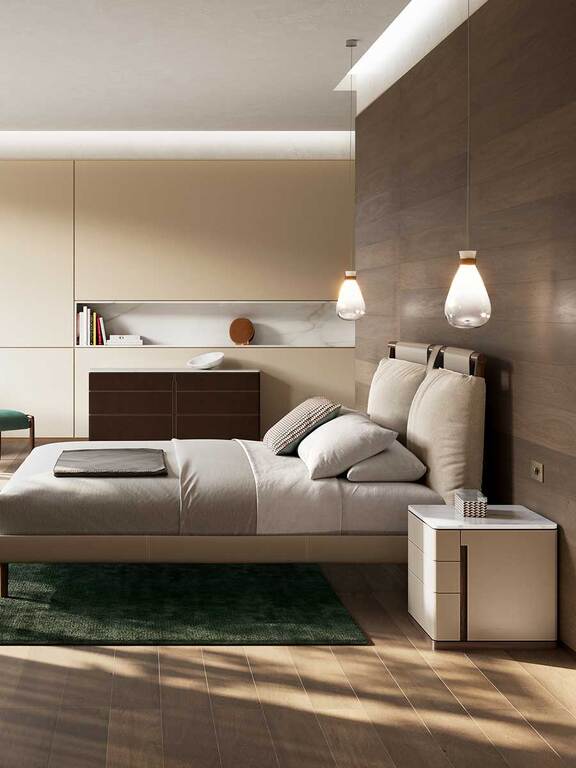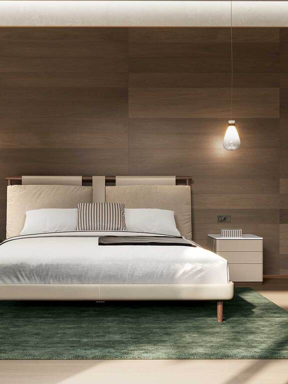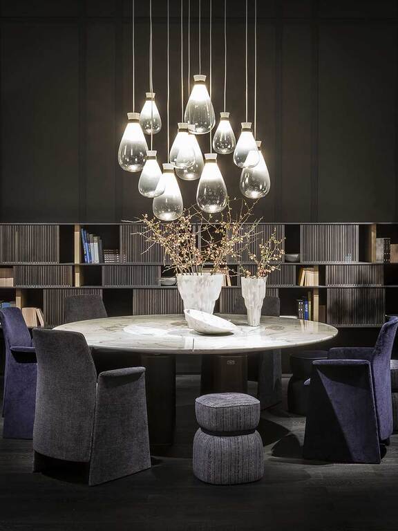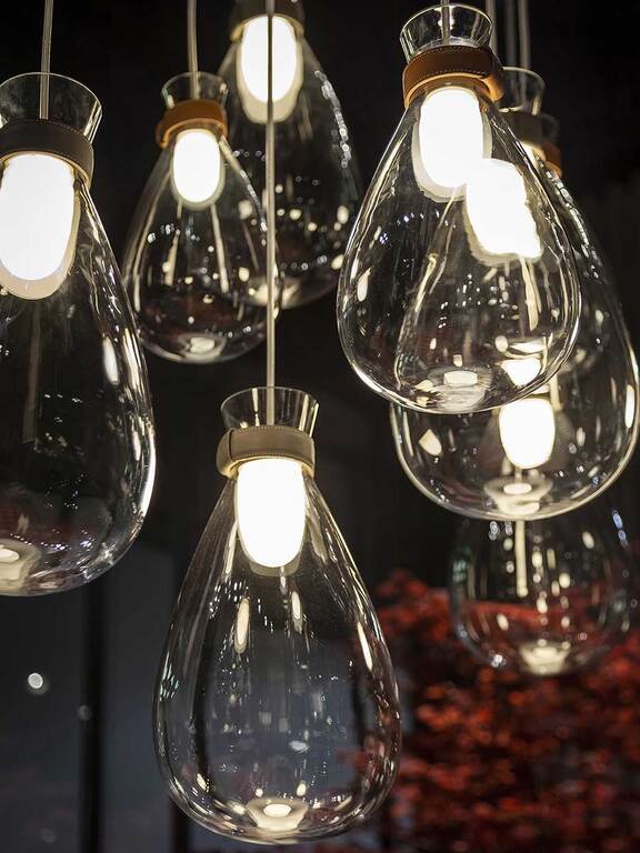 The Soffi collection includes three sizes of lights, small, medium and large, which can be combined in different configurations. As well as the single lamps, linear compositions with three globes and bunch compositions with three or five globes. There are two chandelier compositions: the first consists of two concentric rings of different diameters, covered in Saddle Extra leather, which accommodate nine medium-sized lights, six on the larger ring and three on the smaller inner ring. The eighteen-globe chandelier composition consists of three concentric rings of different diameters, covered in Saddle Extra leather and positioned at different and customisable heights. Hanging from these are eighteen medium-size lights, nine on the larger ring, six on the medium ring and three on the smaller ring.