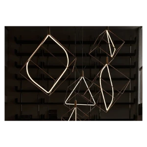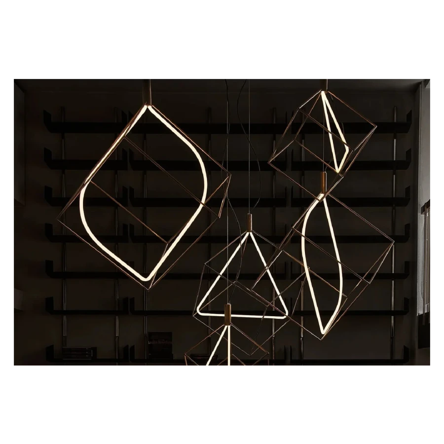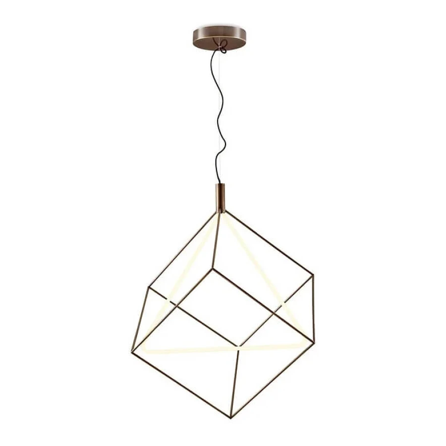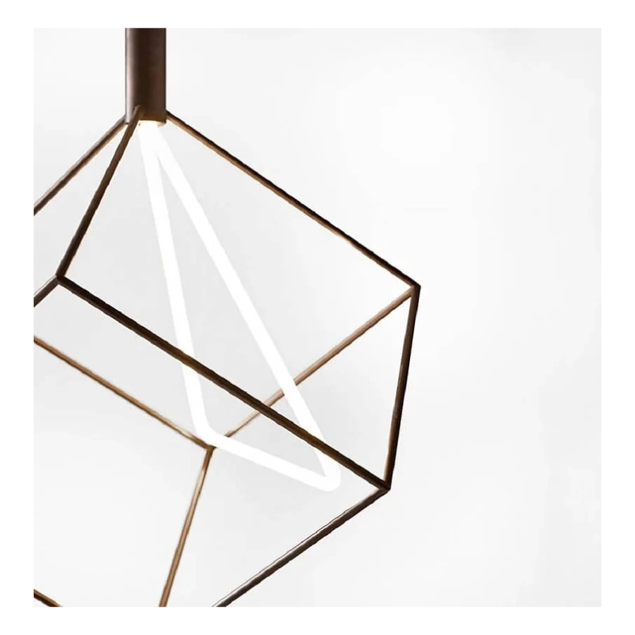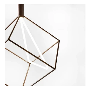 Hanging lamp with NEON light (dimmable). Light source in hot-bent NEON.Hand burnished brass structure. This finish looks naturally spotted and irregular. Due to this craftmade processing, each product is unique and exclusive. Supplied with cable 4 meters long. Available in two dimensions and two different configurations of the NEON.